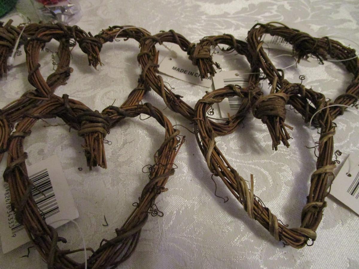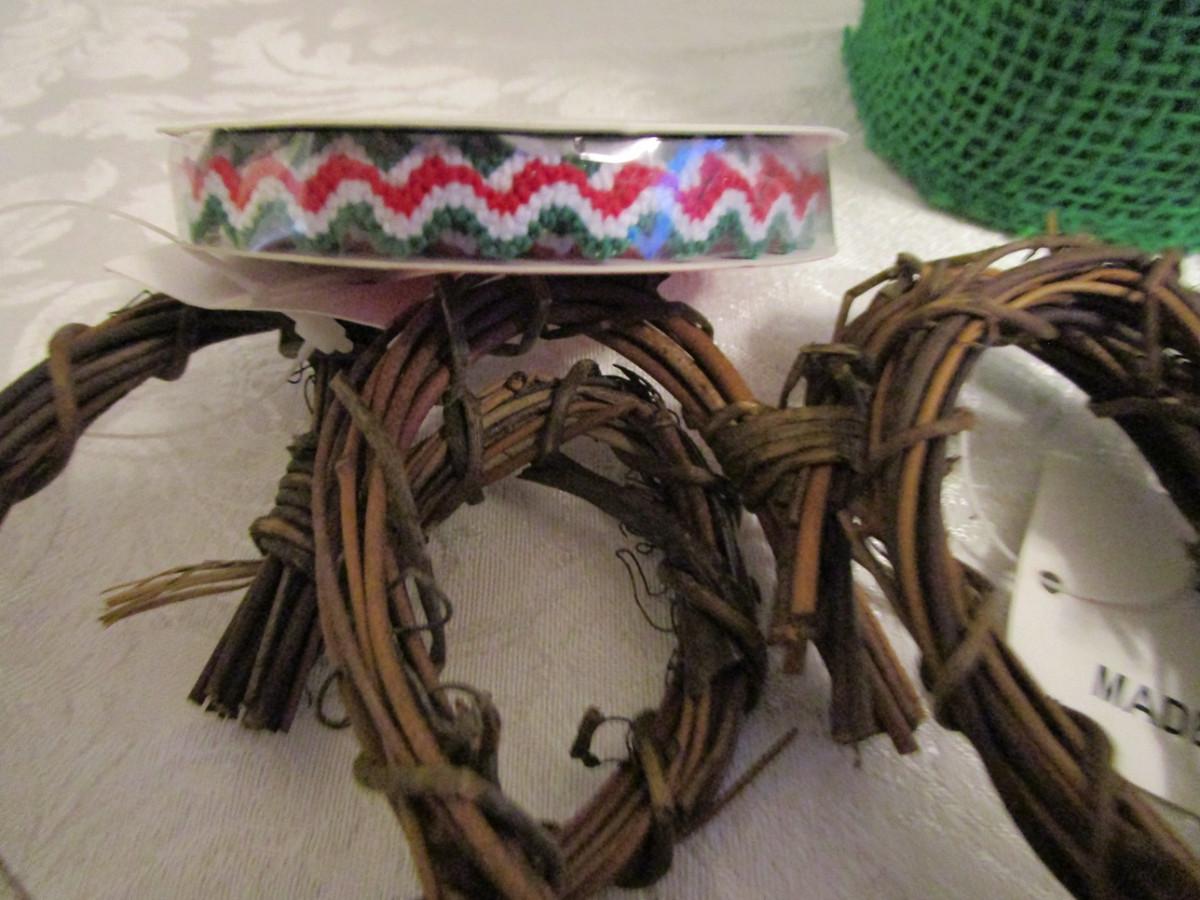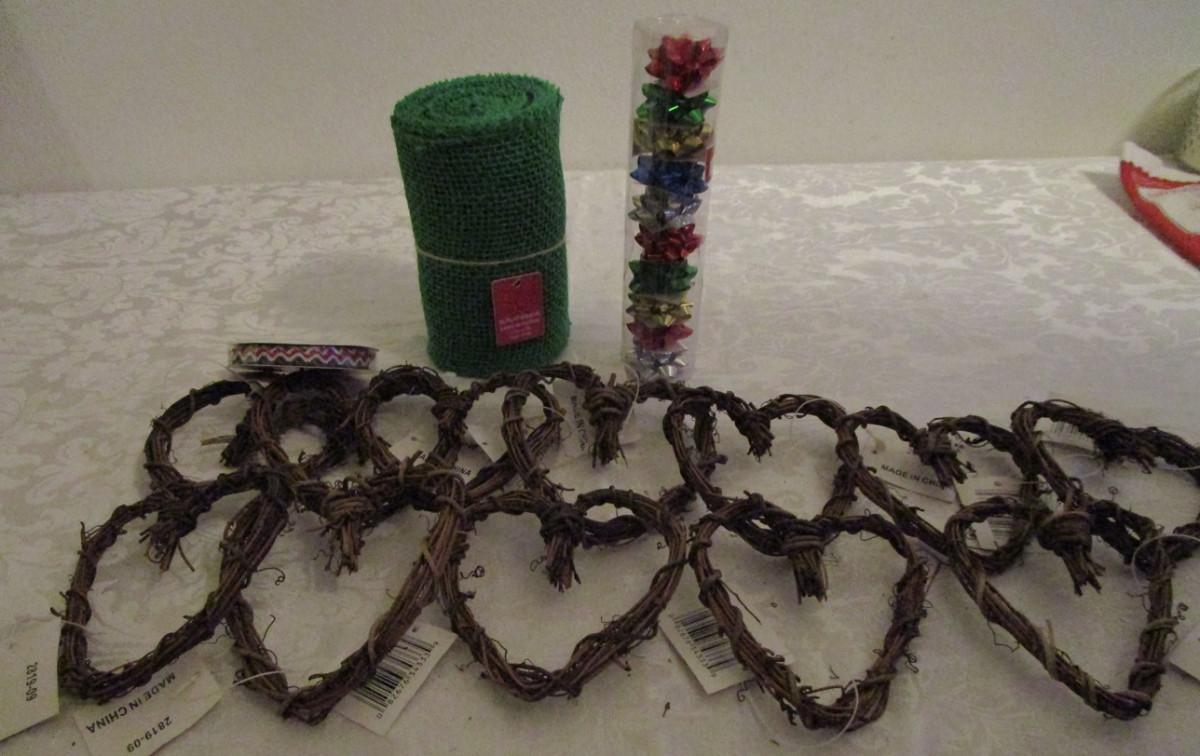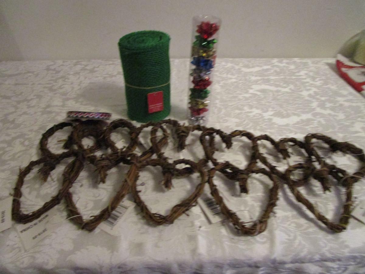 12 Mini grapevine wreaths-heart-shaped, 3 yd x  1-1/4" red, white & blue ribbon, 15' x 5-1/2" green burlap ribbon, pk of 10 mini bows