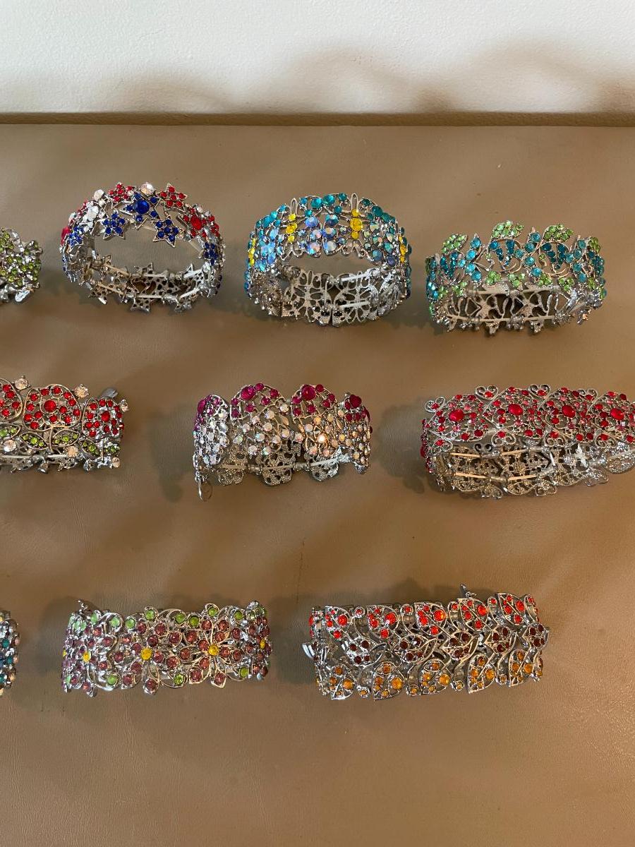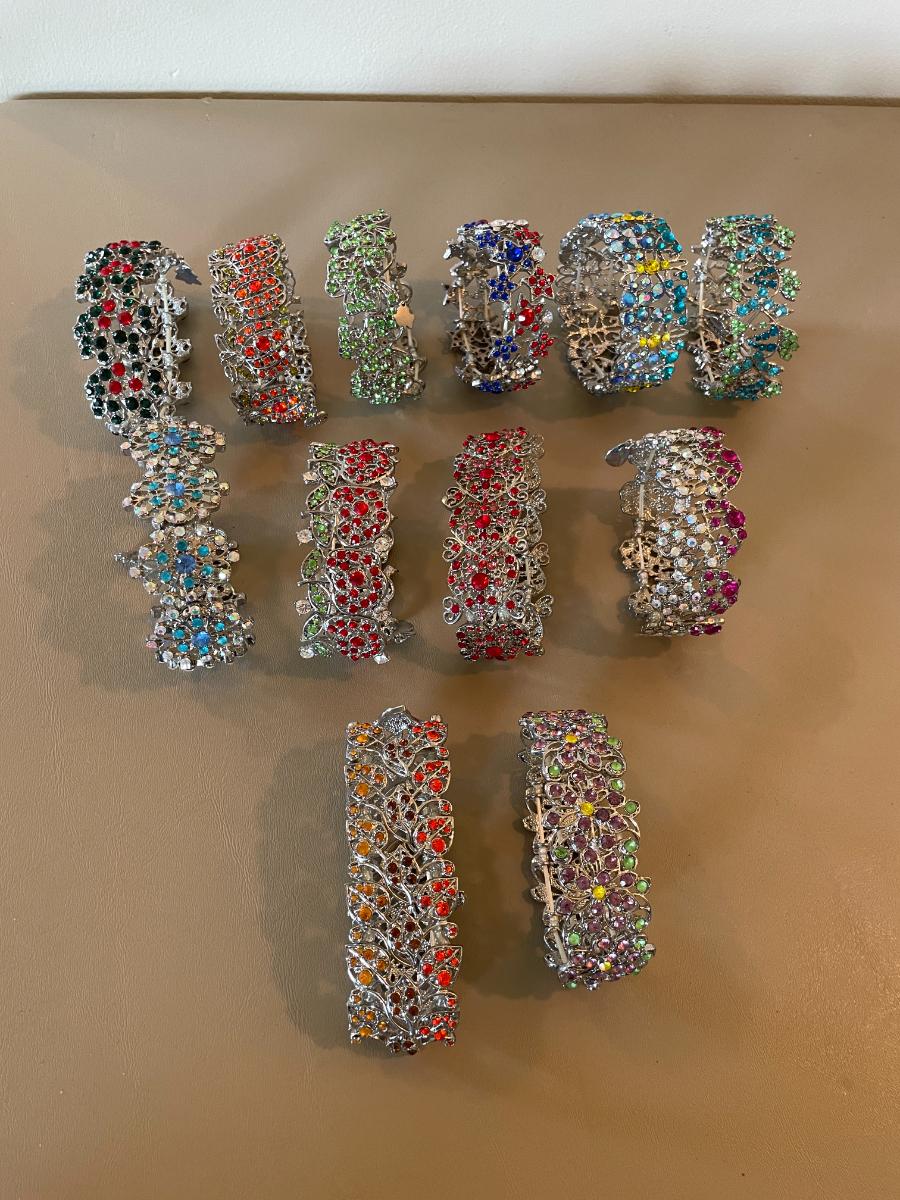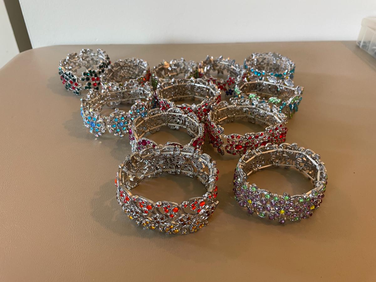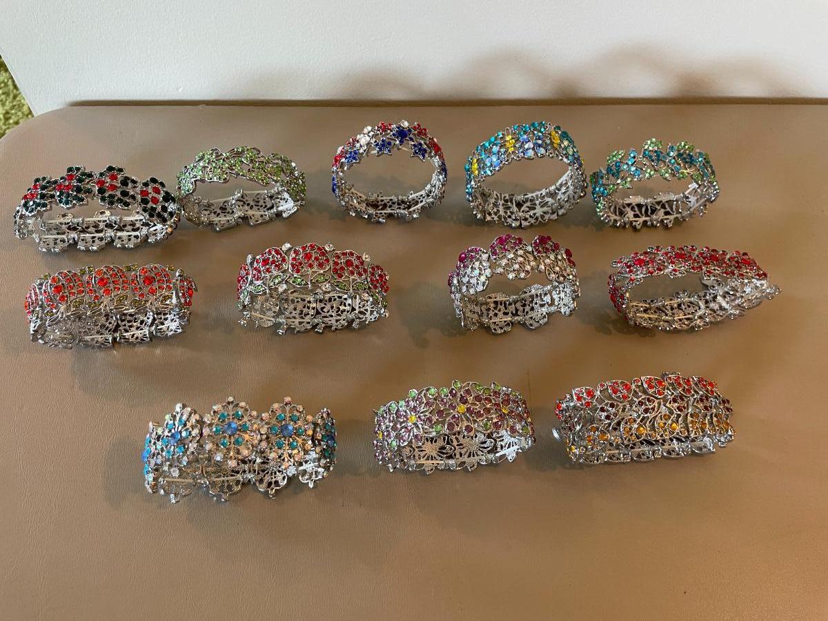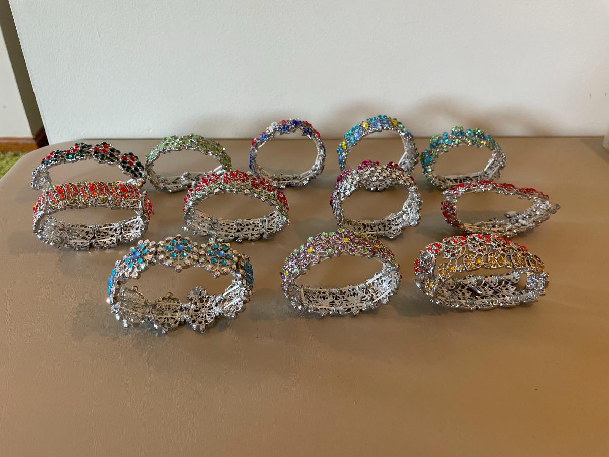 12 stretch bracelets featuring multicolor rhinestones. Each bracelet is crafted from a silver-tone base with detailed rhinestone accents in vibrant hues such as red, blue, green, and yellow. The stretch design allows for easy wear and a comfortable fit. Suitable for various occasions or as a collection. Appears in good condition with no visible damage.