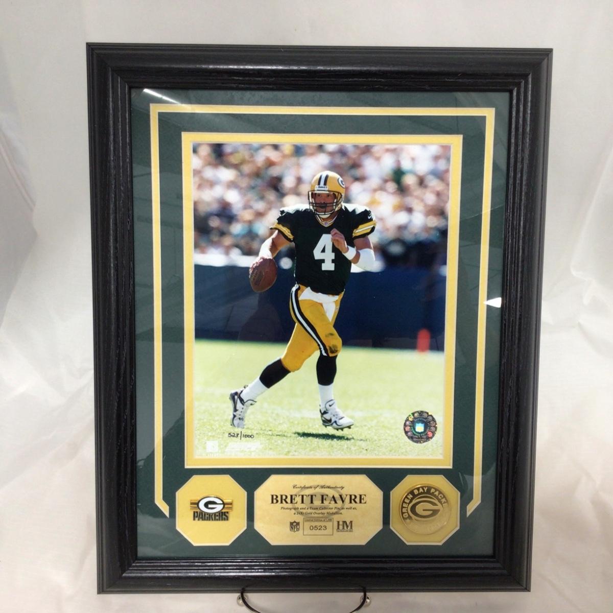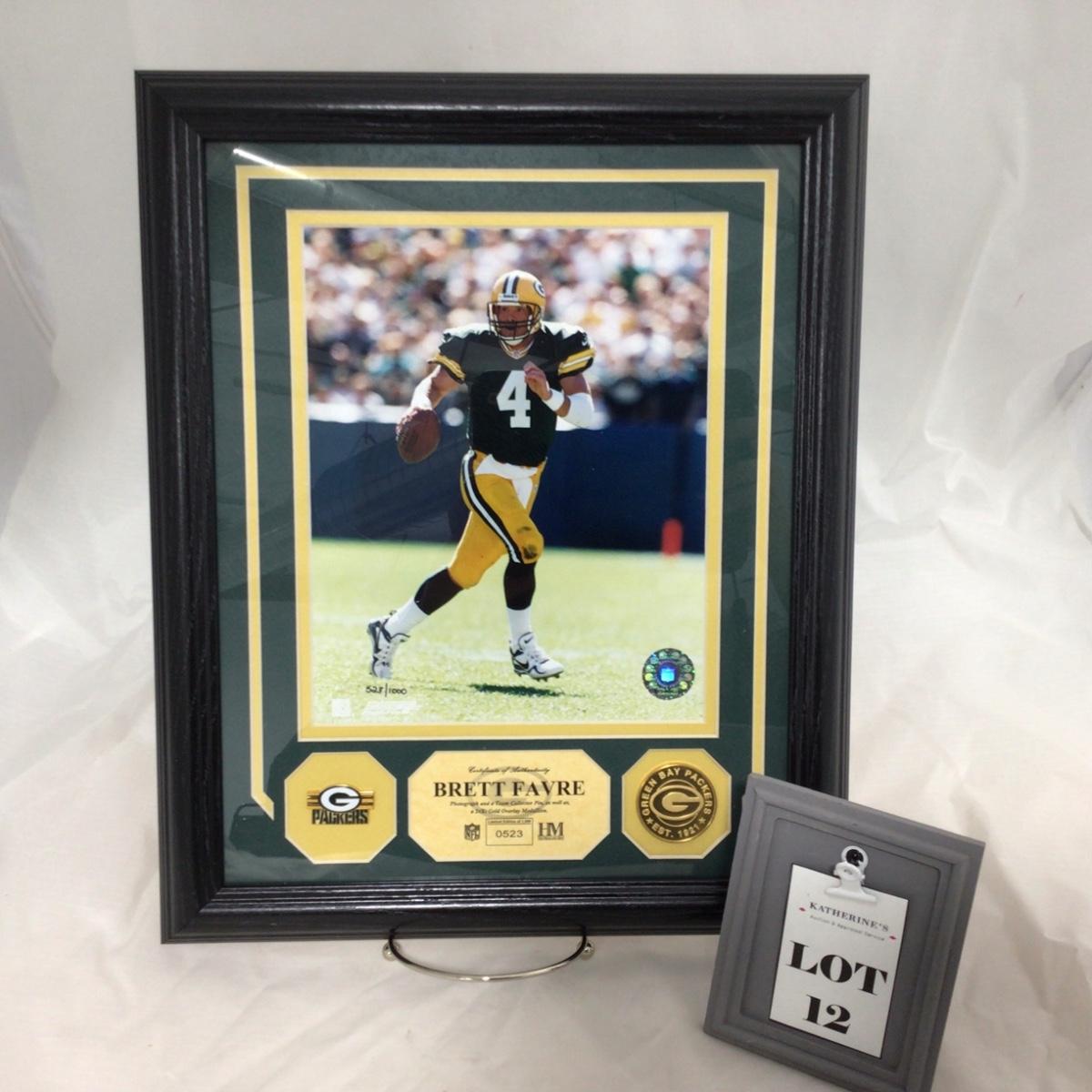 Brett Farve framed photograph, team collector pin, and 24kt gold overlay medallion numbered 0523 with certificate of authenticity. 13 inches by 16 inches. Please see photos for details and condition. ::: Shipping is available on this lot. If you require shipping you must let us know at the close of the auction. We will coordinate with you after the item has been won. Shipping fees will include insurance up to or exceeding the value of all items being mailed. If you have any questions regarding this lot please contact the auctioneer either via this website, by direct email or by phone. PICK UP TIMES and other important information can be found in the TERMS and DESCRIPTION of the auction. Please take a look for pertinent information. Thanks!