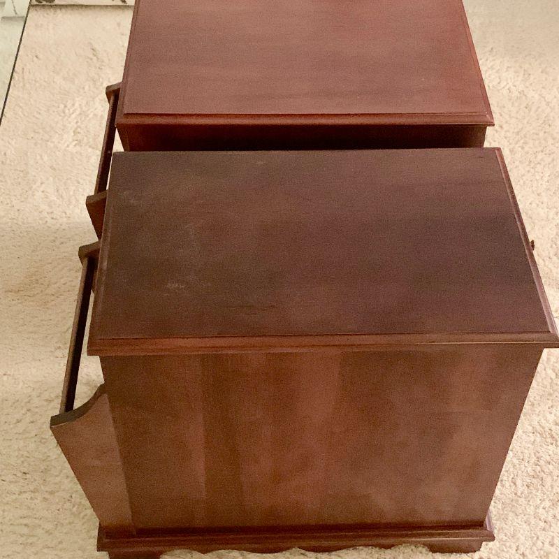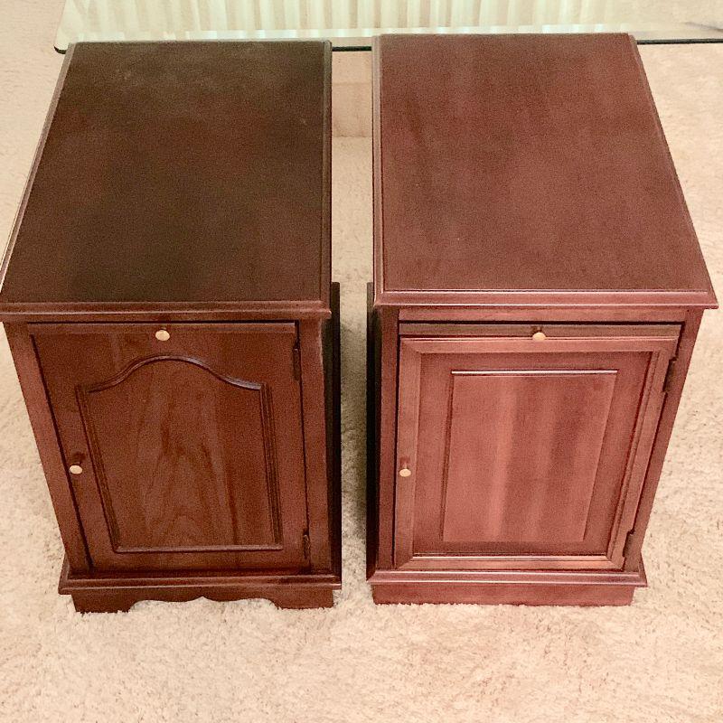 Pair of side cabinets, slightly different in color & design. Both have a magazine rack on the back side. Approximate size is 13"W x 22"D x 19 3/4"H