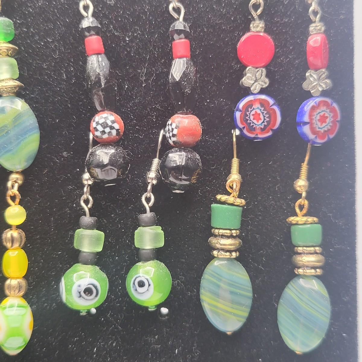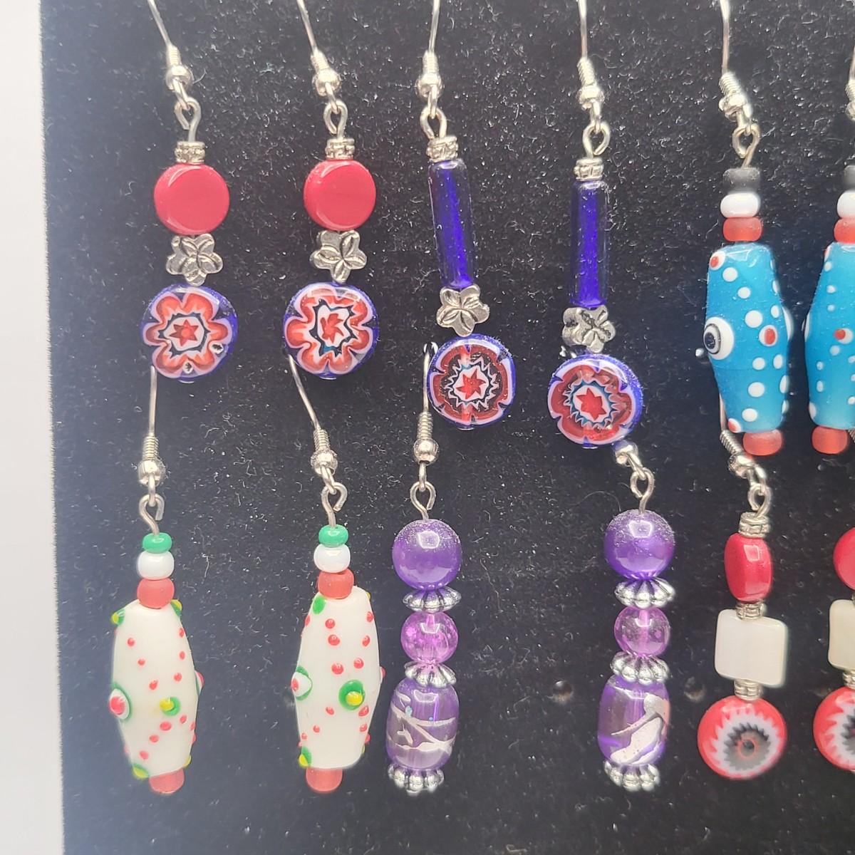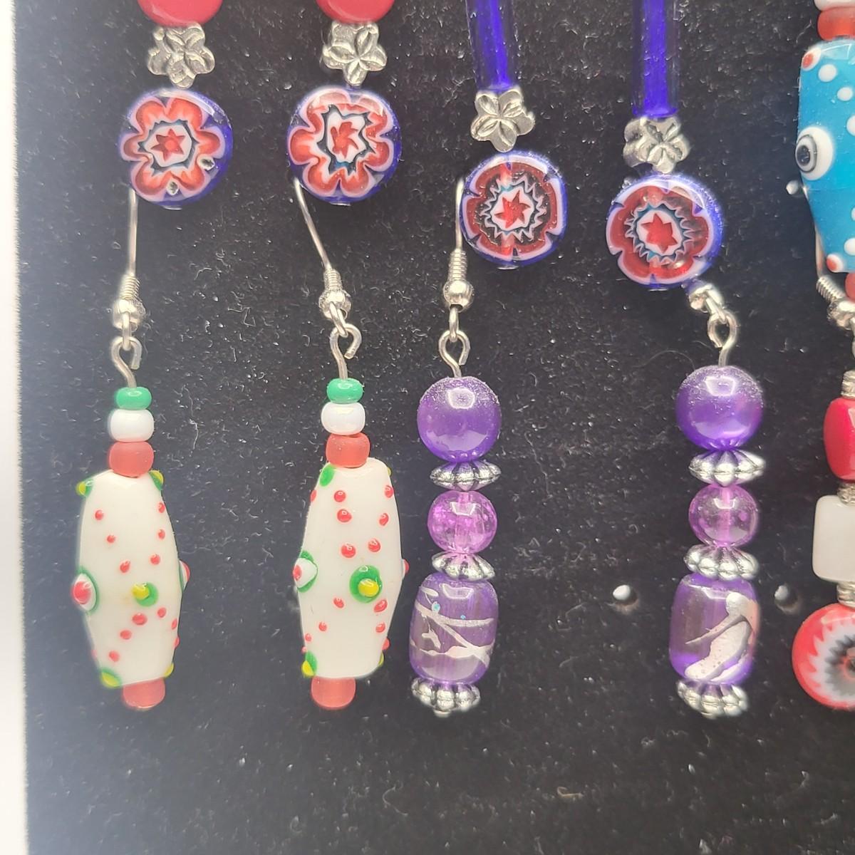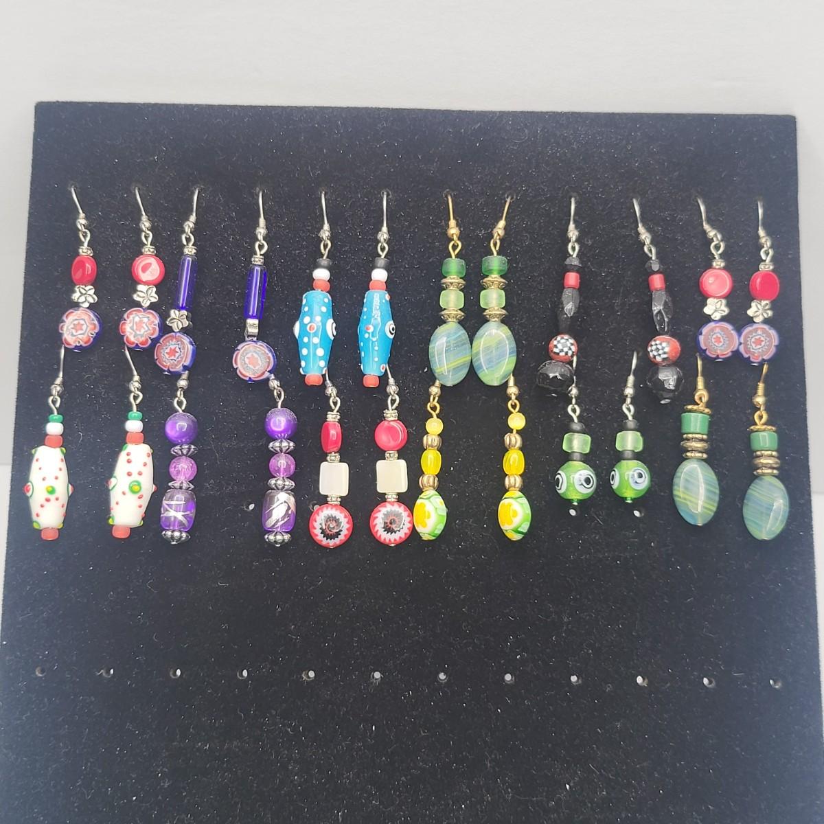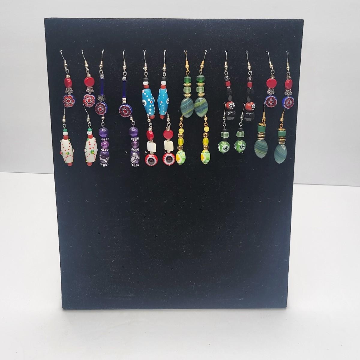 12 Pairs Handmade Art Glass Bead Earrings & Display Stand