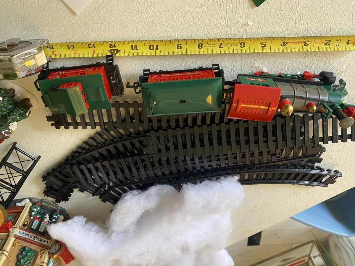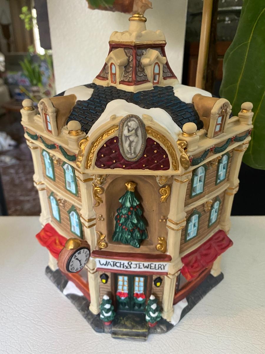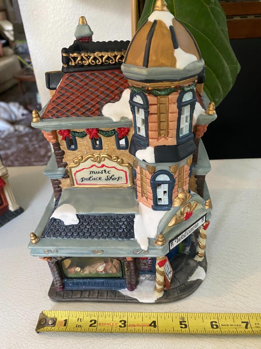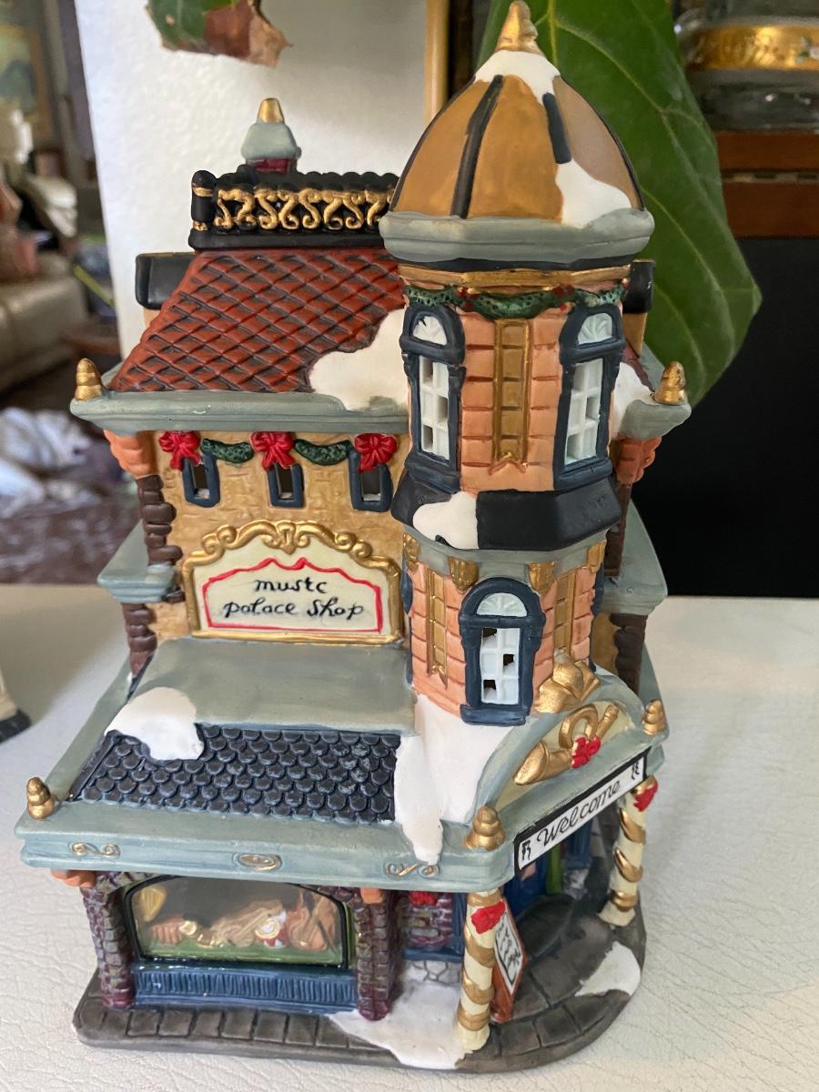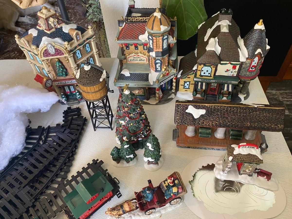 Merry Christmas building, music palace shop, water tower, watch repair and train set with tracks and snow accessories. Please note: no original boxes.