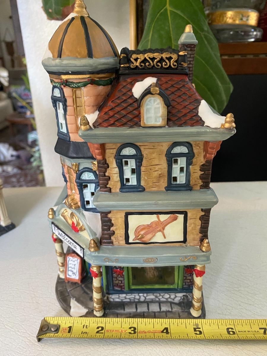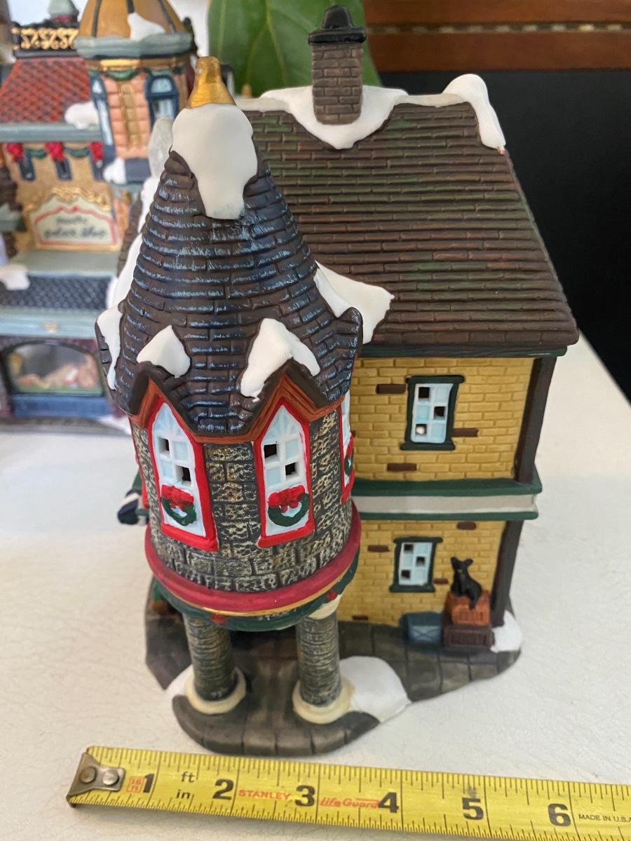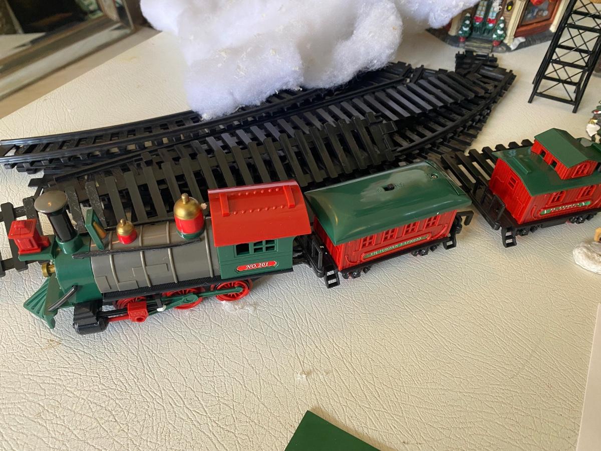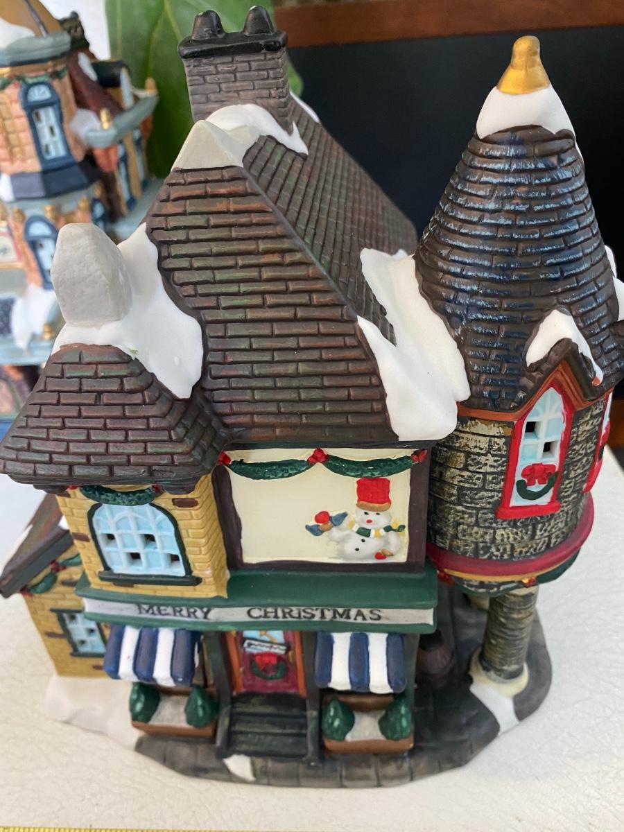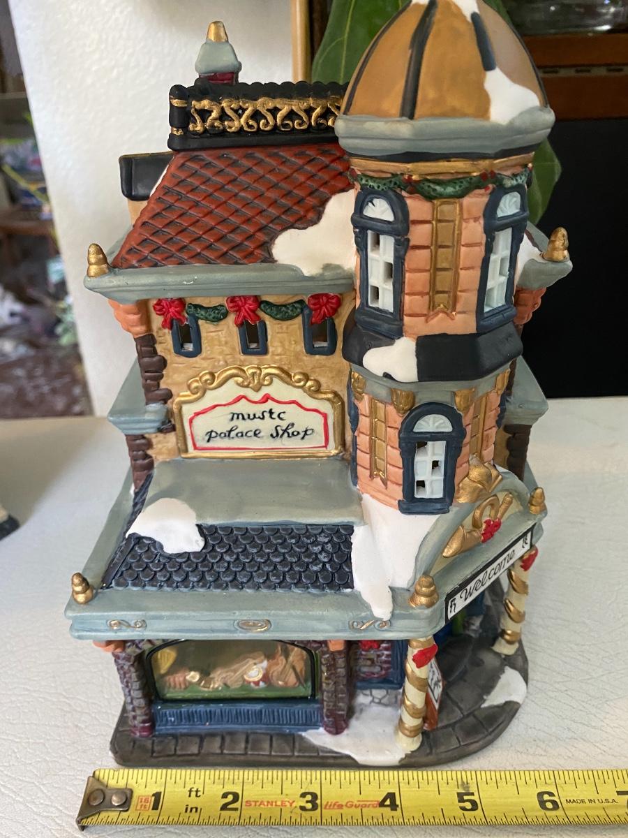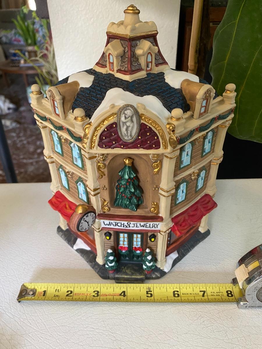 Merry Christmas building, music palace shop, water tower, watch repair and train set with tracks and snow accessories. Please note: no original boxes.