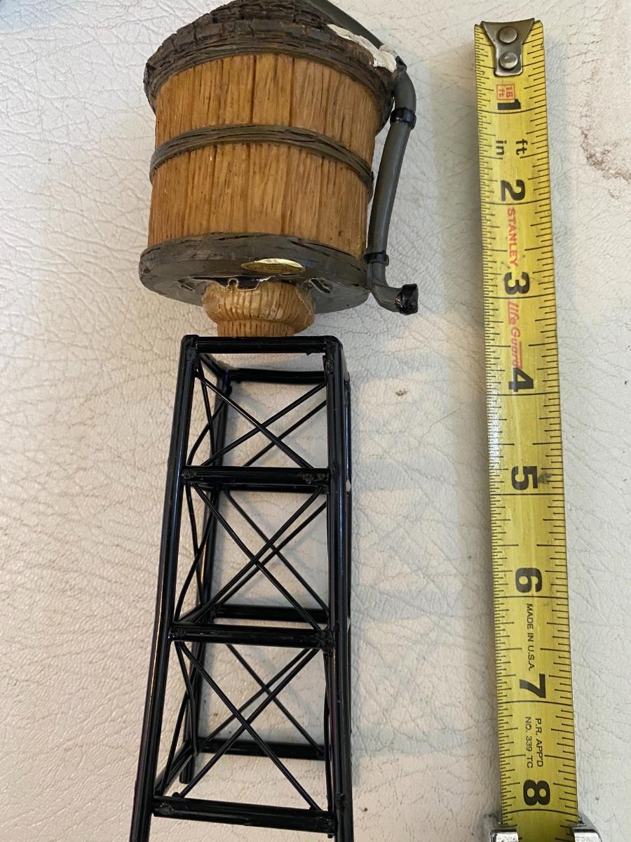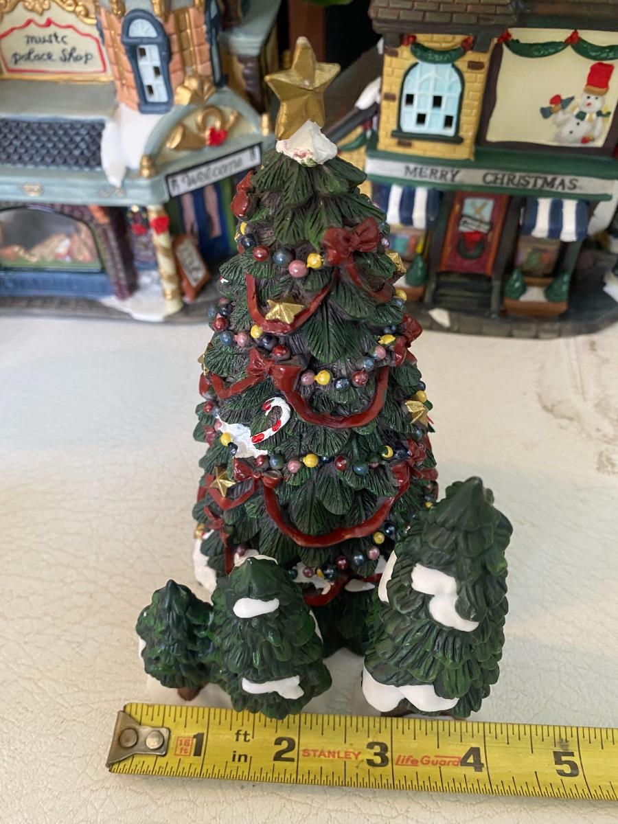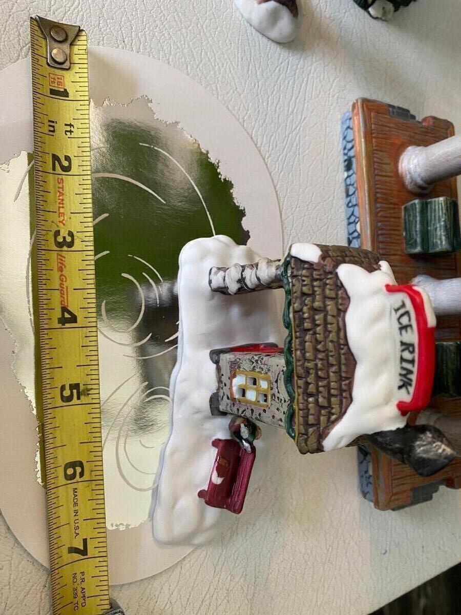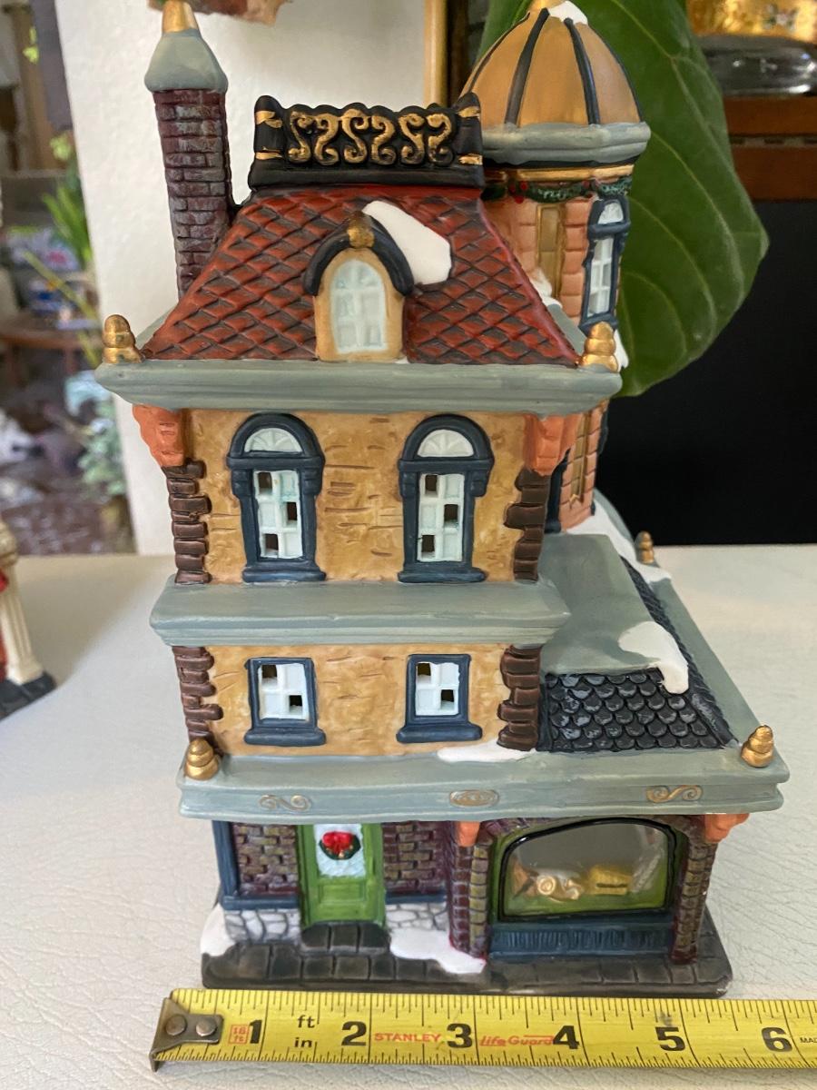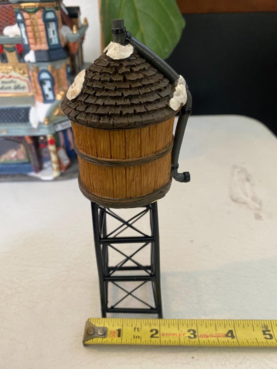 Merry Christmas building, music palace shop, water tower, watch repair and train set with tracks and snow accessories. Please note: no original boxes.