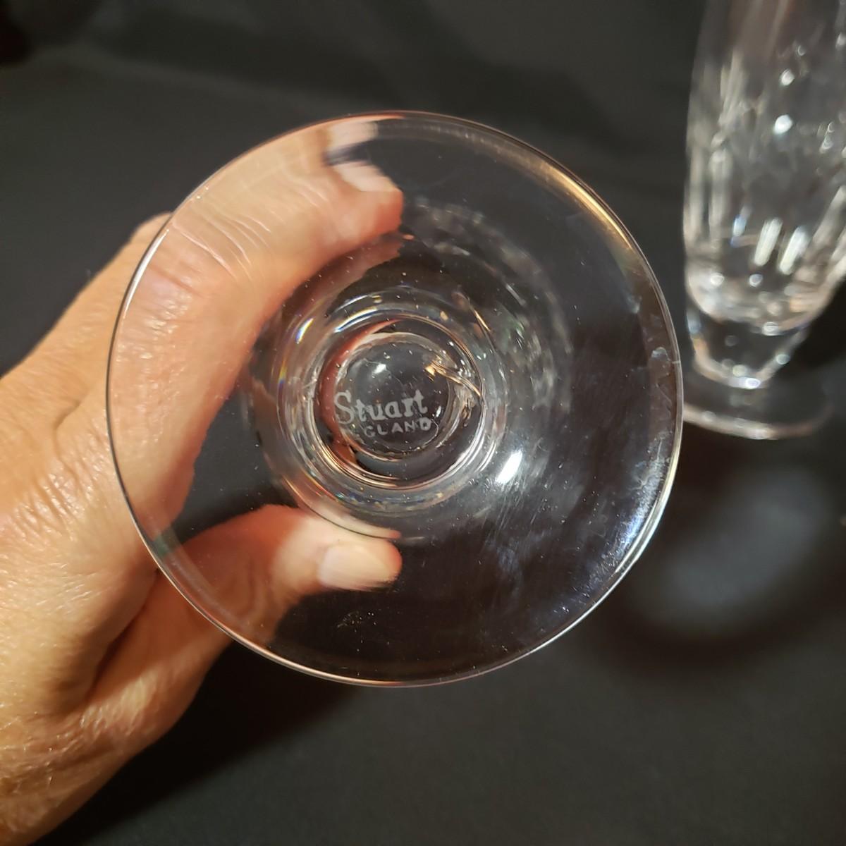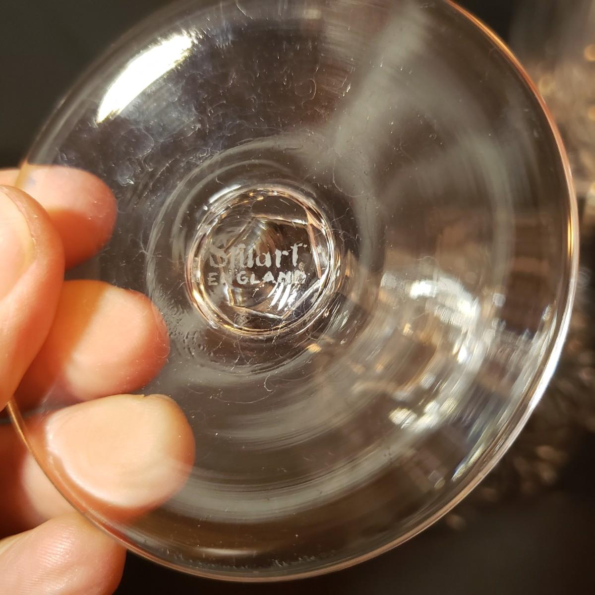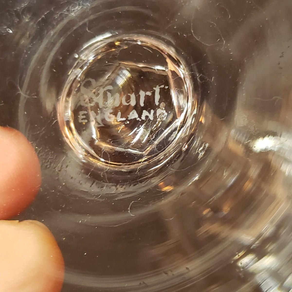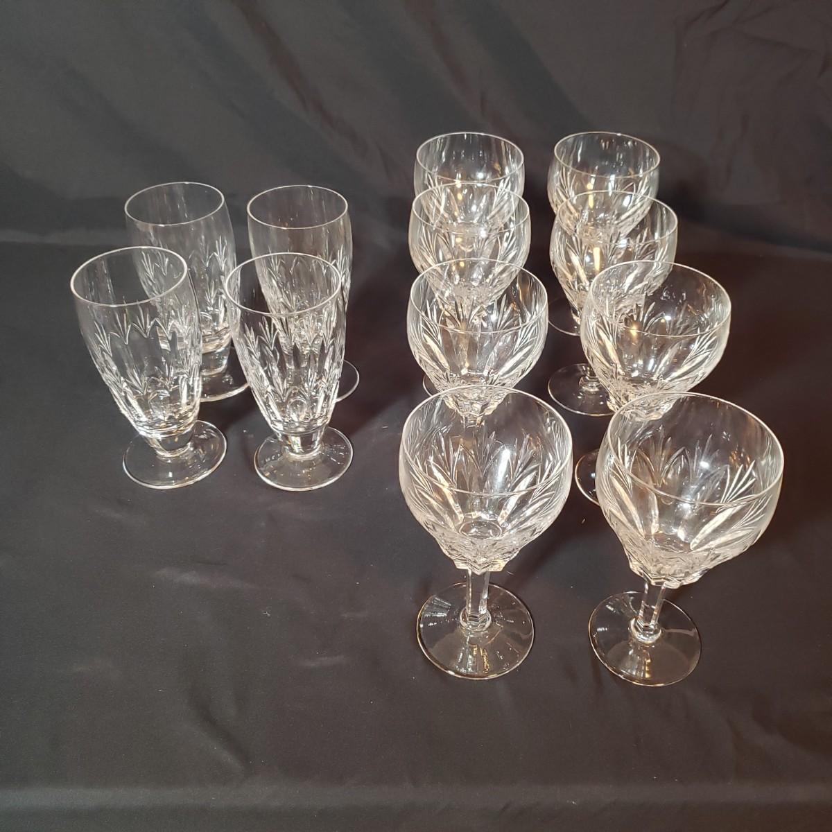 This 12 piece set includes four goblets and eight stemware. Each glass is 6.5"H. There appears to be no blemishes on the glasses. These are Stuart Crystal made in England, see pictures.