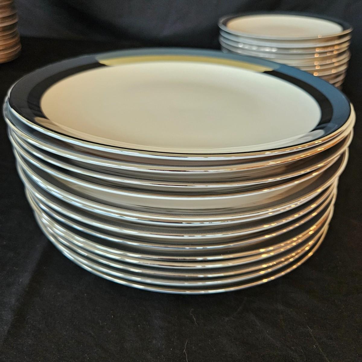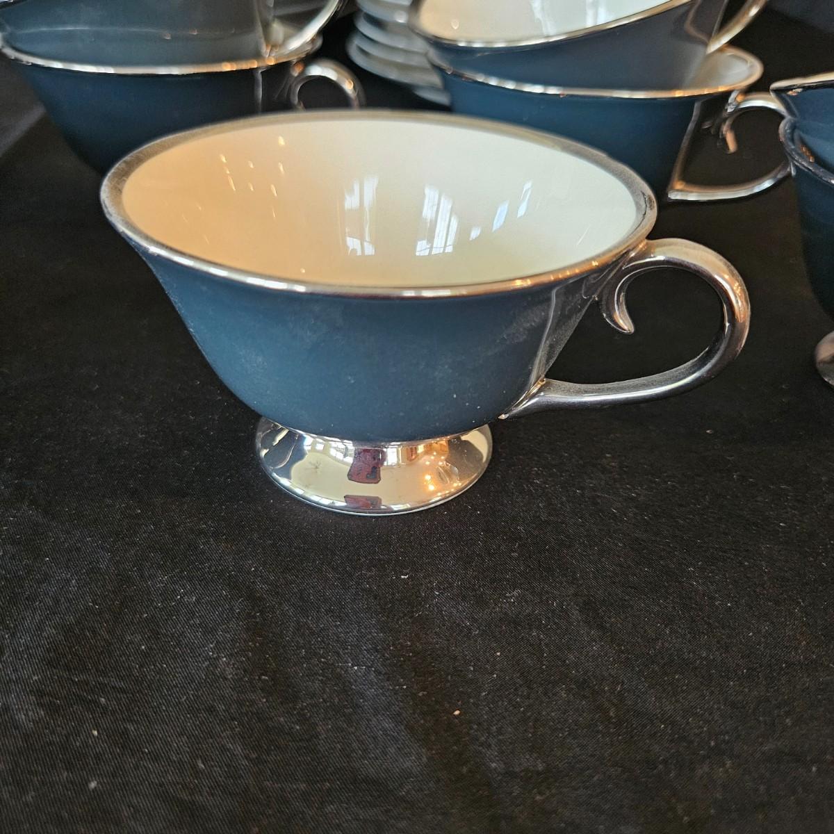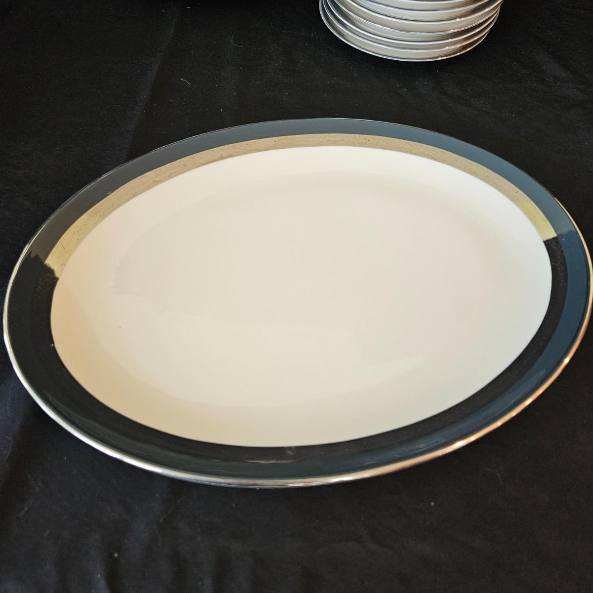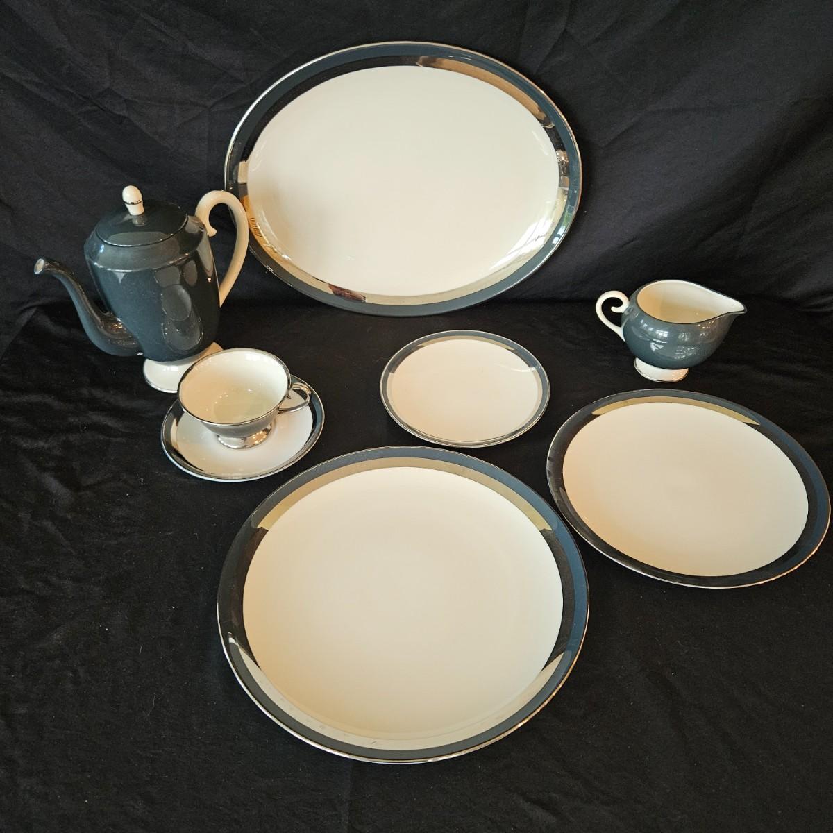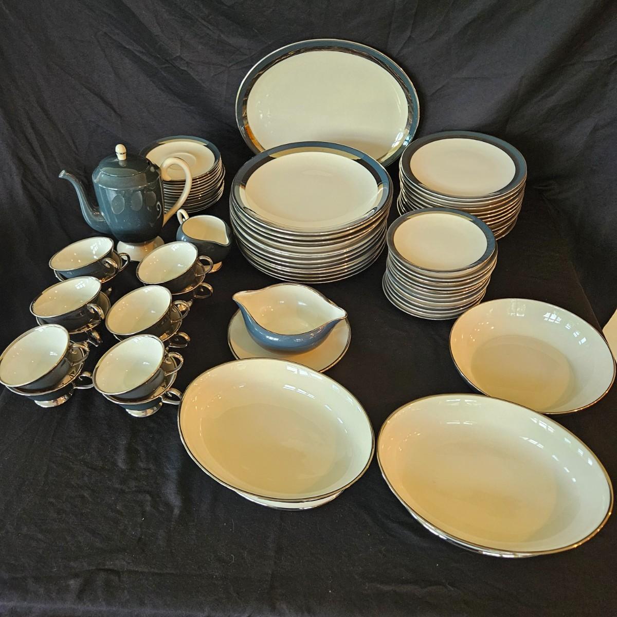 A 12 place setting set of china manufactured by Flintridge and Gorham, in their 'Contessa' pattern. This china set features a contemporary design of a rich blue green accent with a silver trim. It includes a serving platter that measures approximately 14" x 10.5", three serving bowls, a gravy bowl, a teapot with a small chip in its lid and a creamer. The main setting includes dinner plates, salad plates bread plates, saucers and teacups. Shipping available.