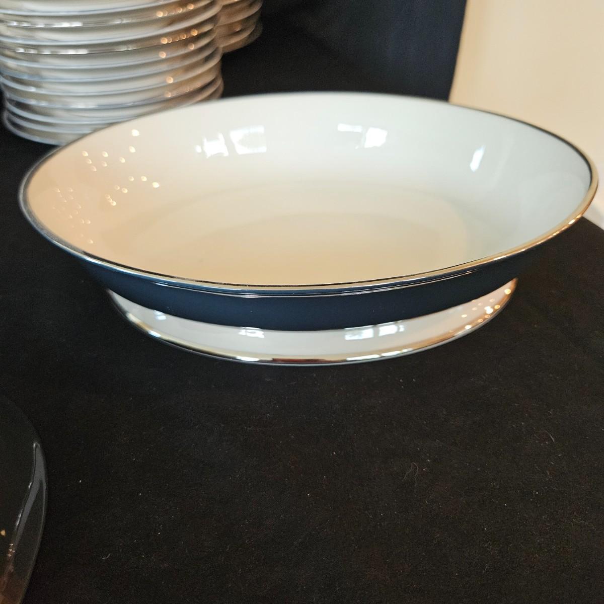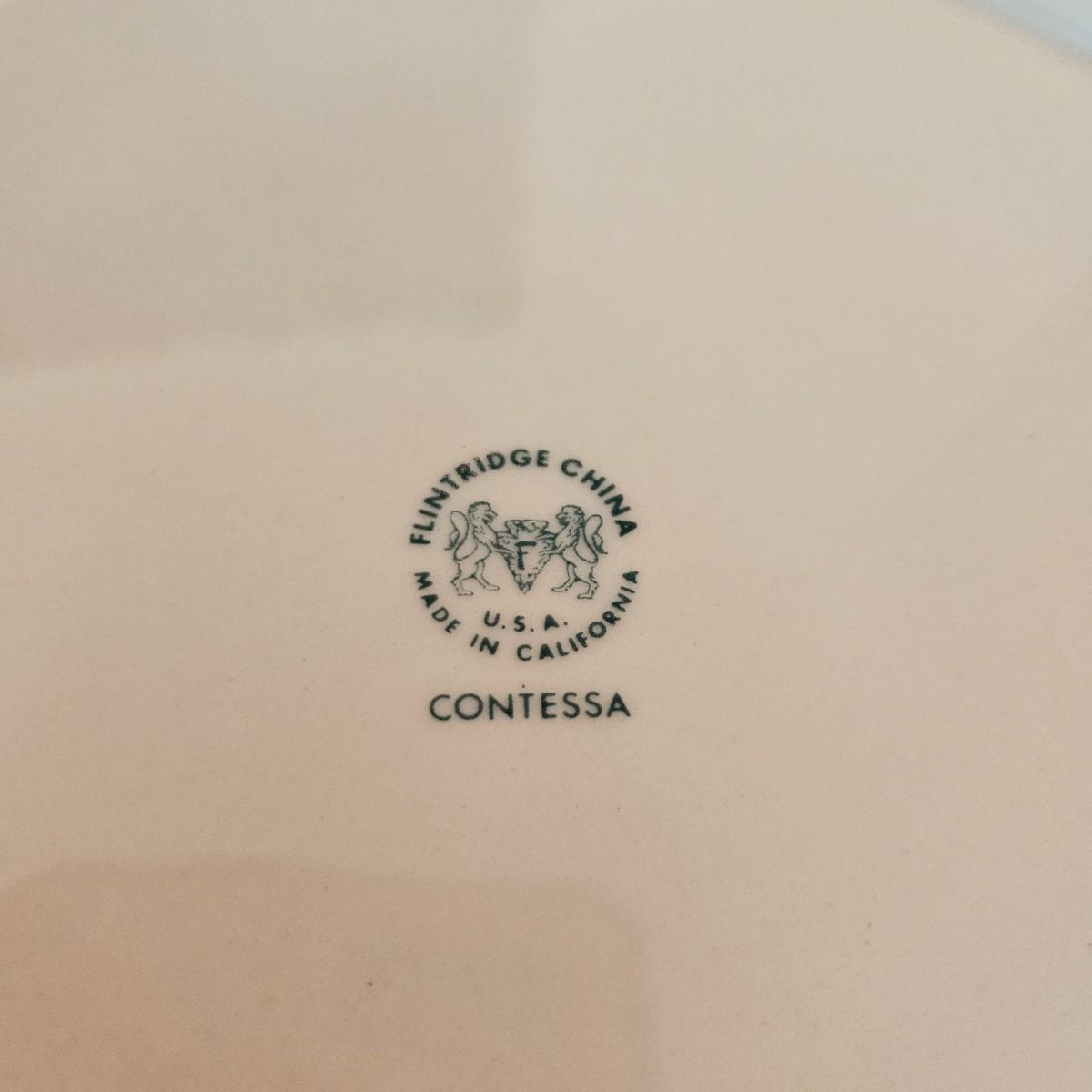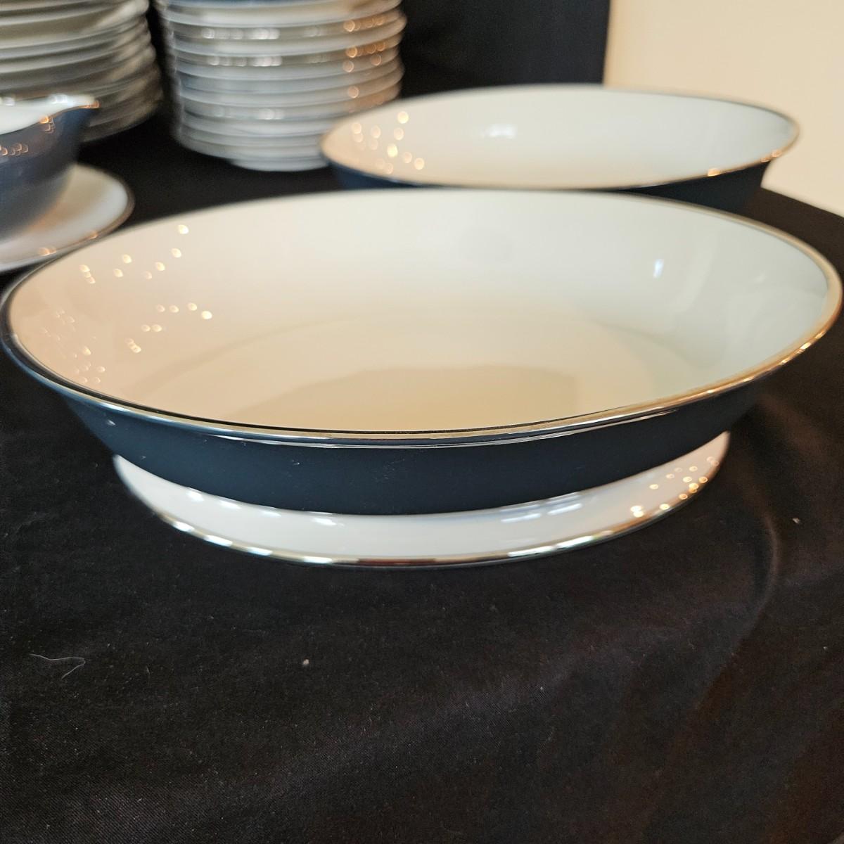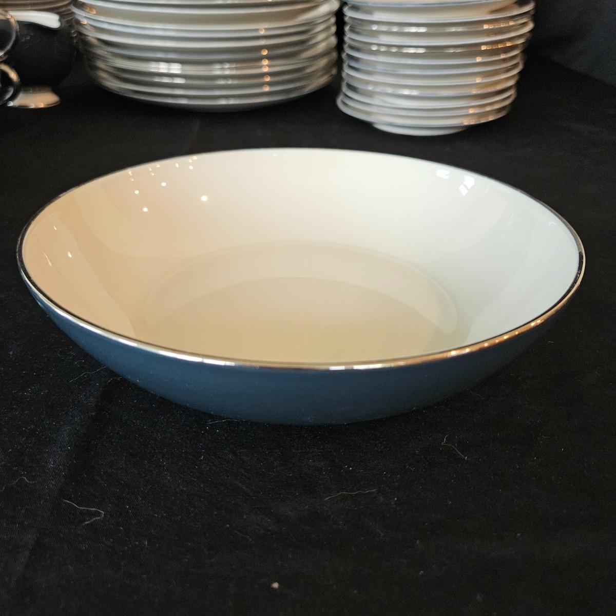 A 12 place setting set of china manufactured by Flintridge and Gorham, in their 'Contessa' pattern. This china set features a contemporary design of a rich blue green accent with a silver trim. It includes a serving platter that measures approximately 14" x 10.5", three serving bowls, a gravy bowl, a teapot with a small chip in its lid and a creamer. The main setting includes dinner plates, salad plates bread plates, saucers and teacups. Shipping available.