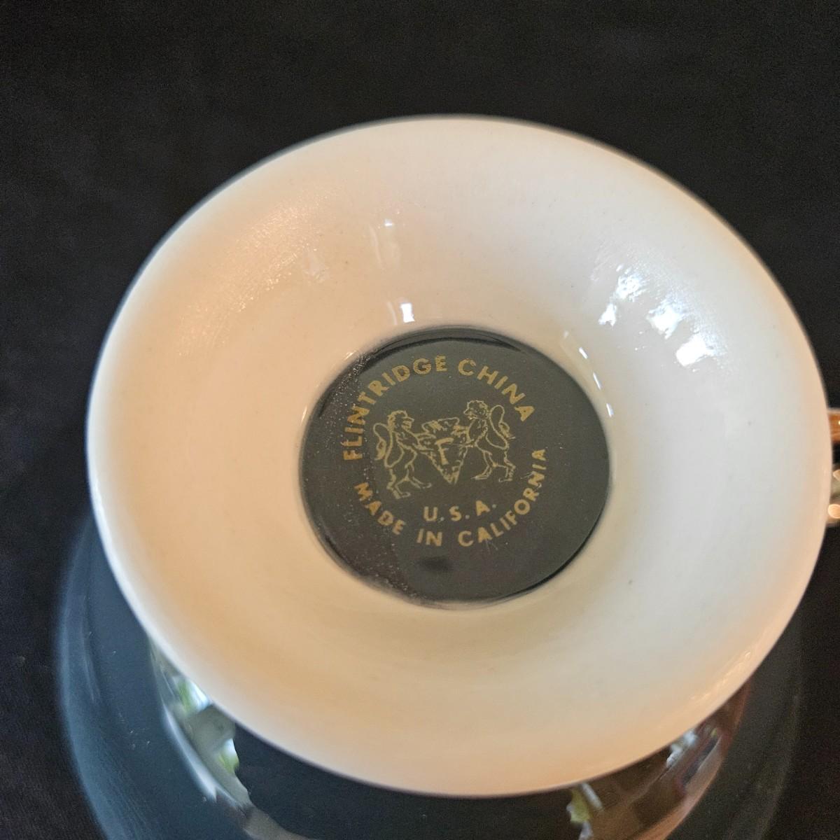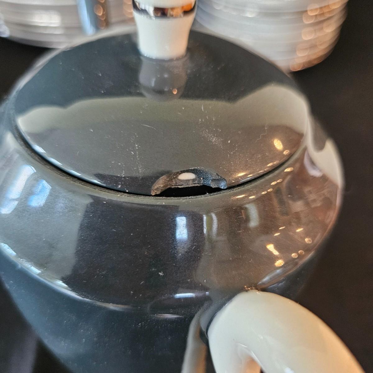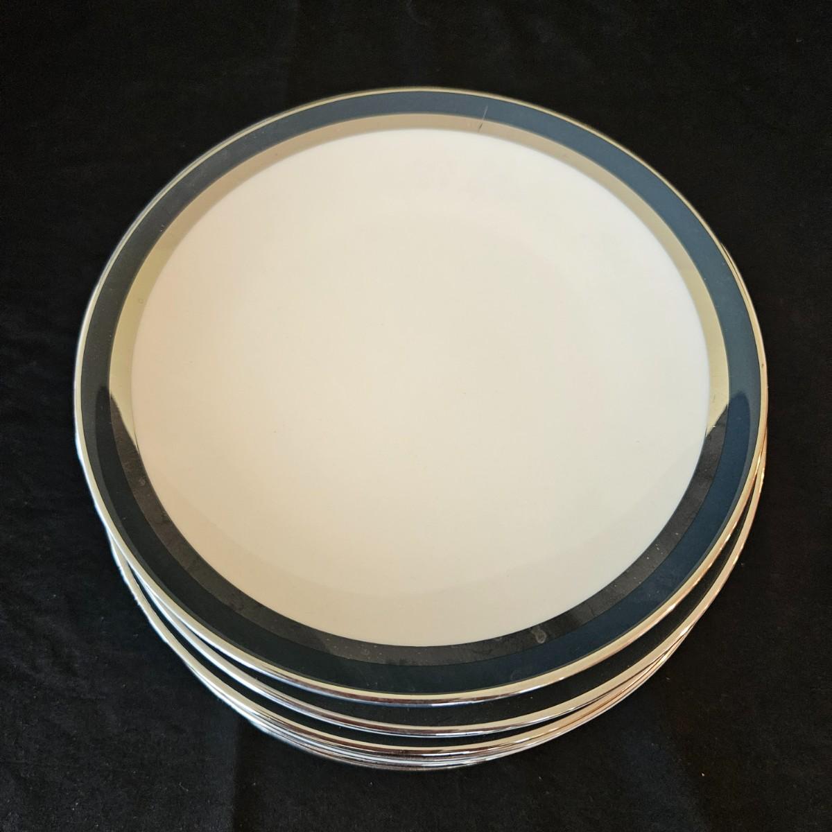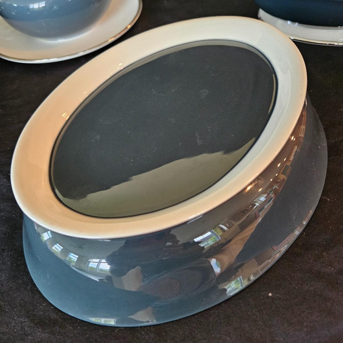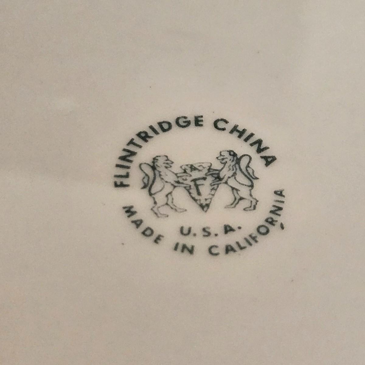A 12 place setting set of china manufactured by Flintridge and Gorham, in their 'Contessa' pattern. This china set features a contemporary design of a rich blue green accent with a silver trim. It includes a serving platter that measures approximately 14" x 10.5", three serving bowls, a gravy bowl, a teapot with a small chip in its lid and a creamer. The main setting includes dinner plates, salad plates bread plates, saucers and teacups. Shipping available.
