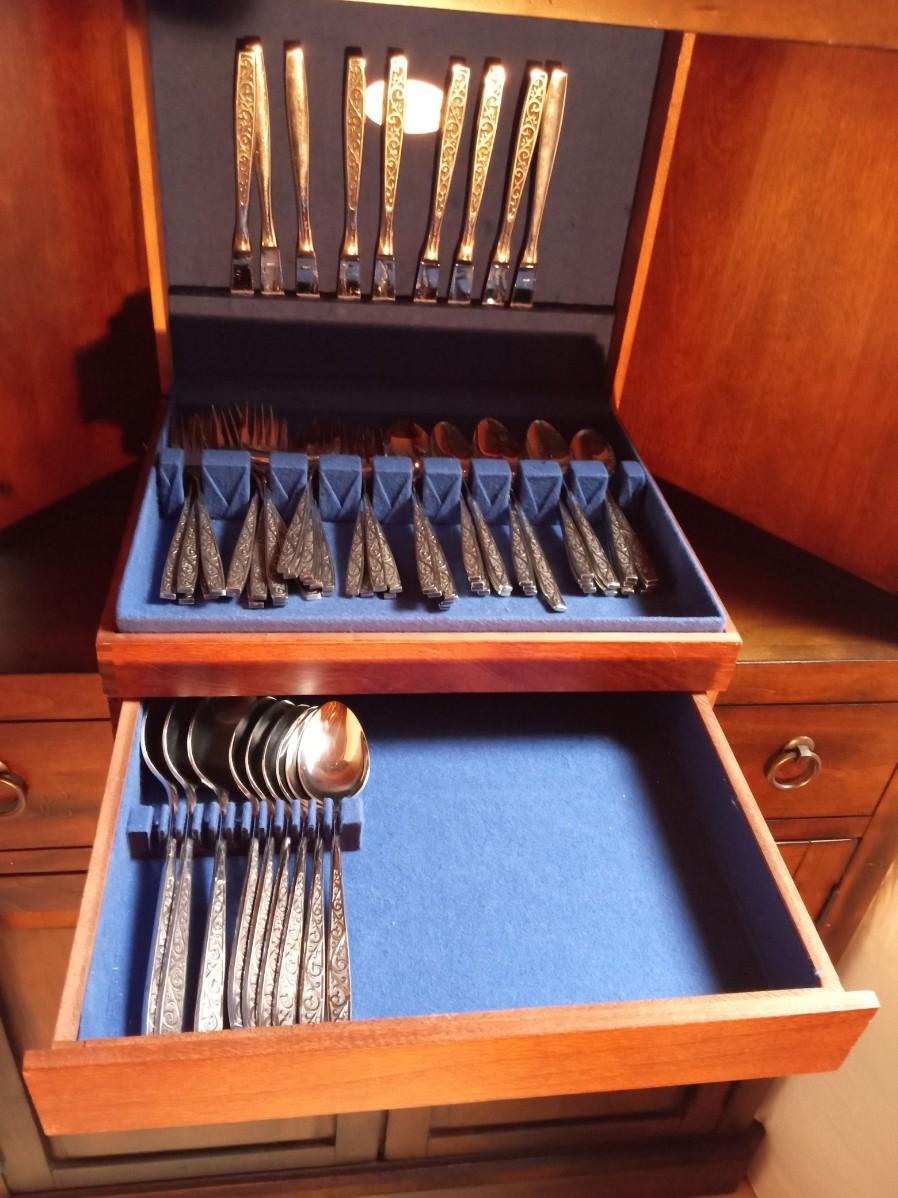 SOME KNIVES ARE HIDDEN BEHIND THE ROW OF SPOONS AND FORKS