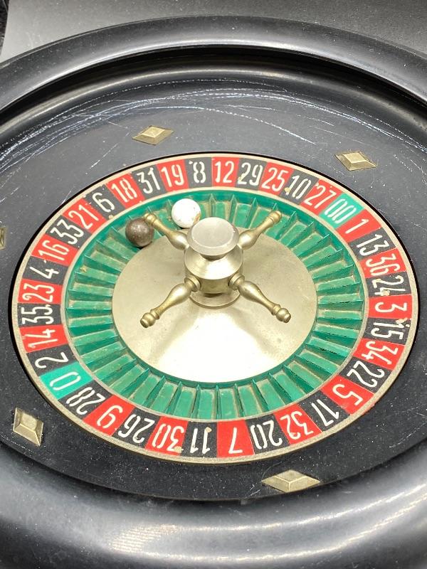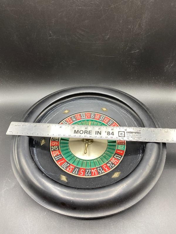 Vintage 12" roulette wheel and dice set. Bring Las Vegas to you, play roulette at your next party. 12" wheel with 2 marbles. Previously used, has marks around the wheel. Spins nicely. Comes with leather dice cup & 6 dice, 4 green 2 red.