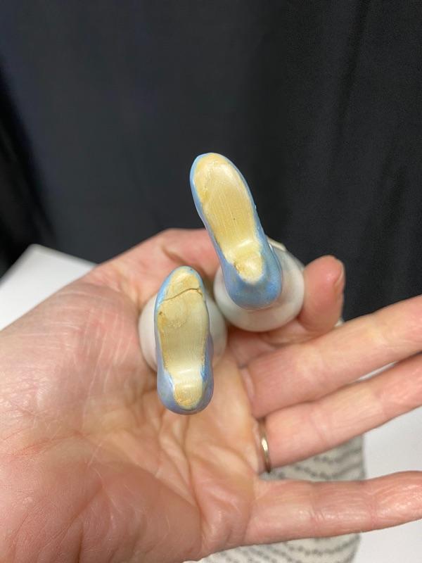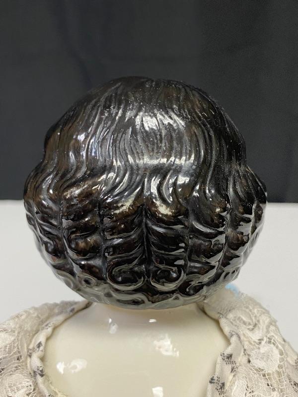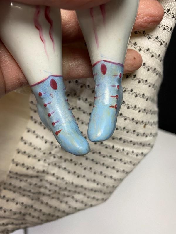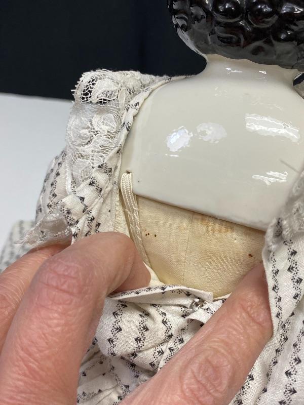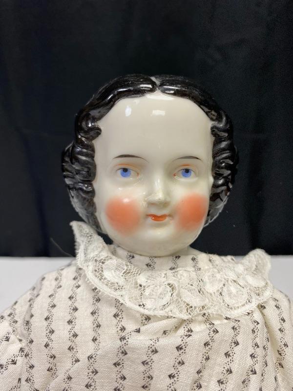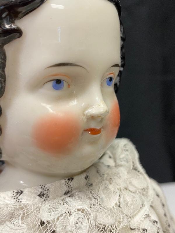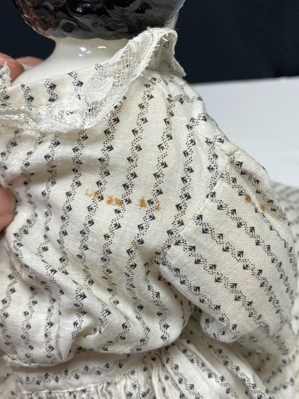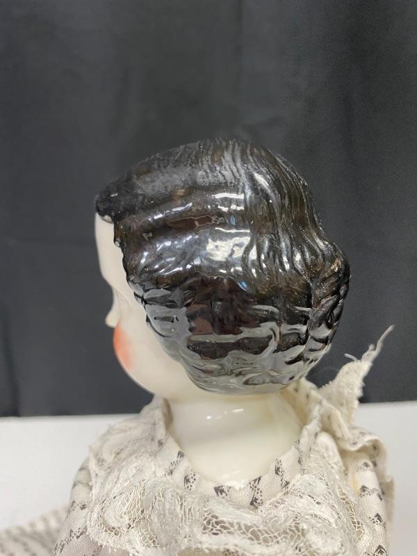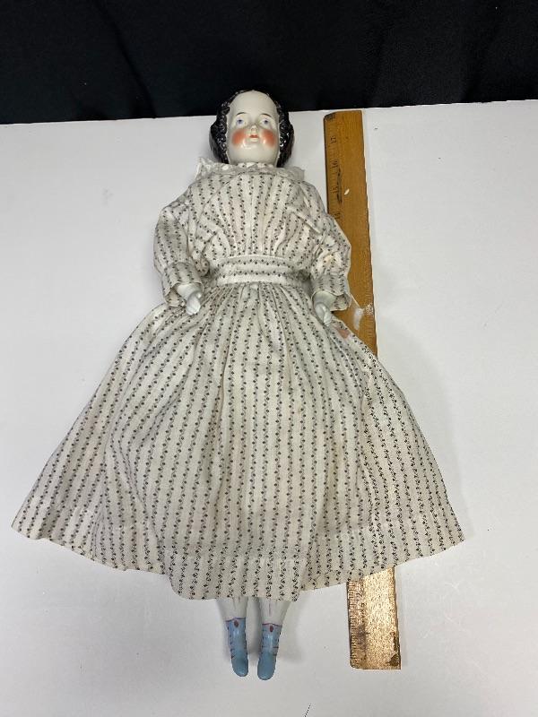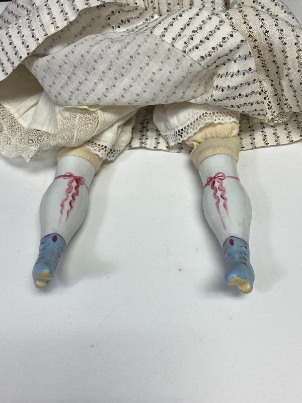 12" German china head doll. Round face with flatter curls. China hands and feet, boots are painted on. Black & white dress has some discolor spots. I believe her nose has been repaired as has her foot.