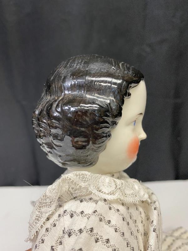 12" German china head doll. Round face with flatter curls. China hands and feet, boots are painted on. Black & white dress has some discolor spots. I believe her nose has been repaired as has her foot.