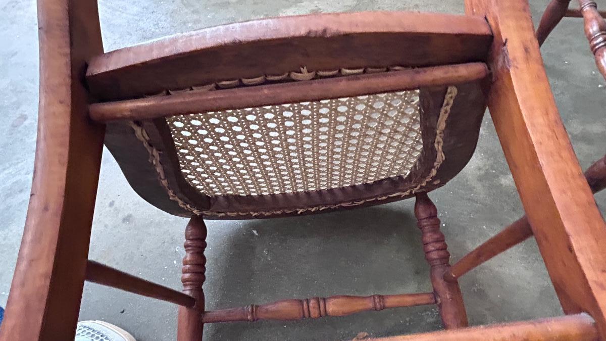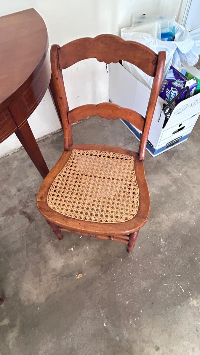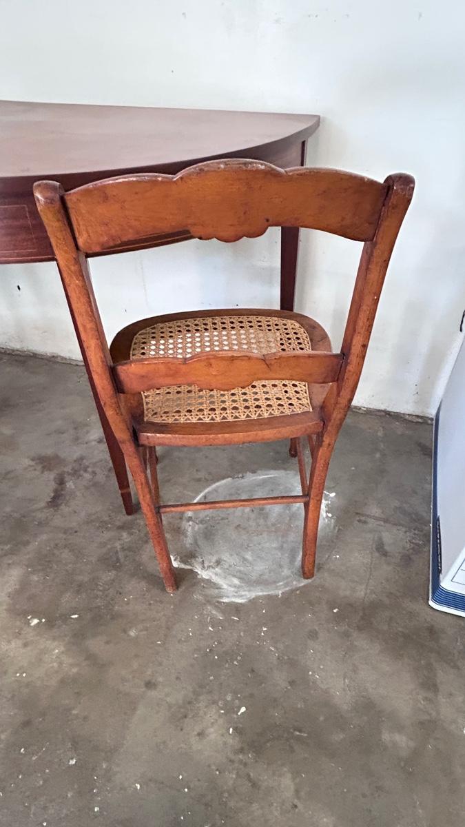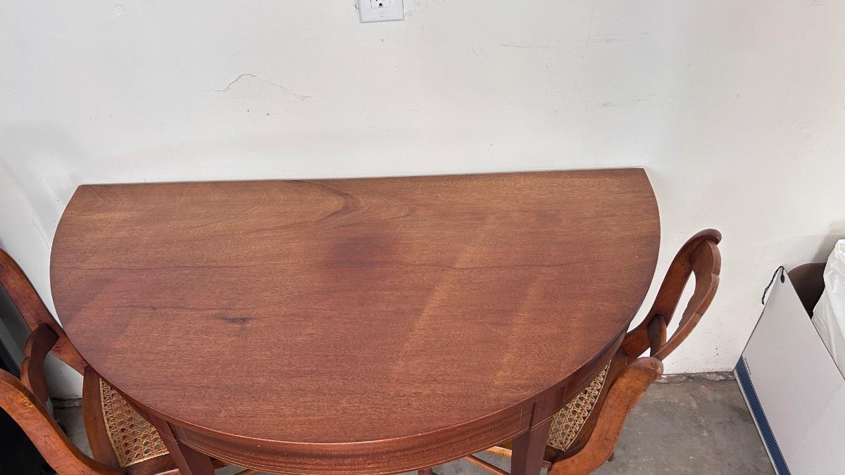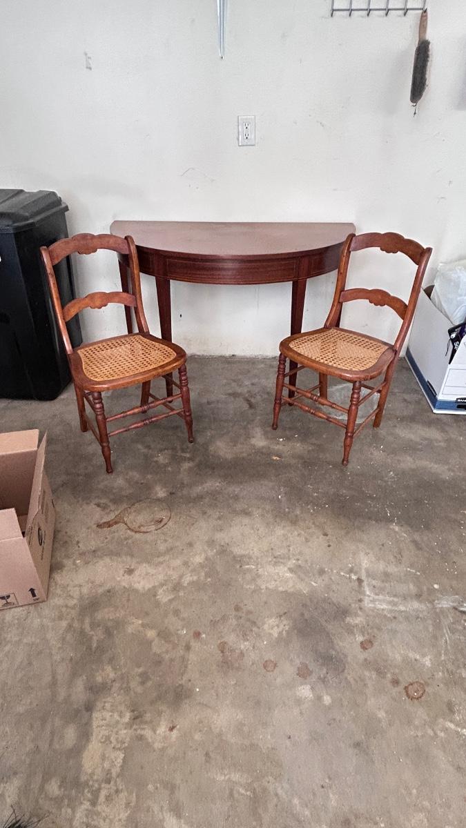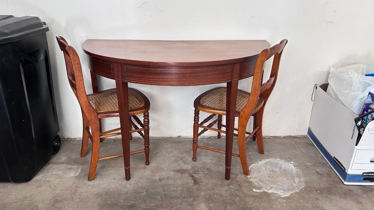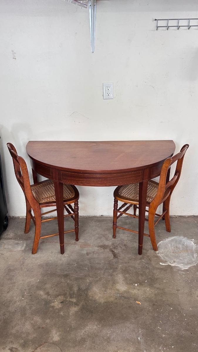 1/2 ROUND TABLE, & 2 ANTIQUE HANDCRAFTED CANED SEAT CHAIRS