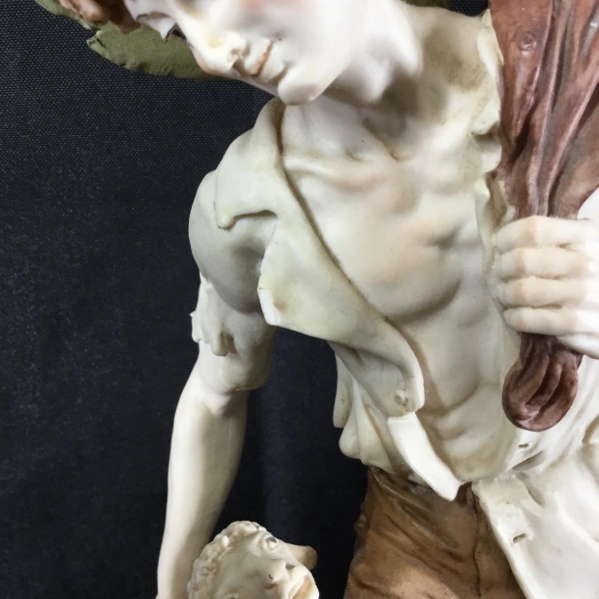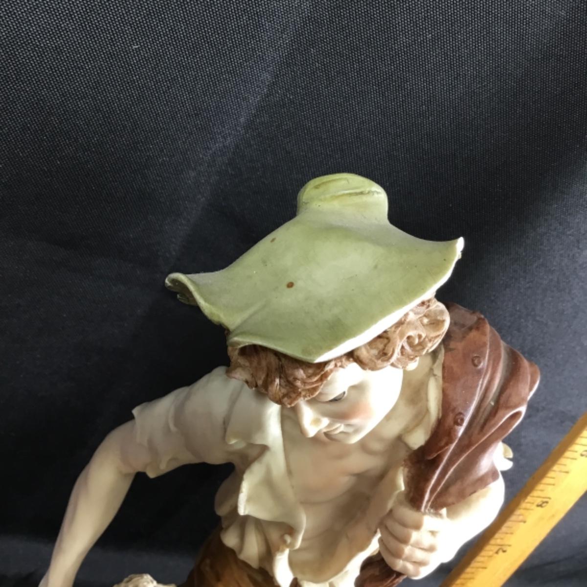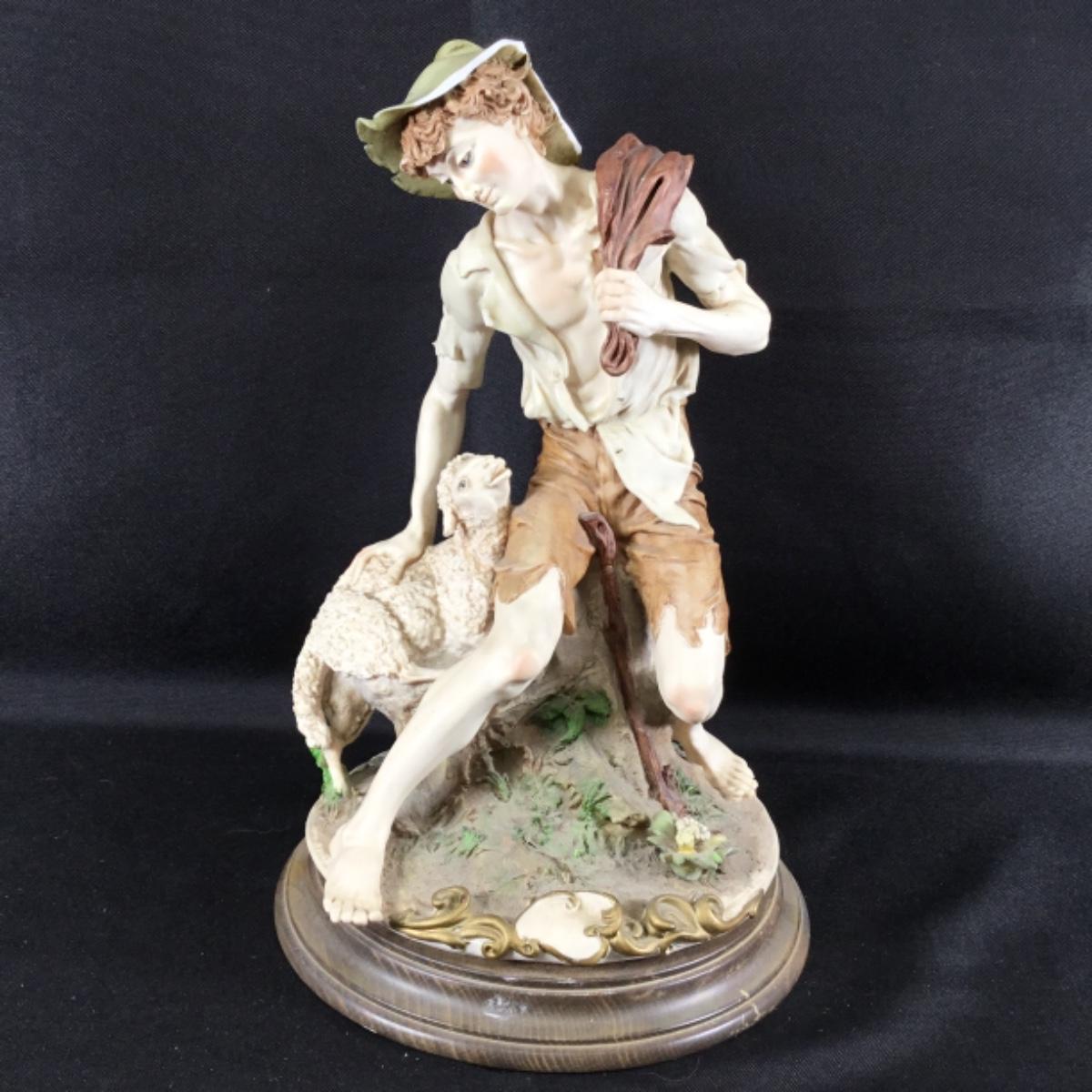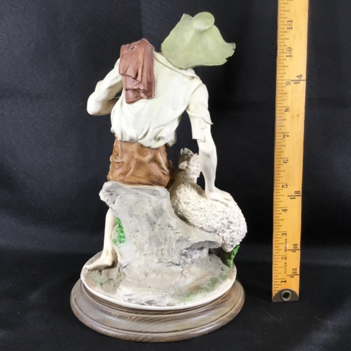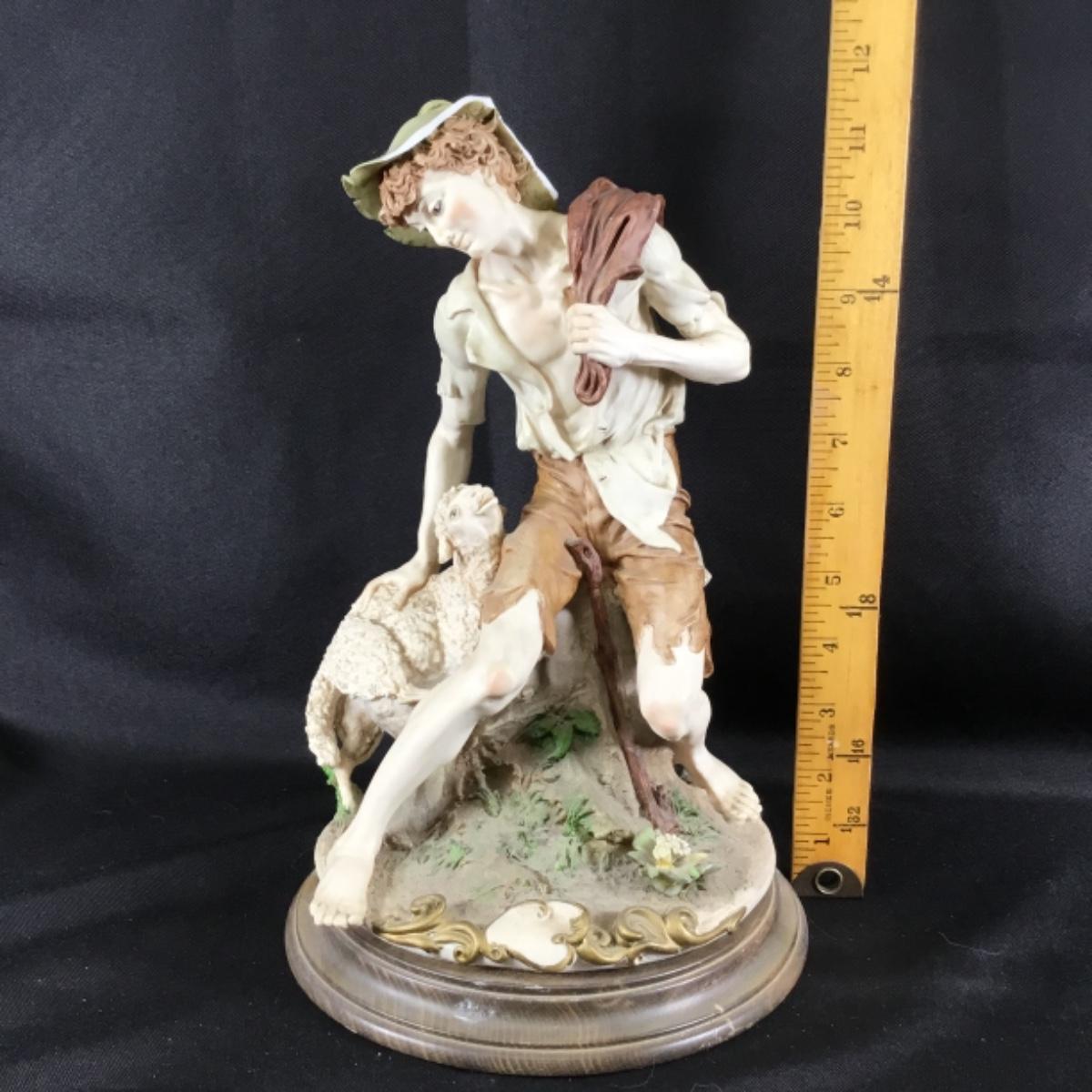Resin atop a wood base. The shepherd“˜s hat has a piece that has been broken off. There is also damage to the lapel of his shirt as well as scratches on the base of the statue; see pictures.