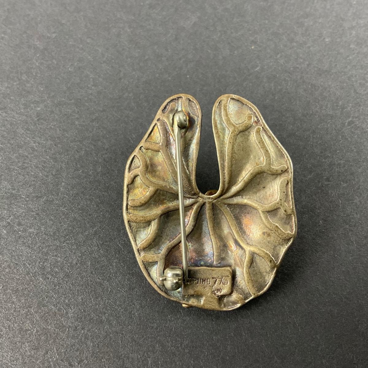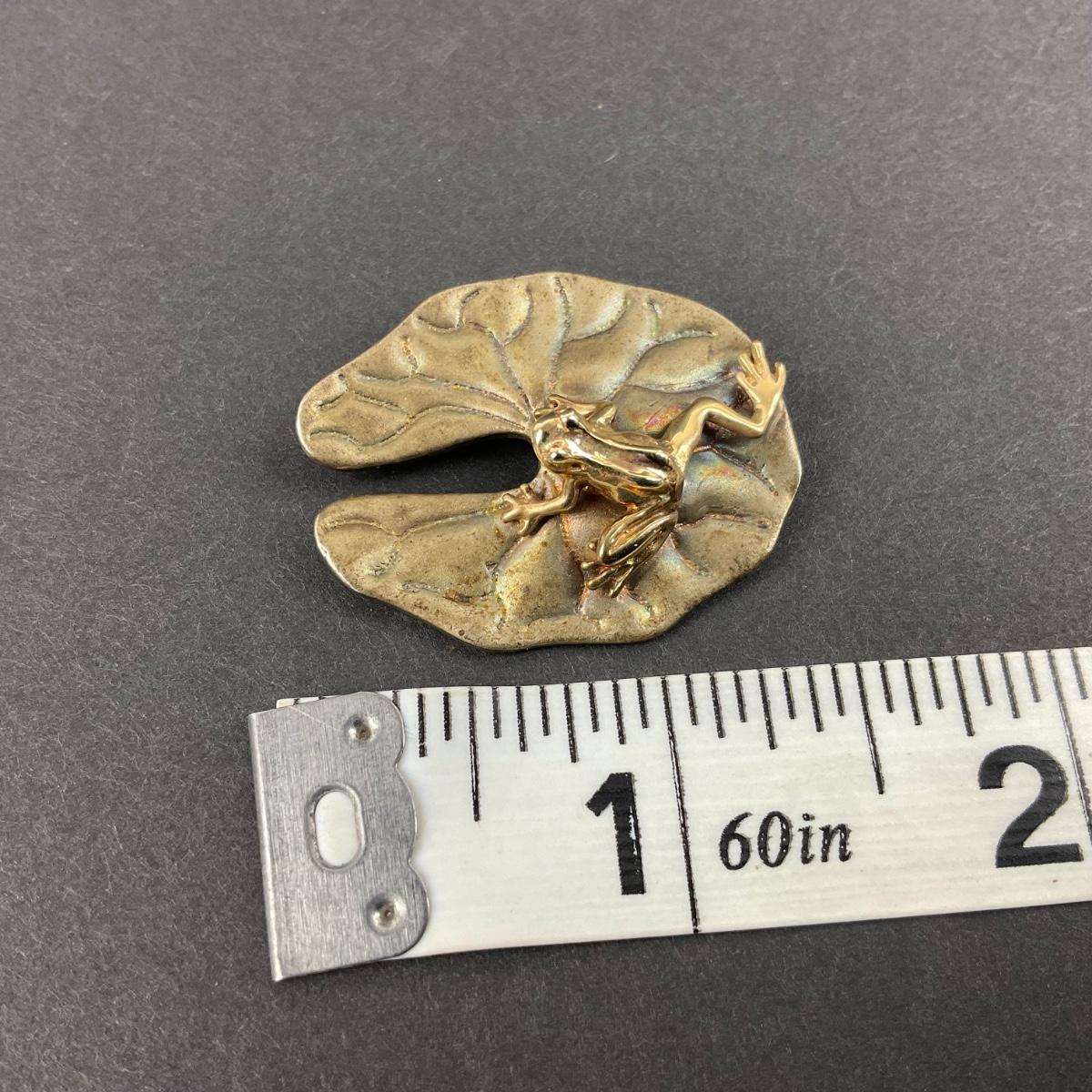one vintage Sterling and artist marked brooch of frog on lily pad. Please see photos for details and condition. Any condition statement is given as a courtesy to a client, is an opinion, and should not be treated as a statement of fact. Reference to condition written, oral or within a condition report shall not be regarded as a full account of condition and may not include all defects, alterations, or restorations. Absence of a condition report does not imply a lot is flawless or lacking imperfections or damage. Katherine’s Auction & Appraisal Service shall have no responsibility for any error or omission. Returns shall not be accepted on the basis of condition. ::: Shipping is available on this lot. If you require shipping you must let us know at the close of the auction. We will coordinate with you after the item has been won. Shipping fees will include insurance up to or exceeding the value of all items being mailed. If you have any questions regarding this lot please contact the auctioneer either via this website, by direct email or by phone. PICK UP TIMES and other important information can be found in the TERMS and DESCRIPTION of the auction. Please take a look for pertinent information. Thanks!