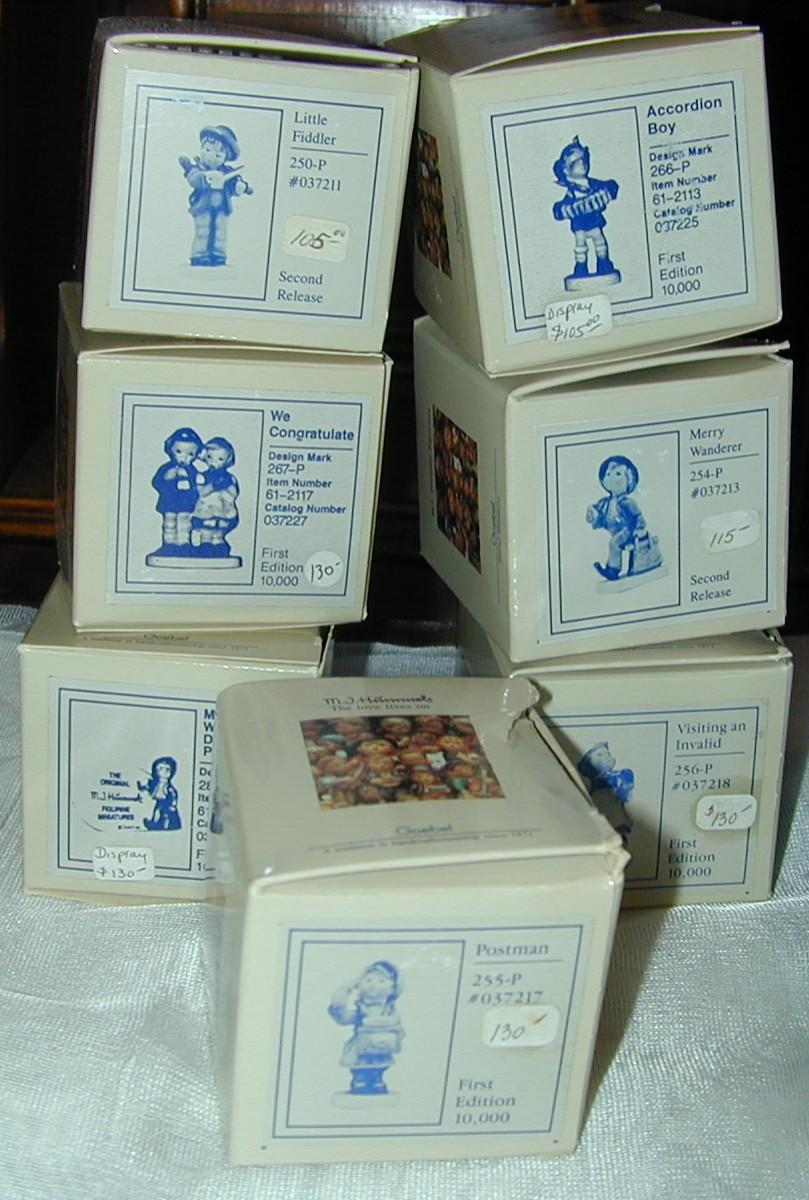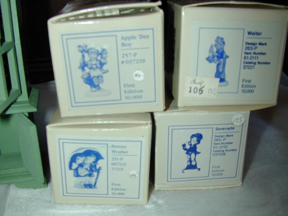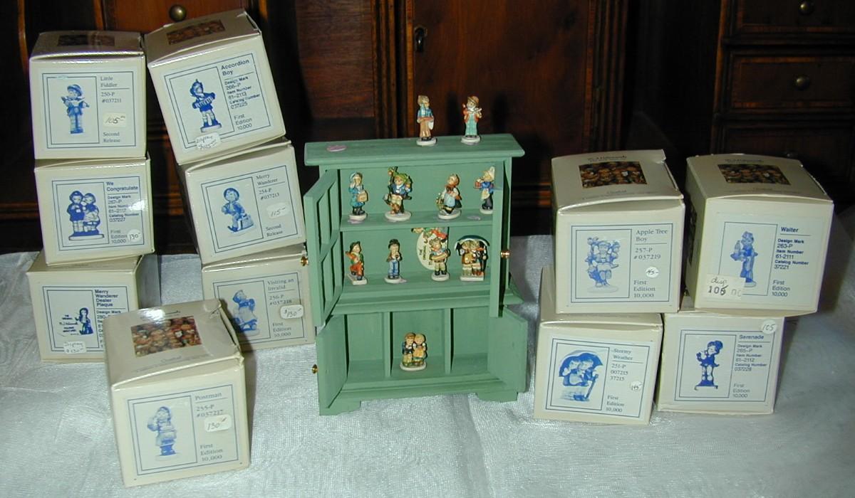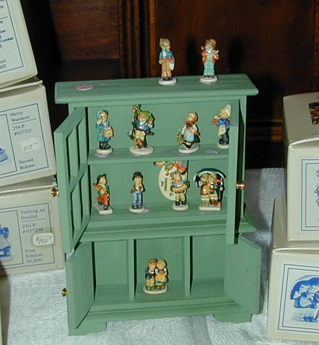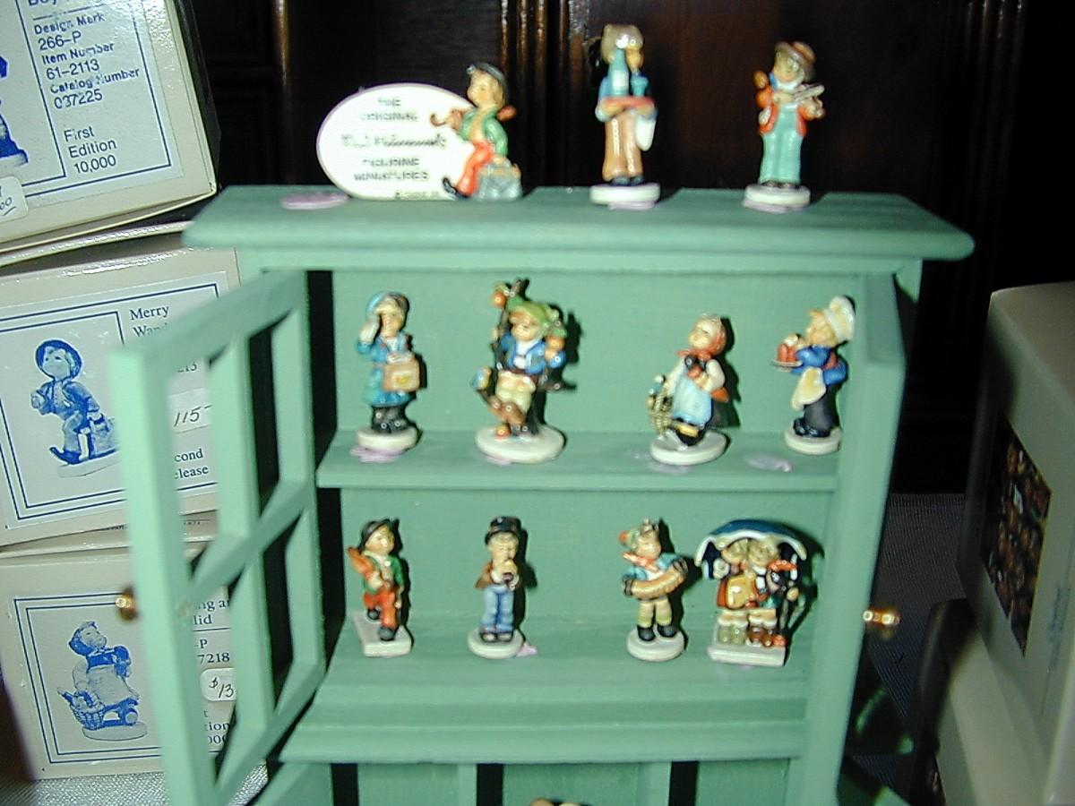 12 Tiny Goebel Hummel Miniature Figurines In Cabinet With Boxes - there are 11 boxes