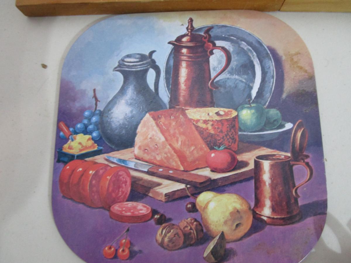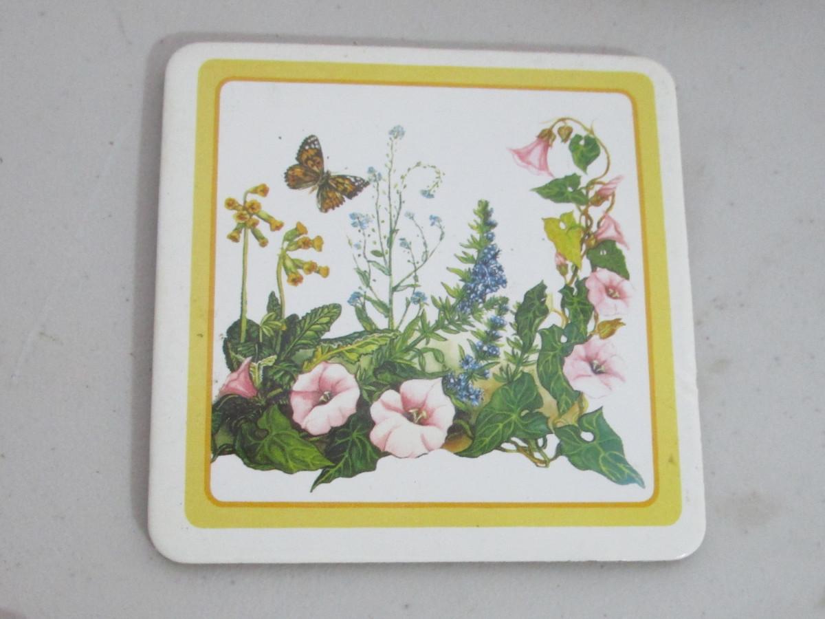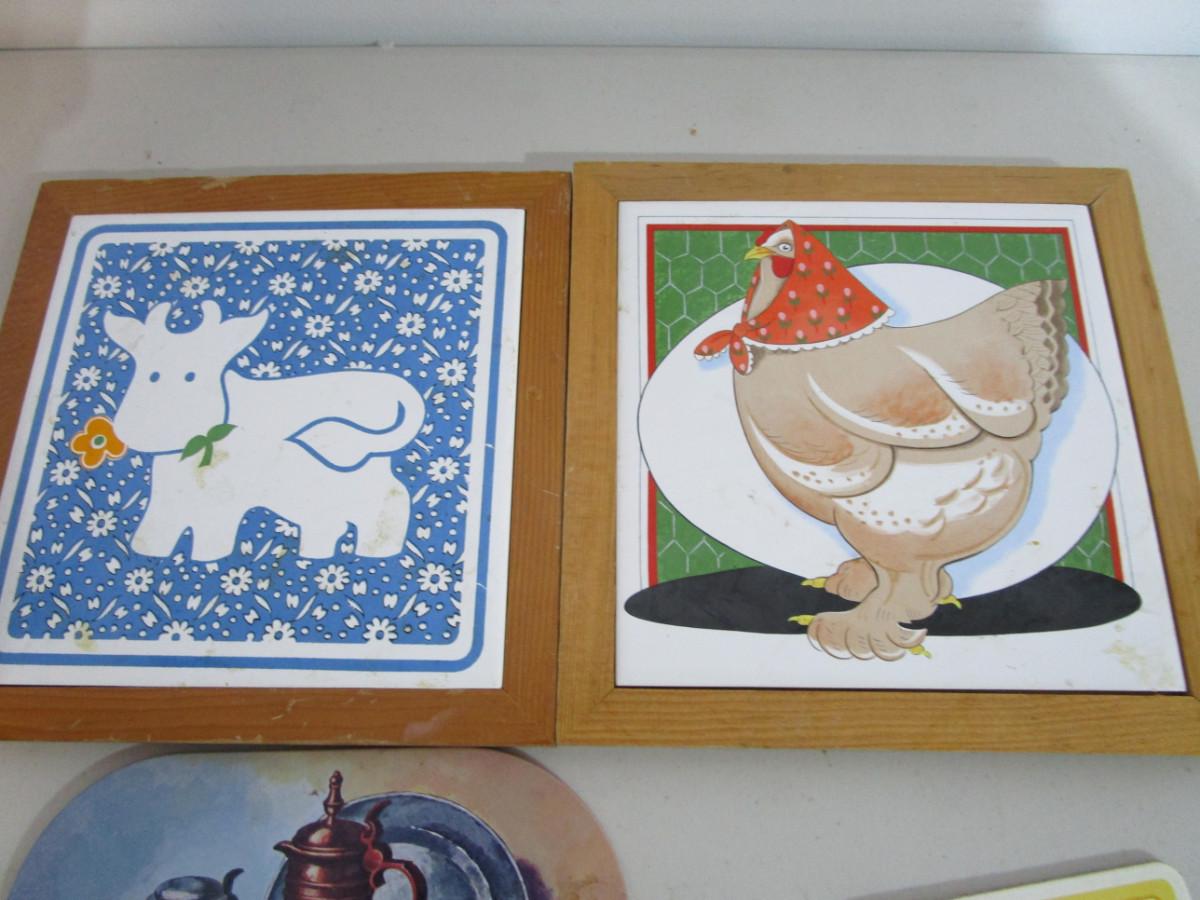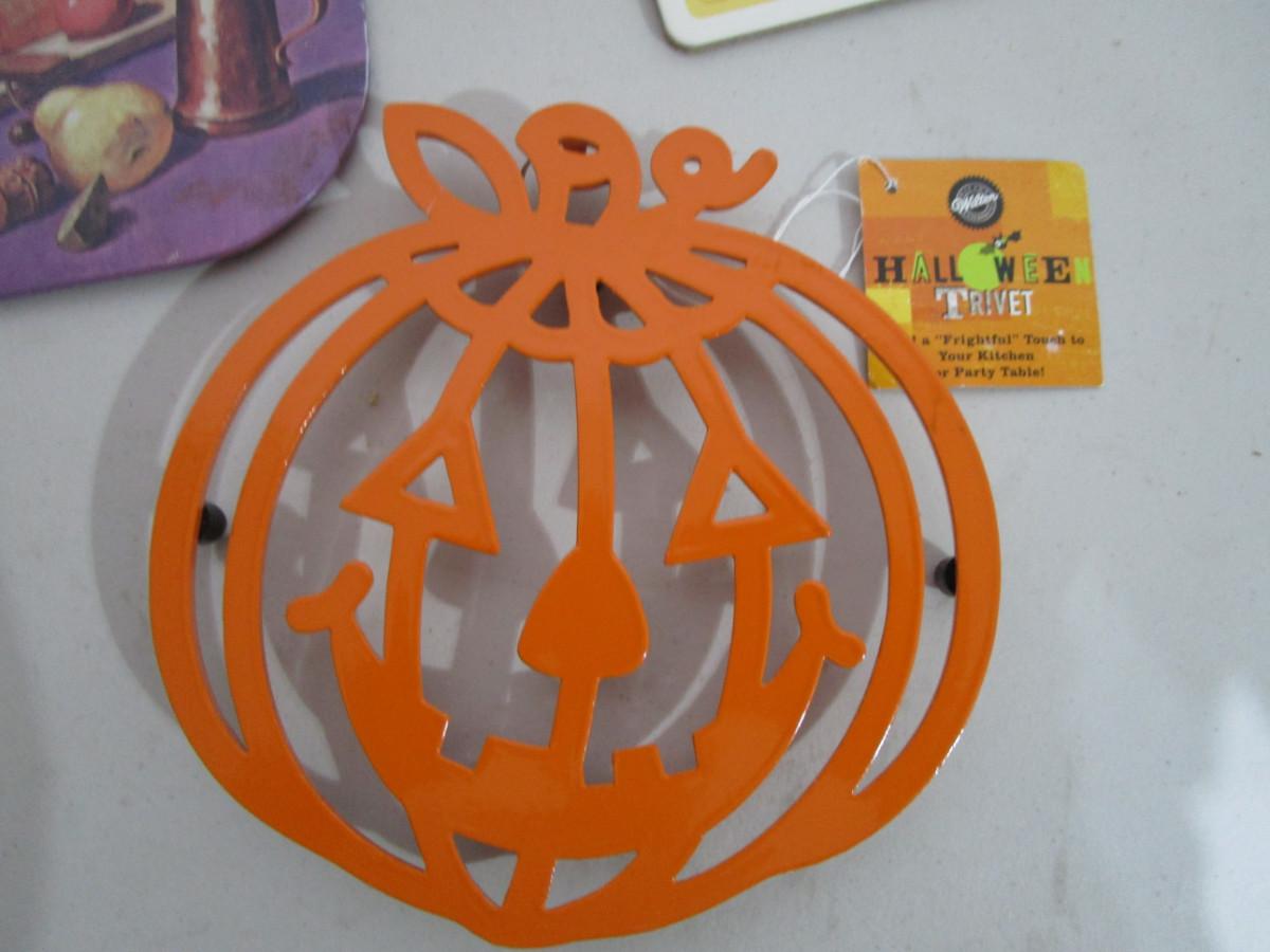 4 trivets, 2 wooden framed trivets 7", metal trivet 6.5, Pumpkin trivet 6.5", coaster 3.5"