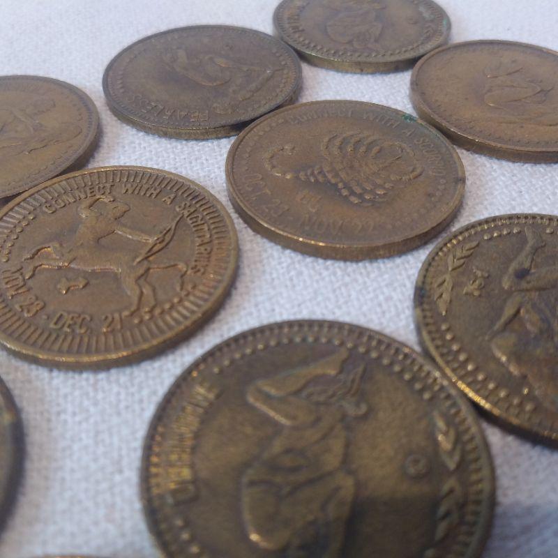 Collection of Very Naughty Coins. A set of 12 very naughty coins. Some show astrological symbols and some are double sided sexual position coins. All coins show tarnish and wear. Definitely a conversation starter - who knows where these coins might lead. From the Ft. Lauderdale estate. Reserve Price $10.