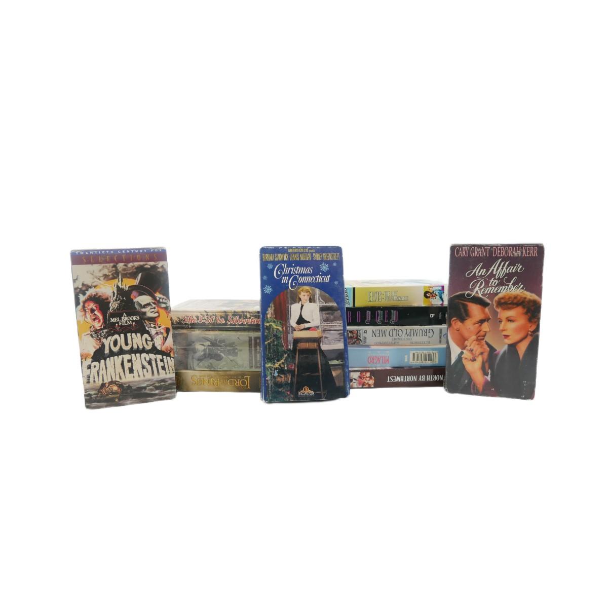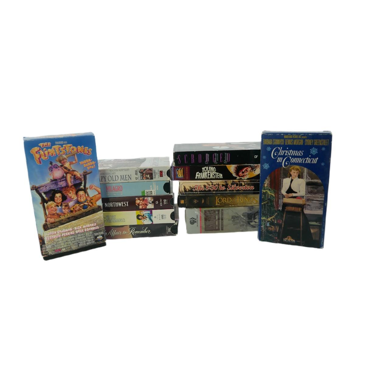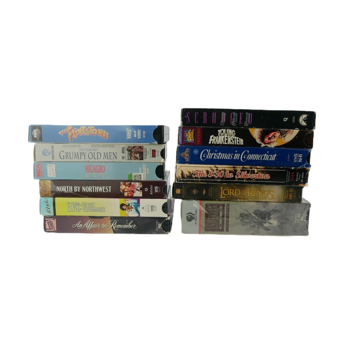 Lot of 12 VHS tapes. All in used condition and different genres. Packaged lot measures 15" x 11" x 6", weighs 7 lbs. (M55)