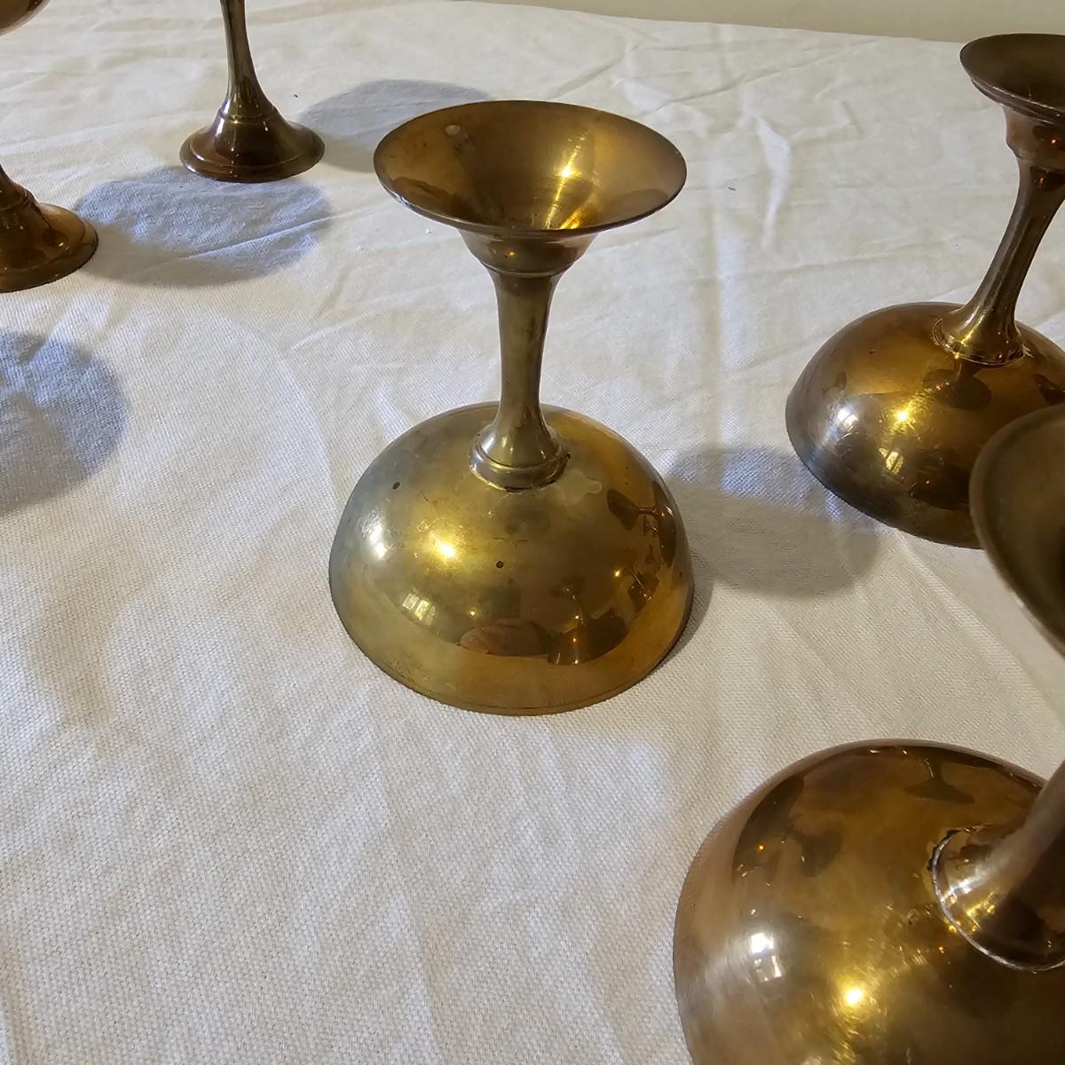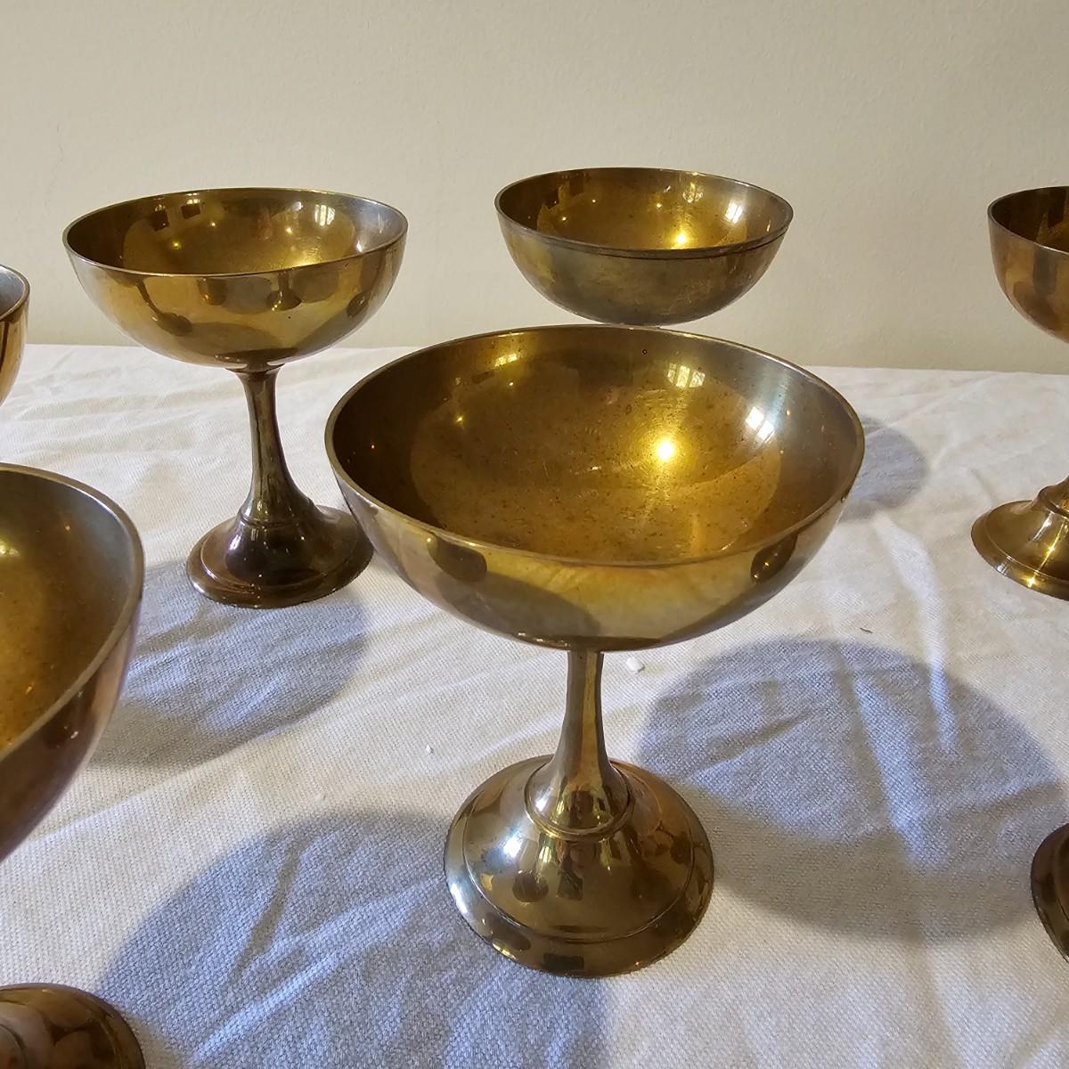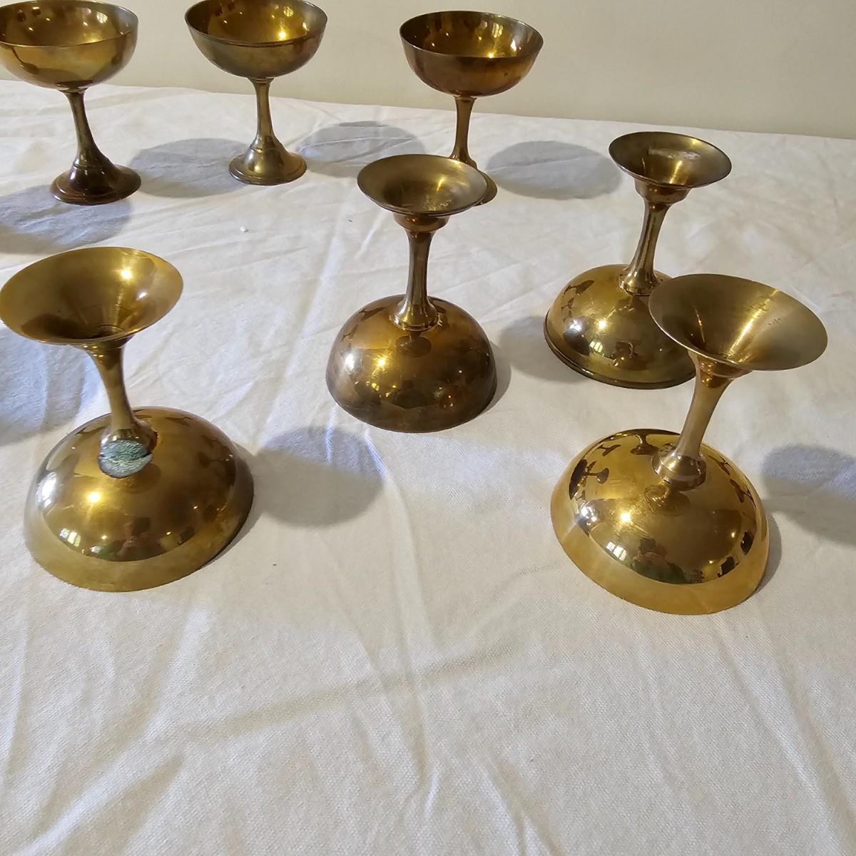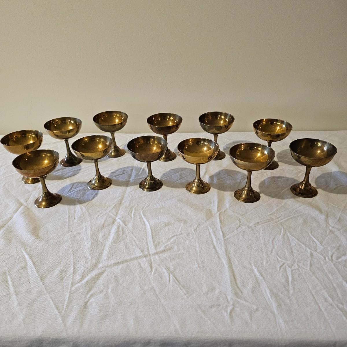 One dozen vintage brass goblet drinking vessels. Small footed pieces measure 3.125"D x 4"H. Some visible tarnish and verdigris on several pieces, see photos for details. Shipping available.