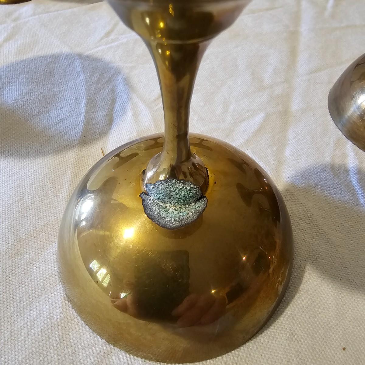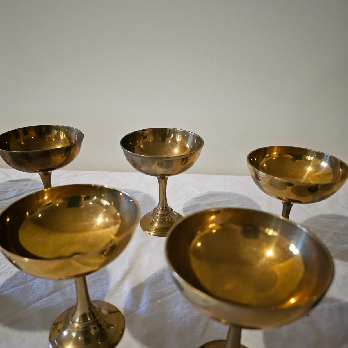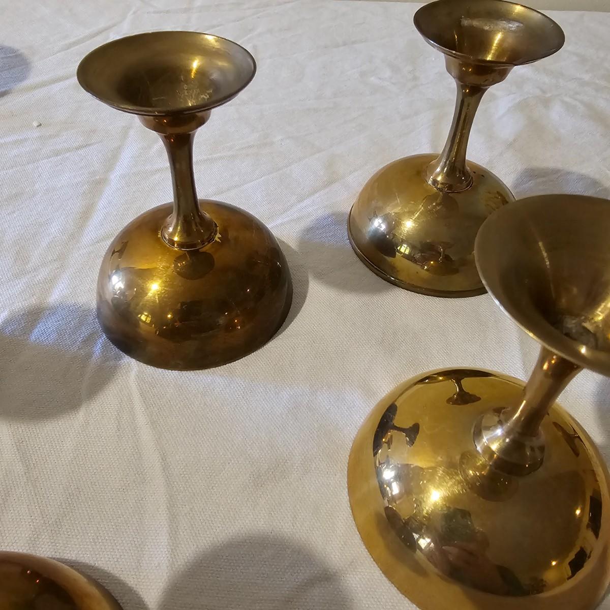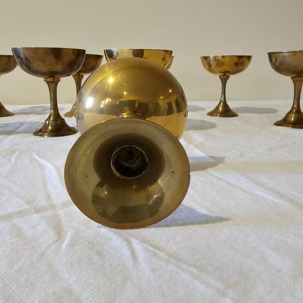 One dozen vintage brass goblet drinking vessels. Small footed pieces measure 3.125"D x 4"H. Some visible tarnish and verdigris on several pieces, see photos for details. Shipping available.