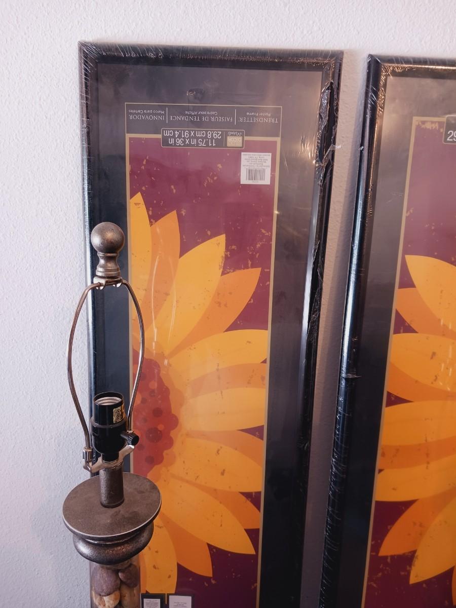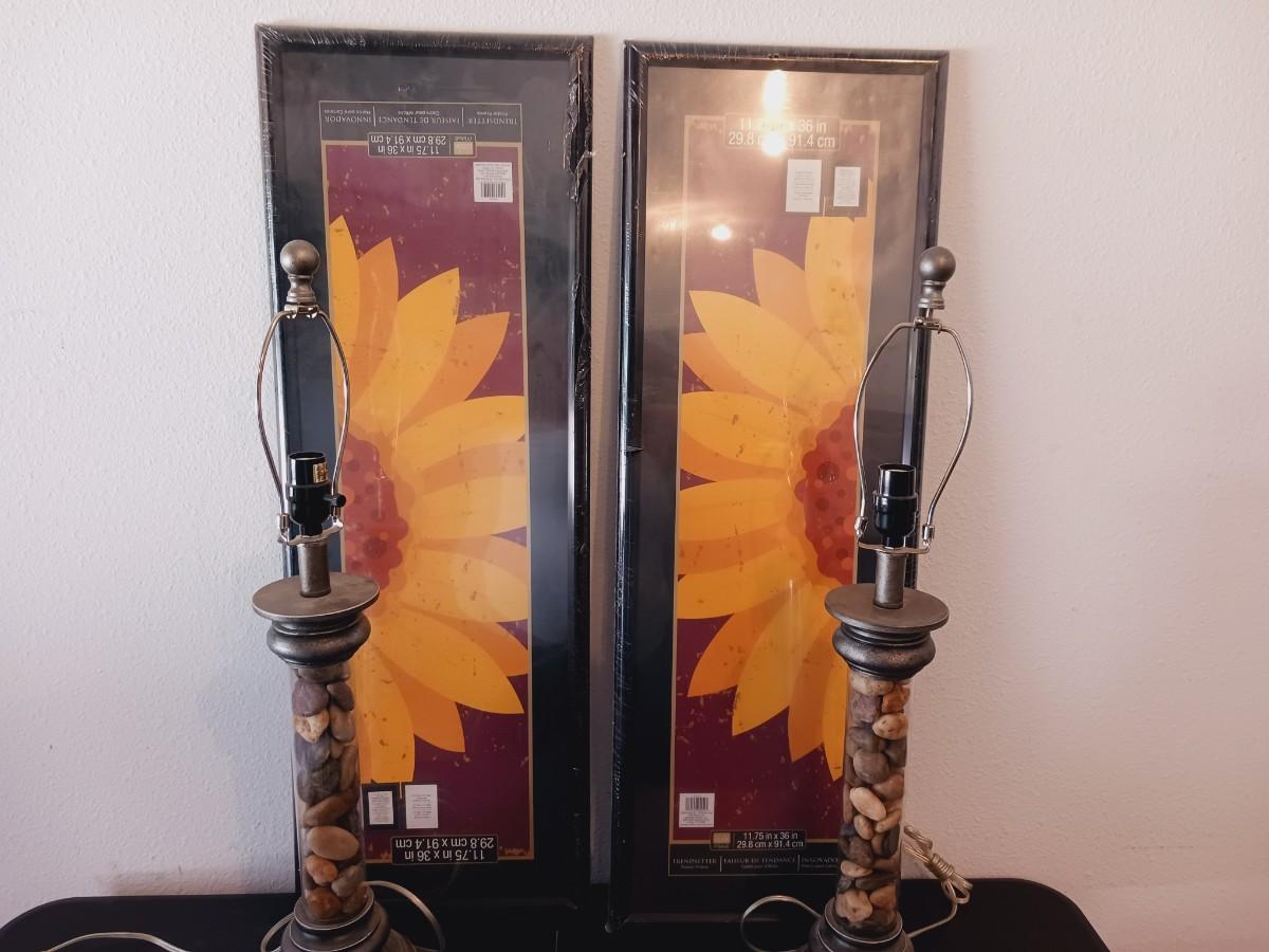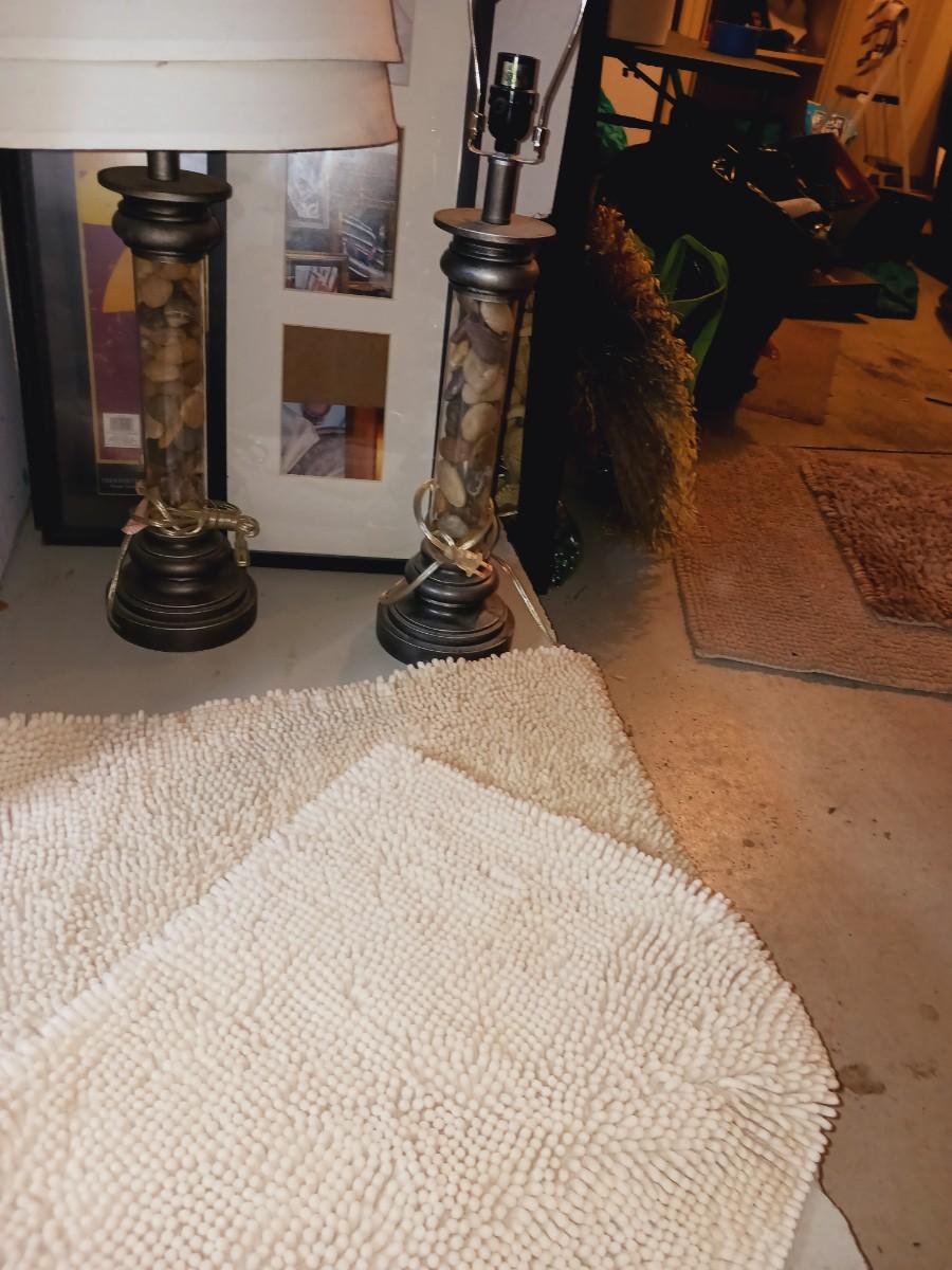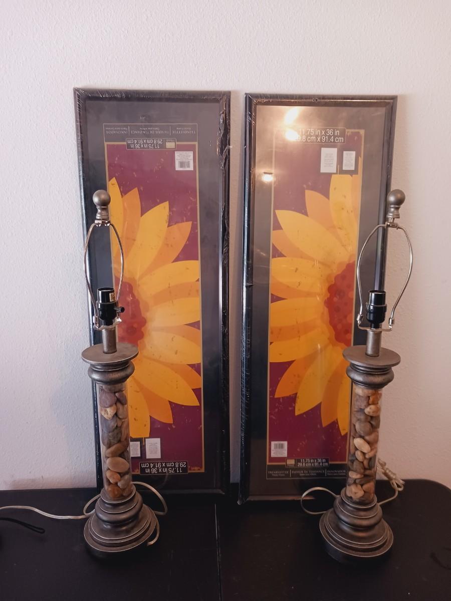 12 X 36 FRAMES AND MATCHING TABLE LAMPS PLUS 2 THROW RUGS