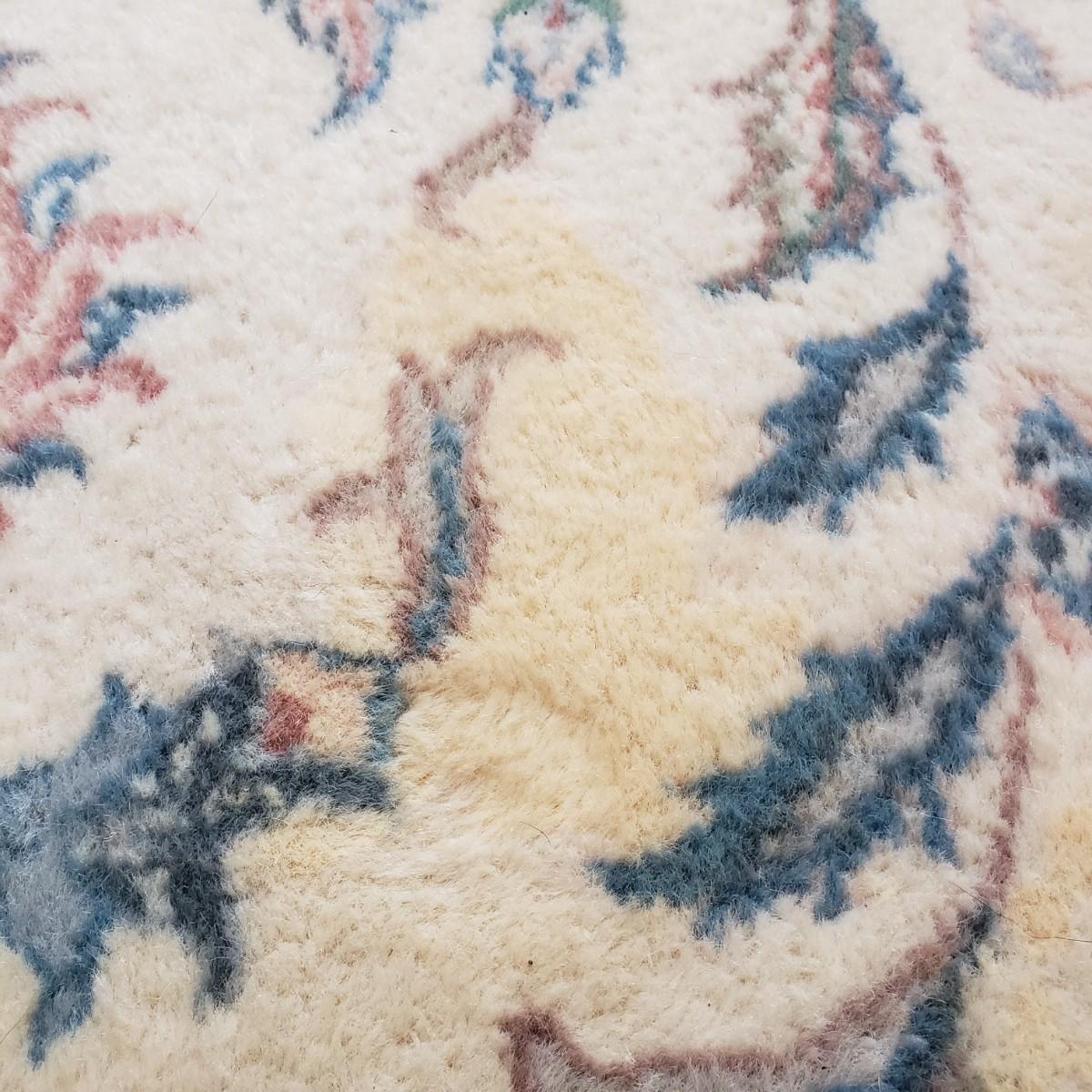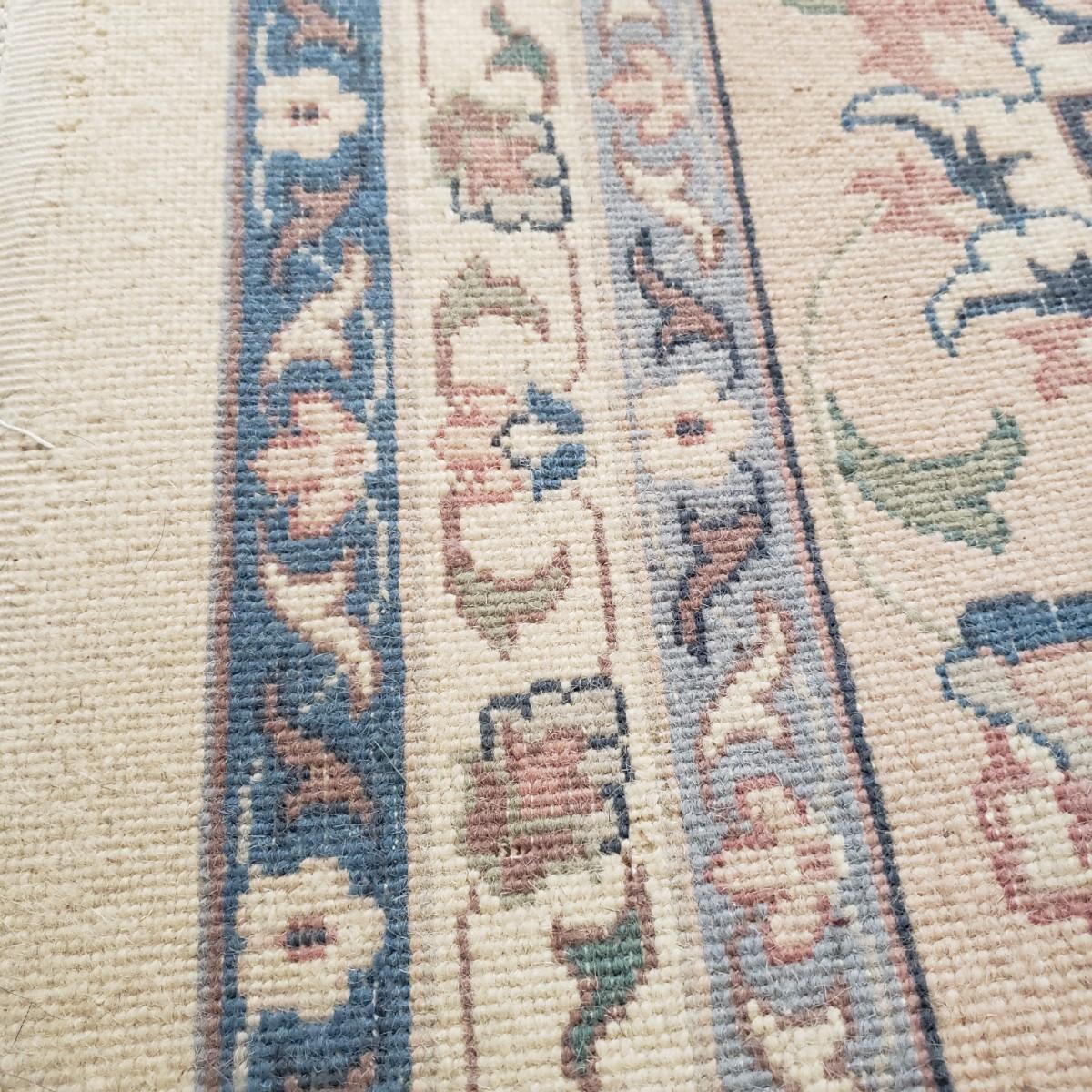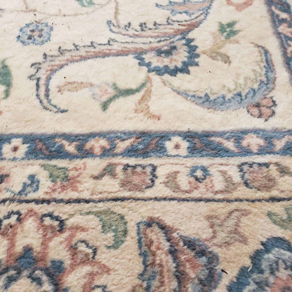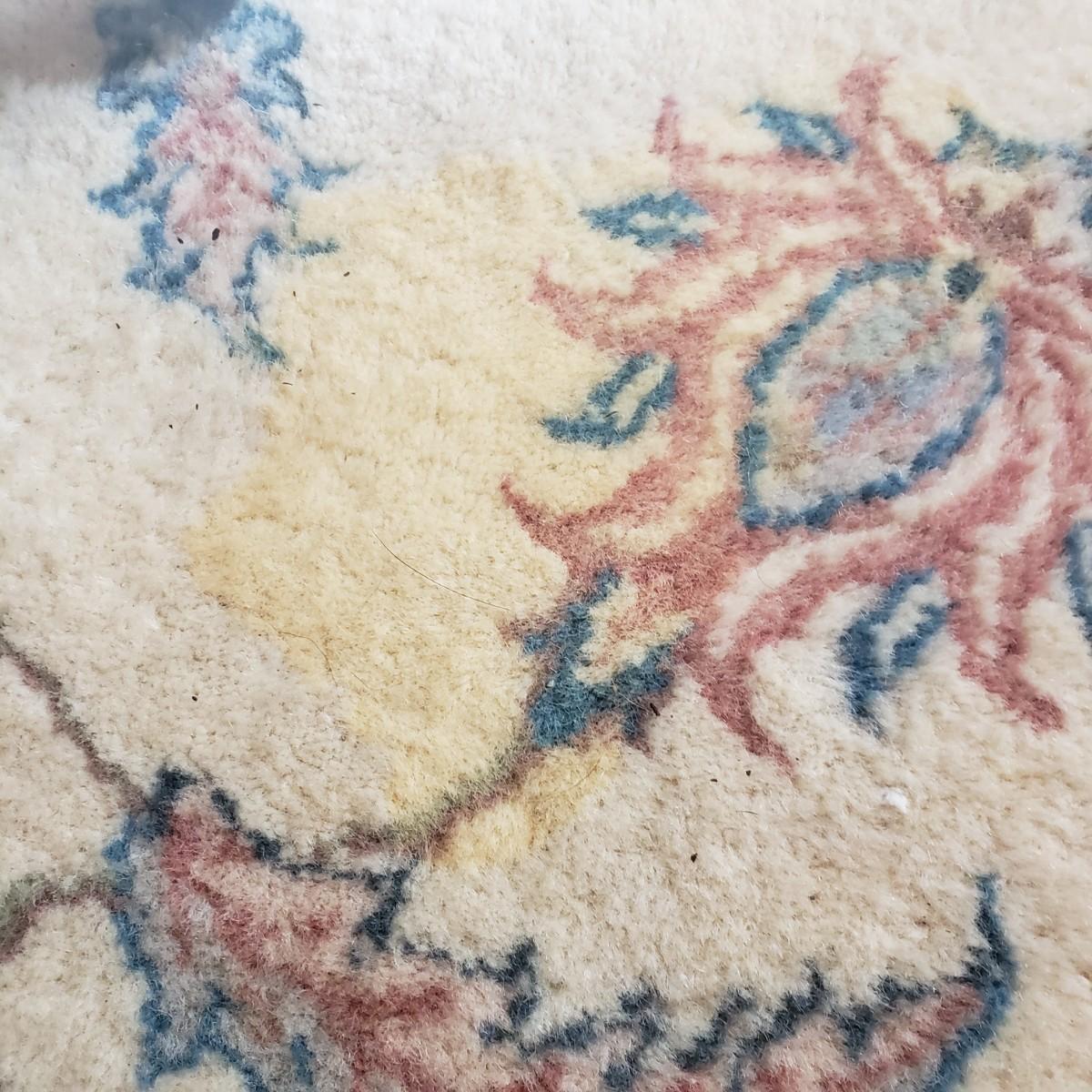 This is a 12' x 9' wool area rug. The colors are ivory, blues, greens and a soft rose. There are some stains and a faint smell, see pictures. From a dog friendly house.
