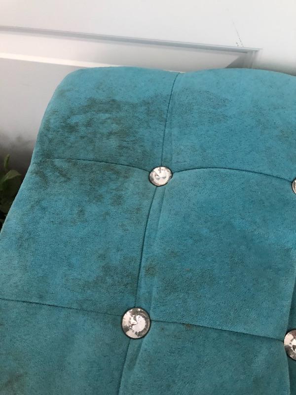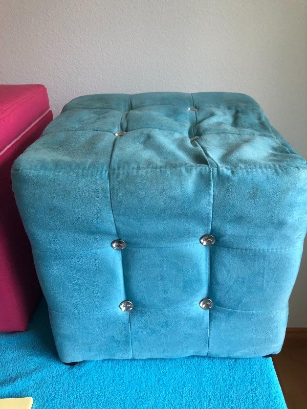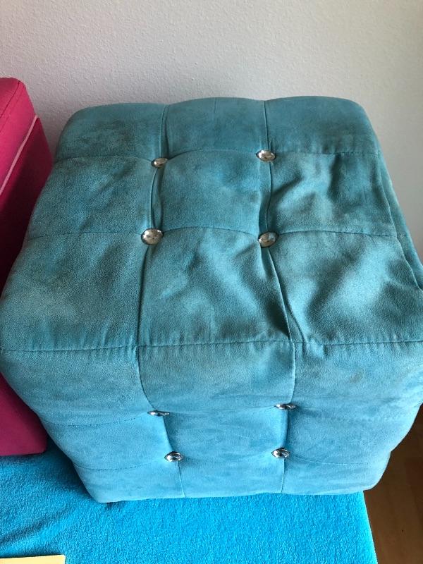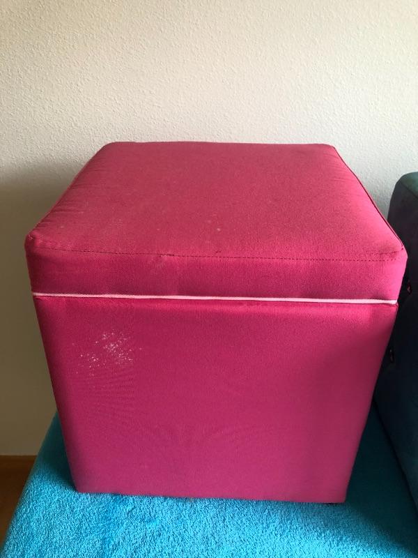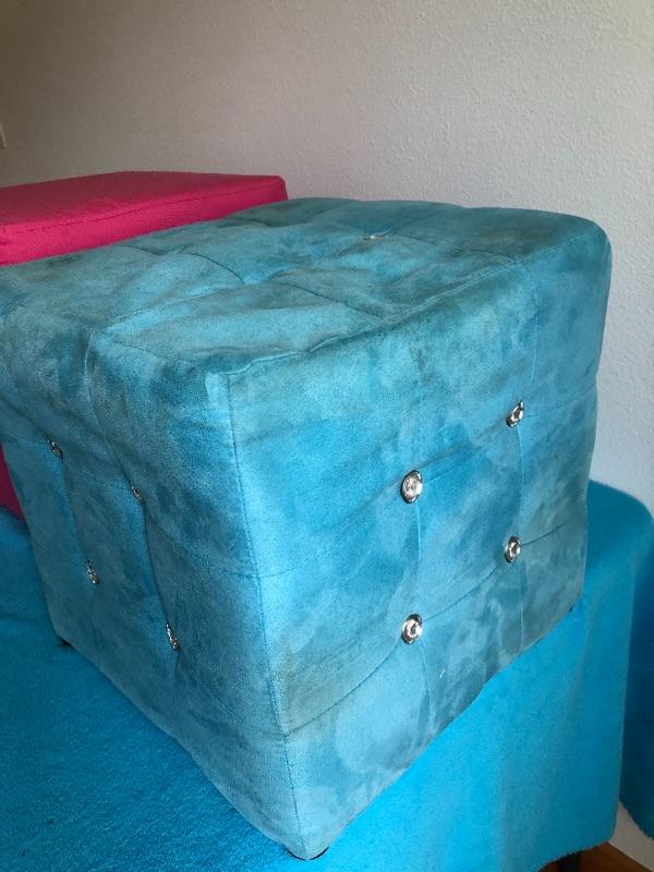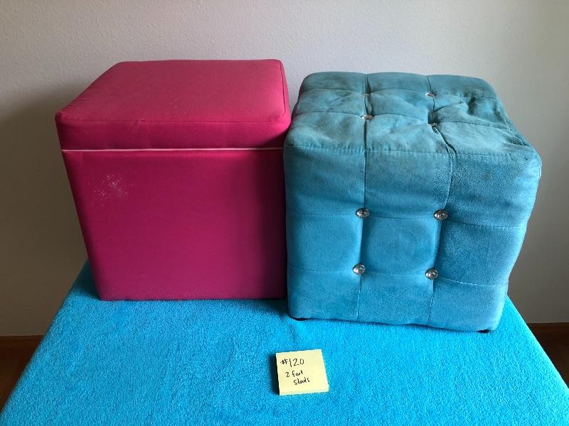 These stools measure apprx. 15 x 14 each. They do need to be cleaned. Pink one has storage. Turquoise one looks a little wrinkled, just needs a little TLC to bring it back to shape.