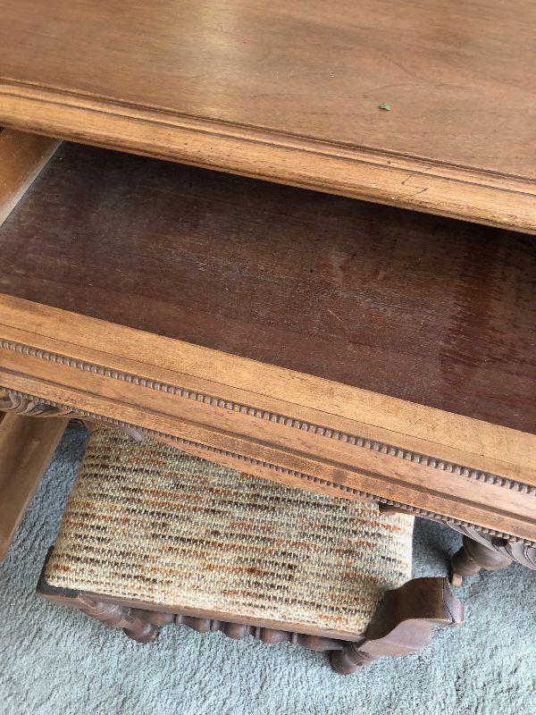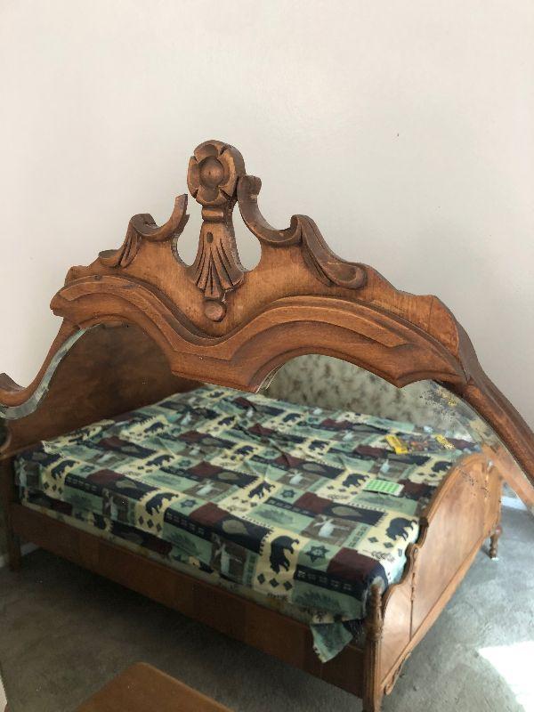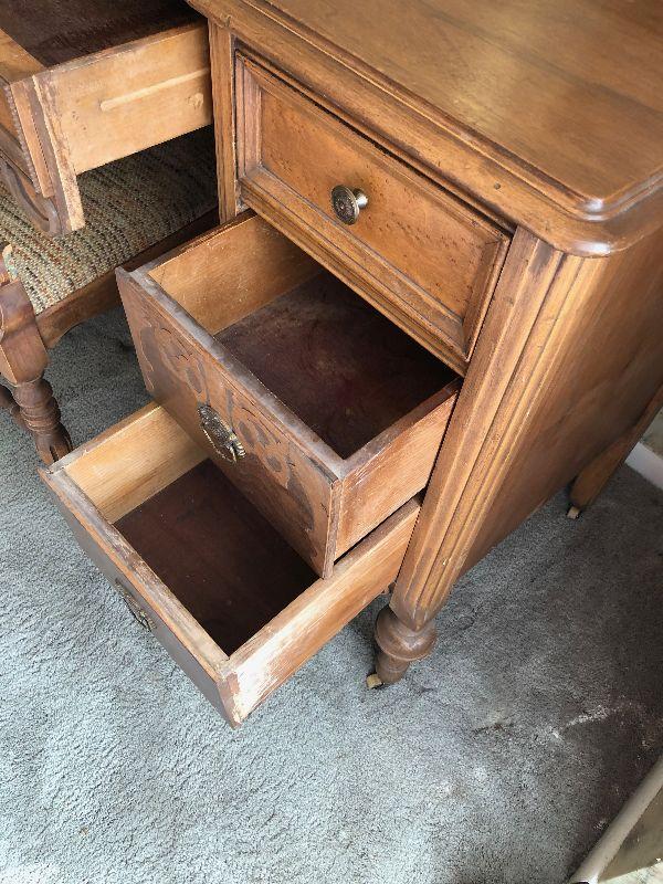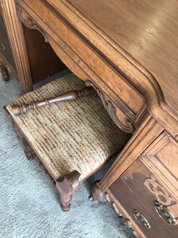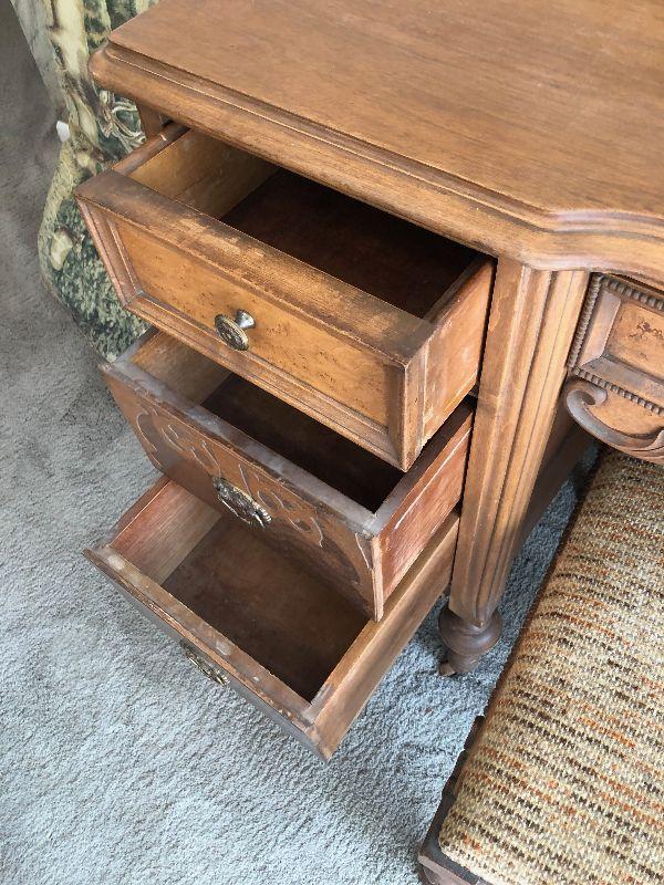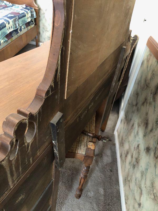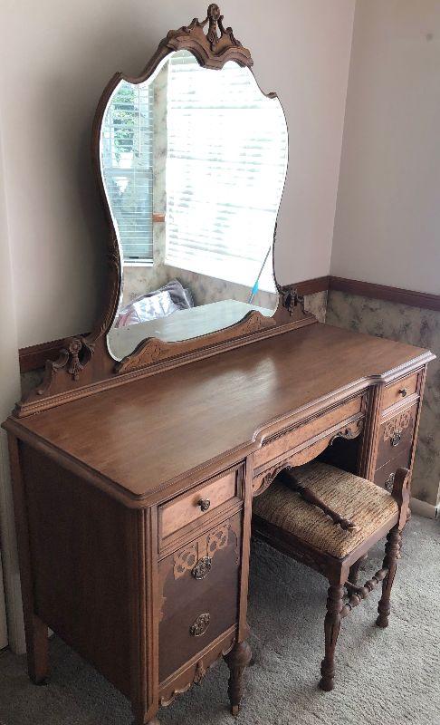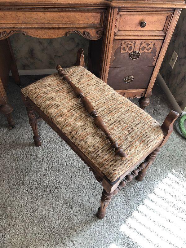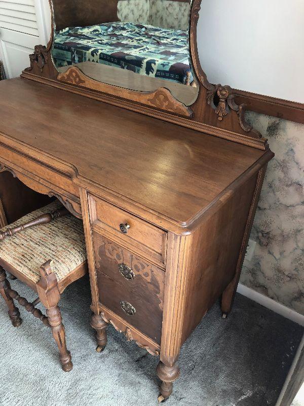 With Stool, Stool has a broken back bar, but could easily be glues. 50 x 19 x 31 Mirror 37" Taller , It has been stripped and refinished with an oil finish.