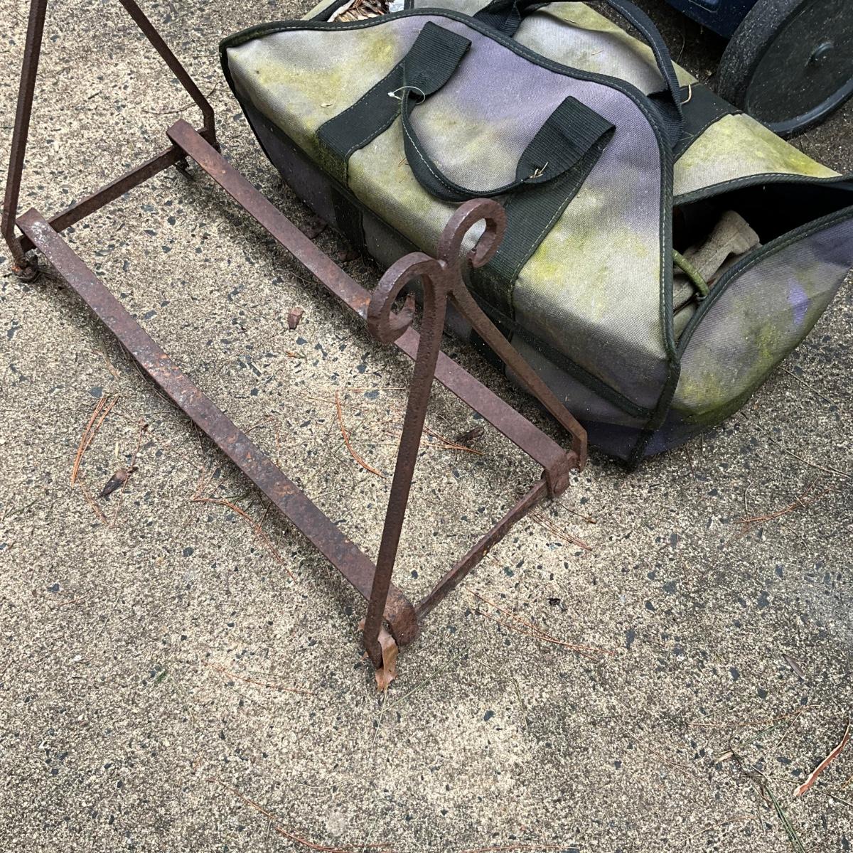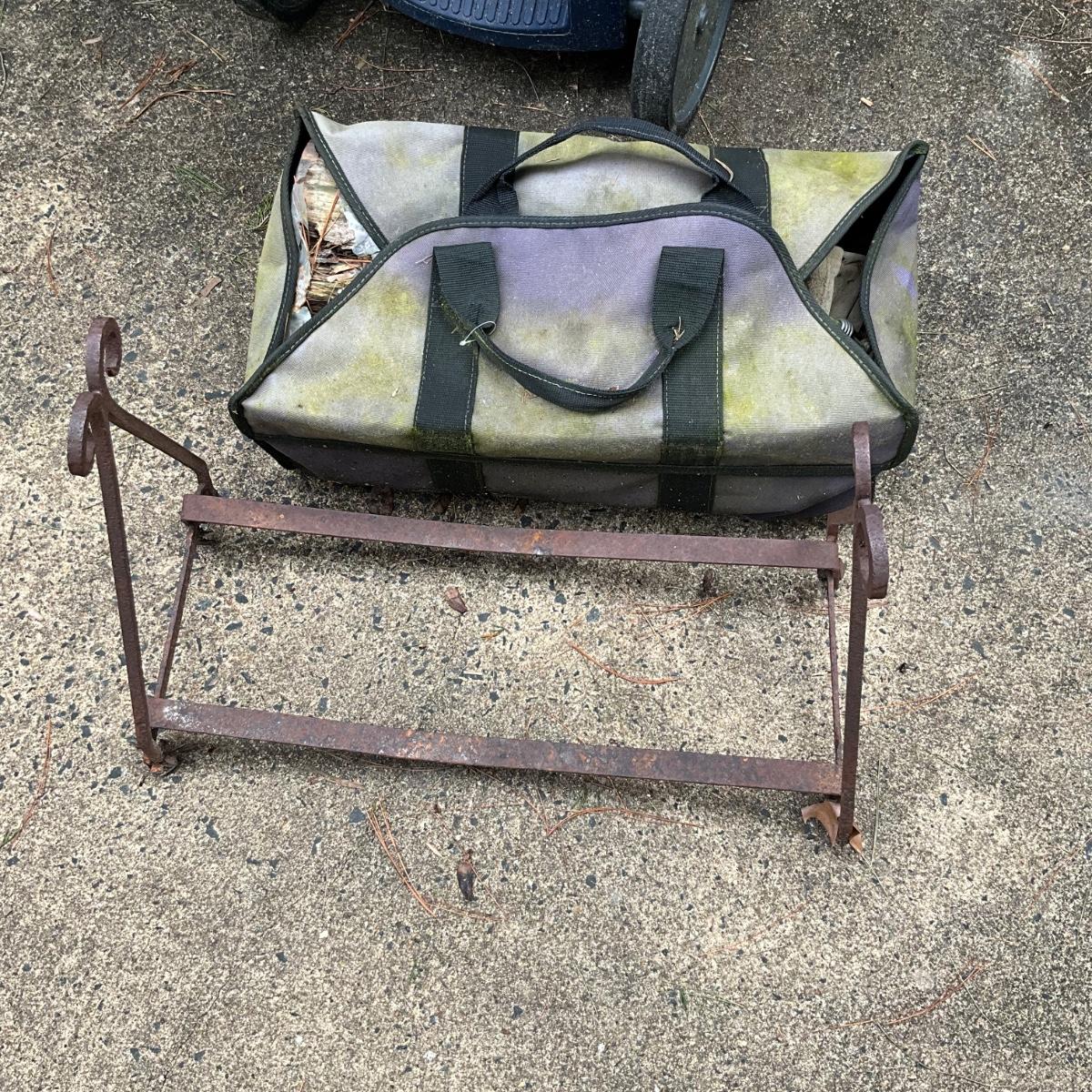 1208 Vintage Metal Firewood Rack with Firewood and Carrier