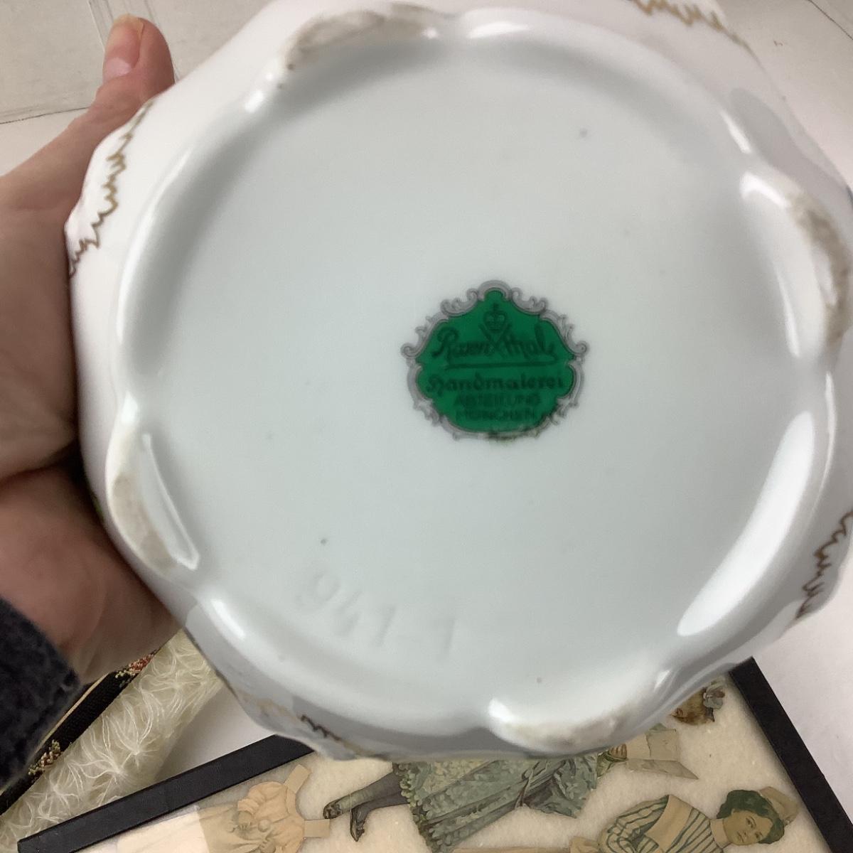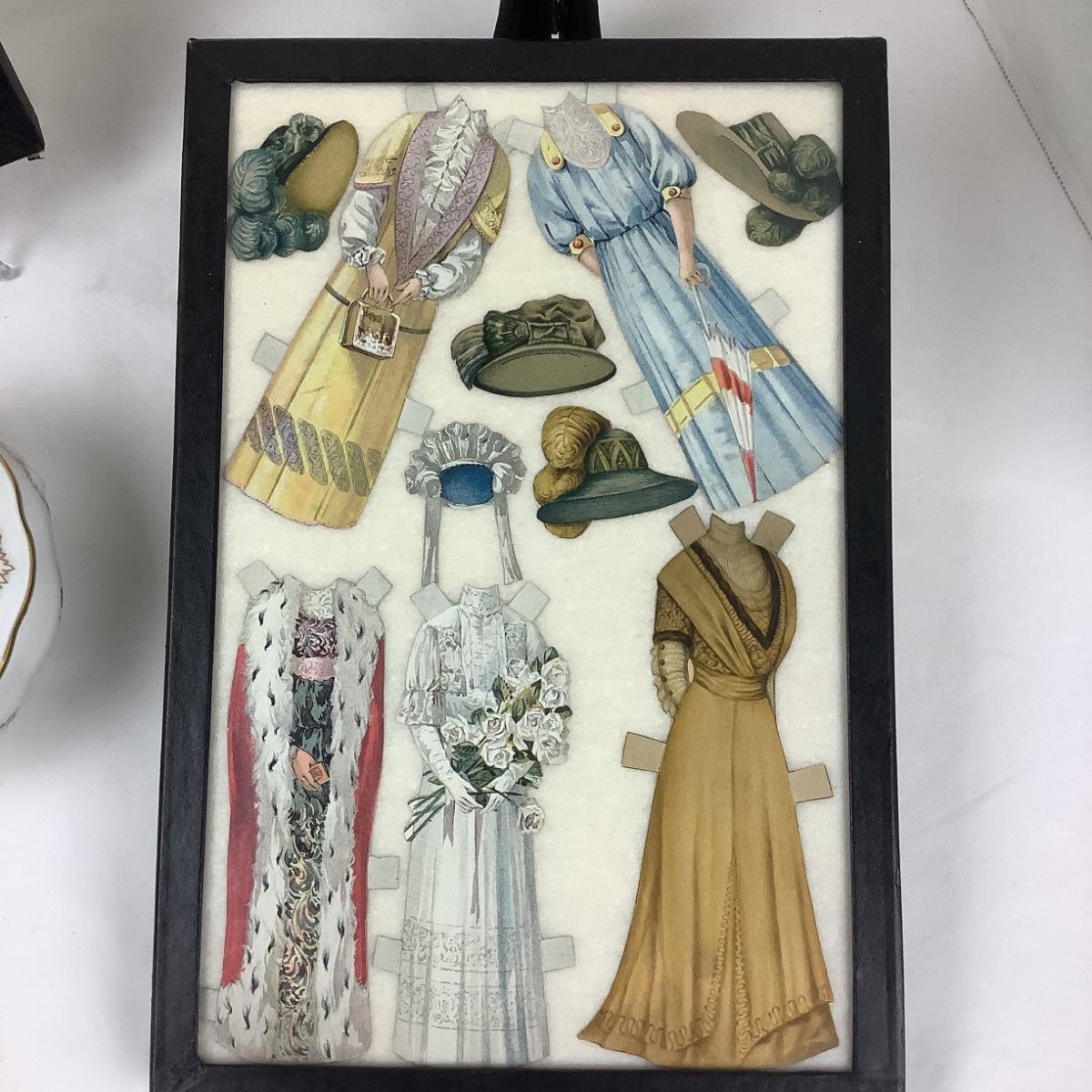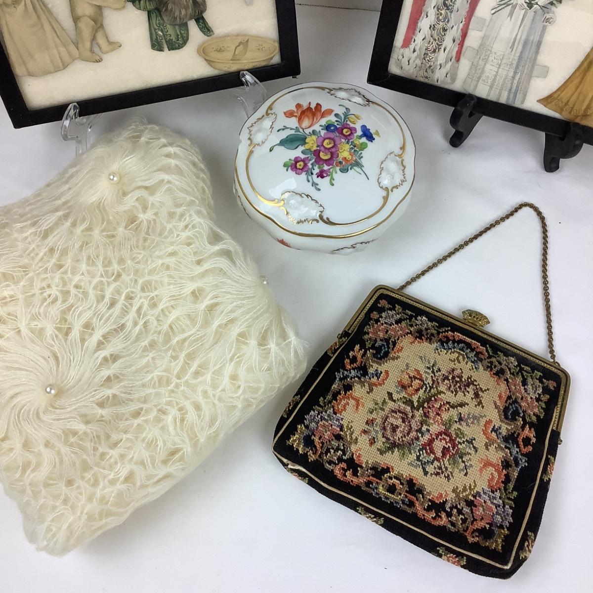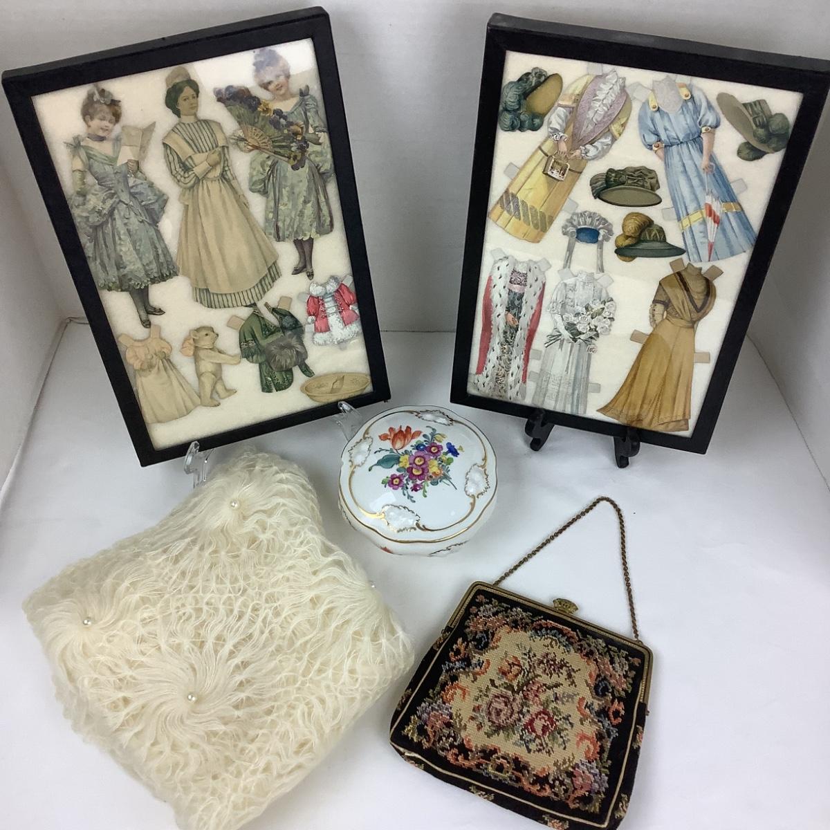 Paper doll displays x 2, Rosenthal dish, needlepoint purse and knit shawl.