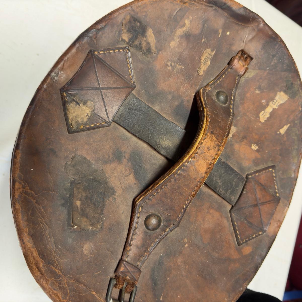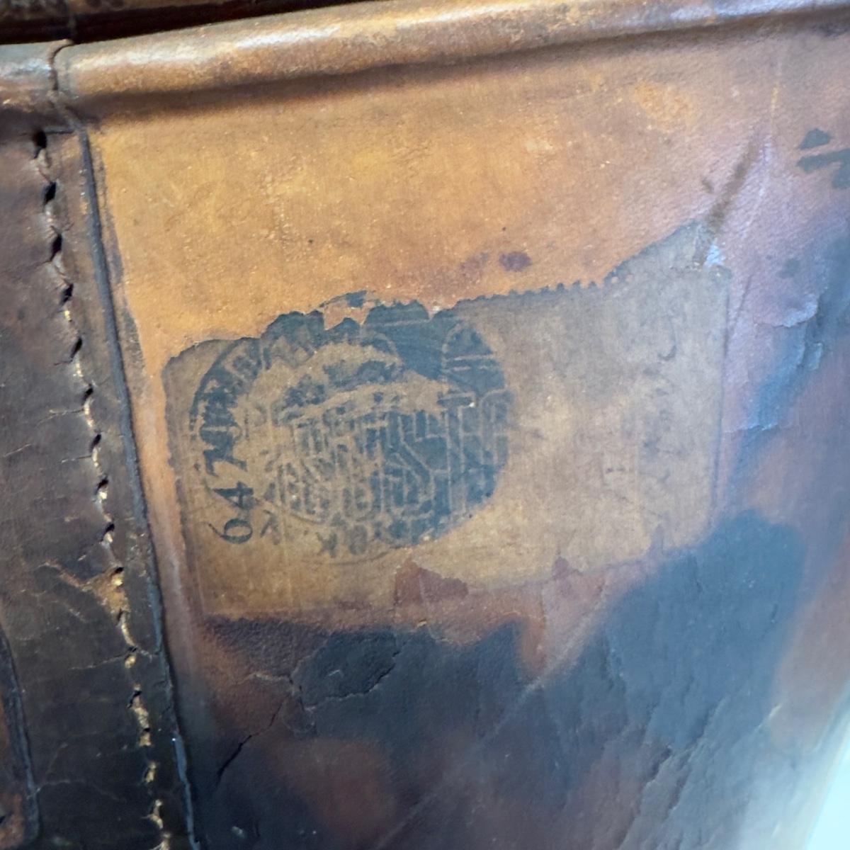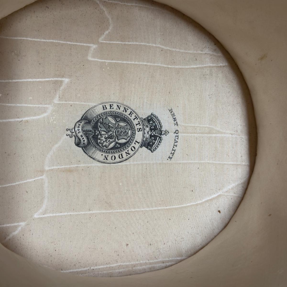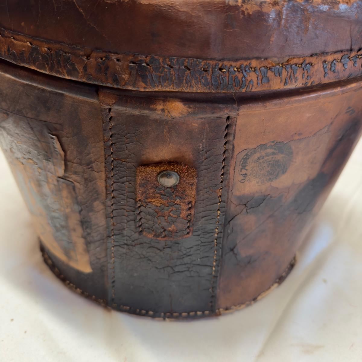 Paris Travel stickers on the leather hat box , the inside leather hinge is inside. Hat is by Bennetts of London size 7