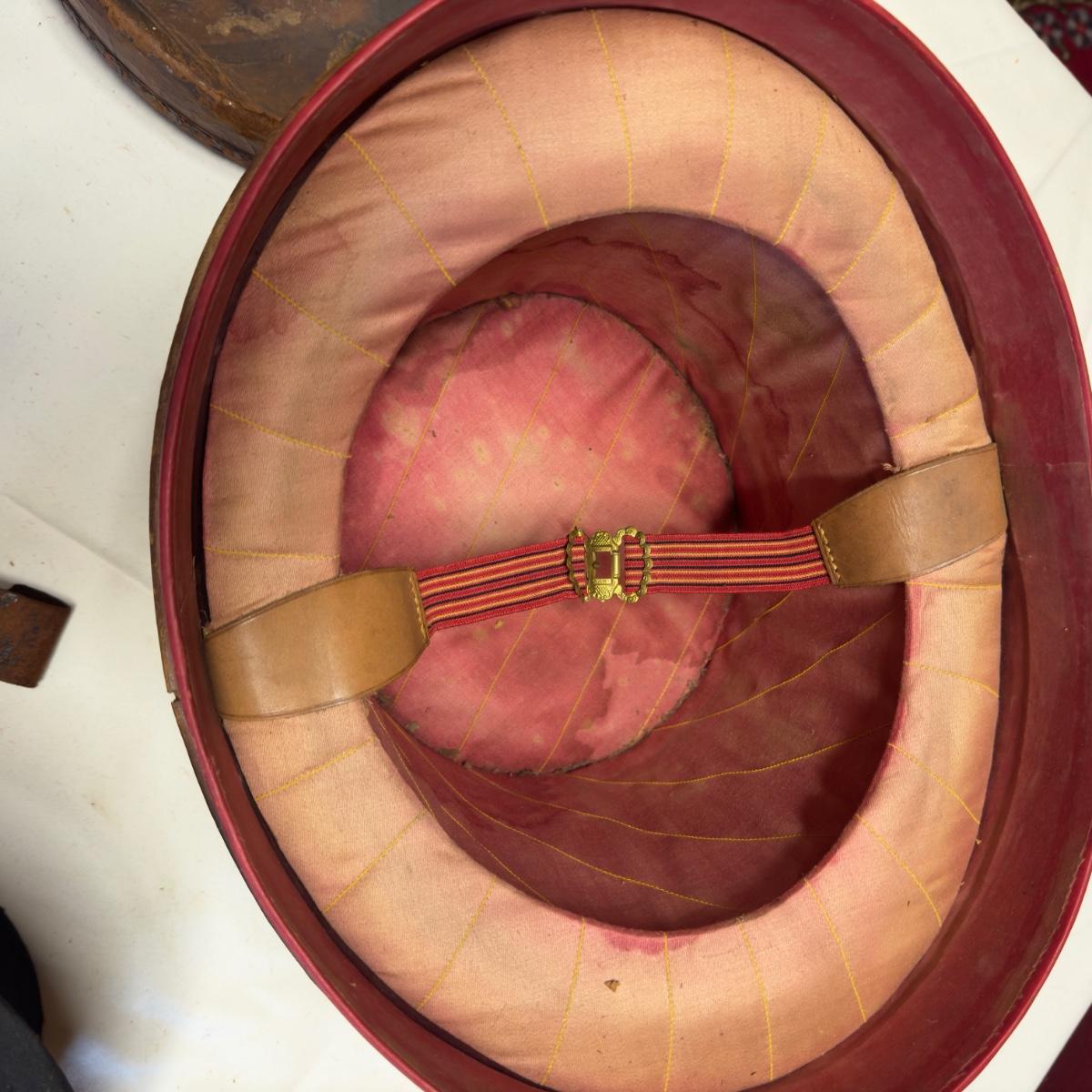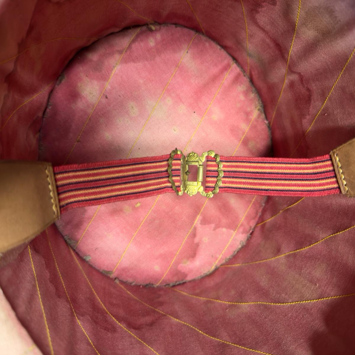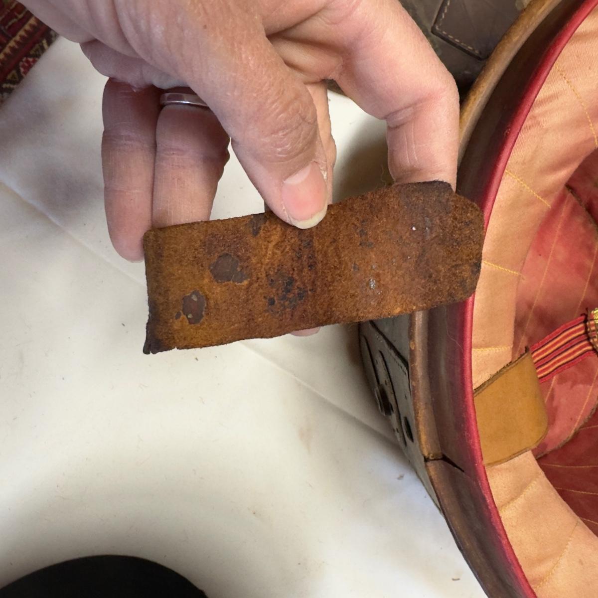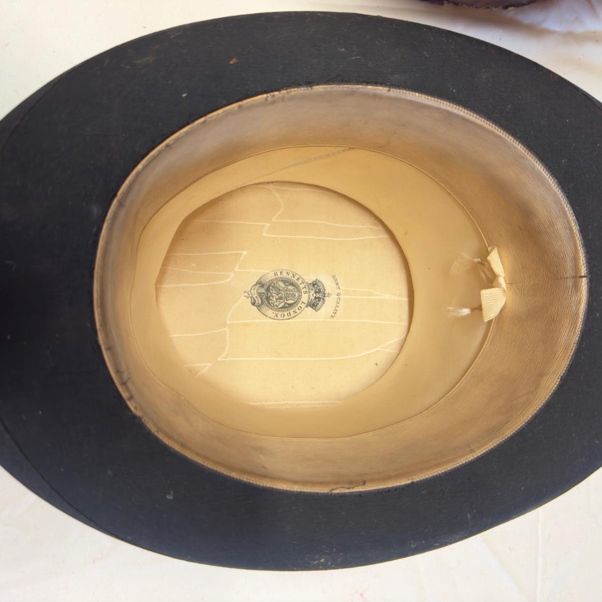 Paris Travel stickers on the leather hat box , the inside leather hinge is inside. Hat is by Bennetts of London size 7
