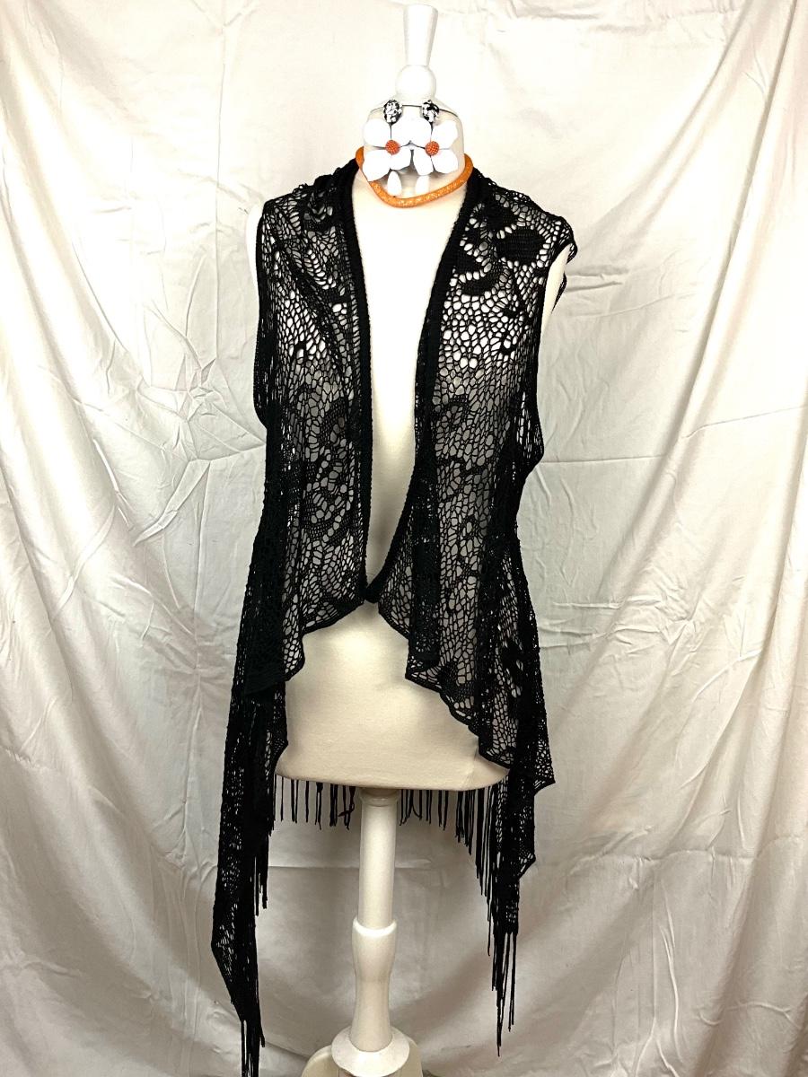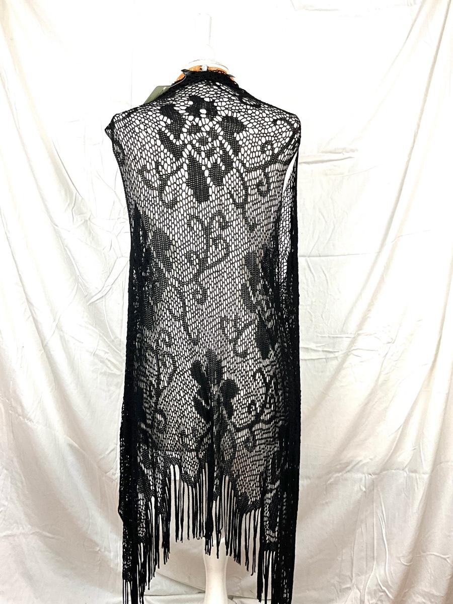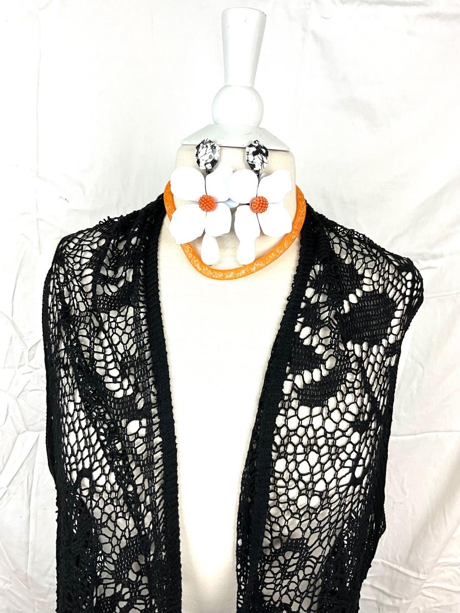 121 Black Floral Crochet Wrap/Shawl with Large Daisy Earrings and Beaded Necklace