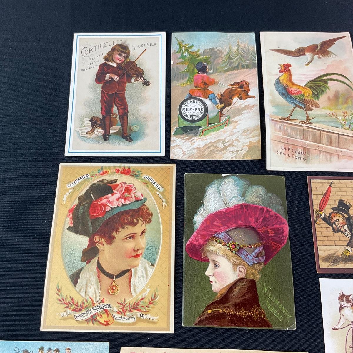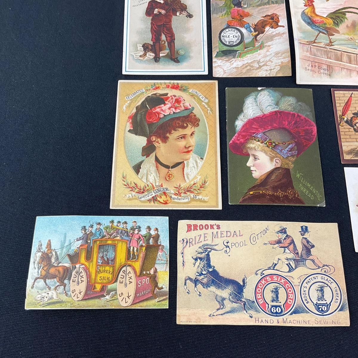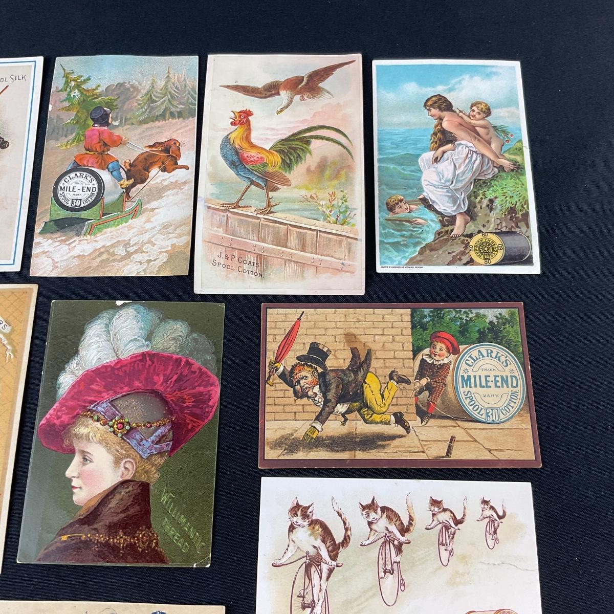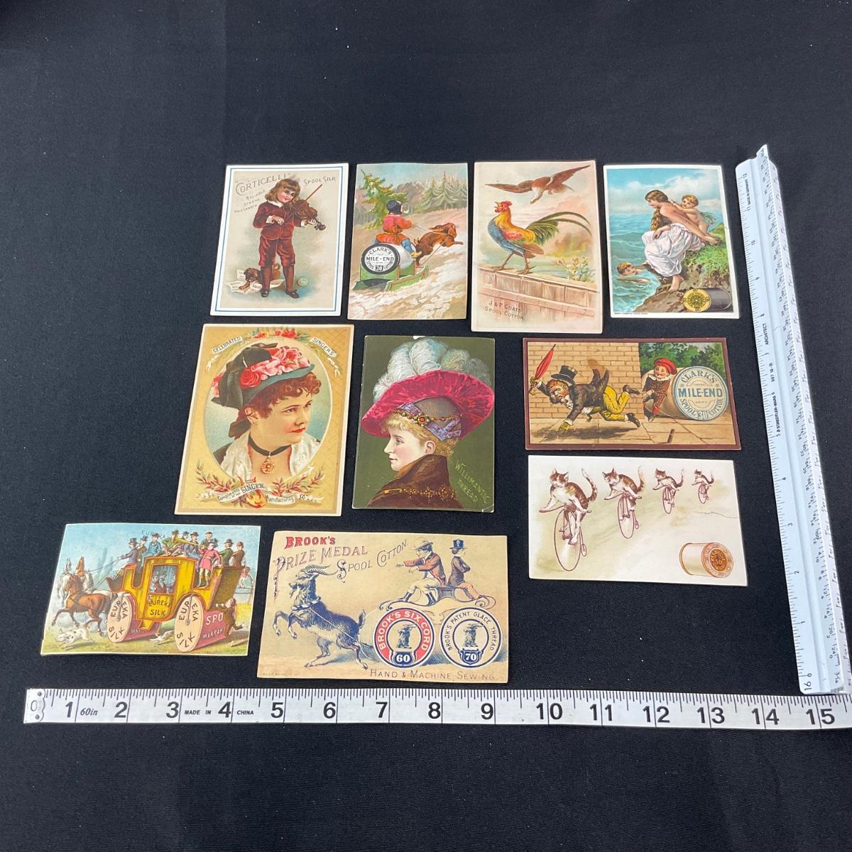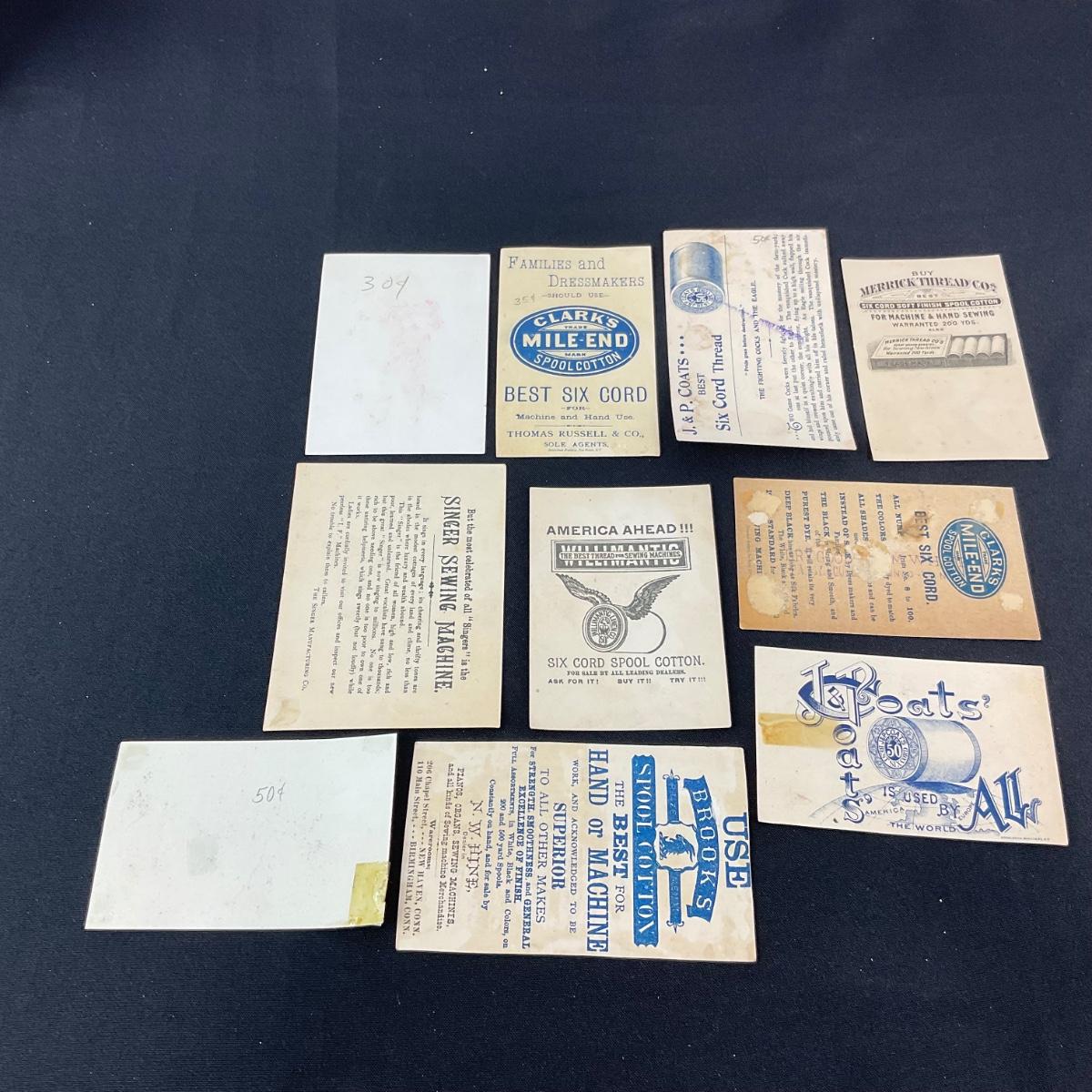 Ten assorted vintage spool and thread advertisements. Please see photos for details and condition. Any condition statement is given as a courtesy to a client, is an opinion, and should not be treated as a statement of fact. Reference to condition written, oral or within a condition report shall not be regarded as a full account of condition and may not include all defects, alterations, or restorations. Absence of a condition report does not imply a lot is flawless or lacking imperfections or damage. Katherine’s Auction & Appraisal Service shall have no responsibility for any error or omission. Returns shall not be accepted on the basis of condition. ::: Shipping is available on this lot. If you require shipping you must let us know at the close of the auction. We will coordinate with you after the item has been won. Shipping fees will include insurance up to or exceeding the value of all items being mailed. If you have any questions regarding this lot please contact the auctioneer either via this website, by direct email or by phone. PICK UP TIMES and other important information can be found in the TERMS and DESCRIPTION of the auction. Please take a look for pertinent information. Thanks!