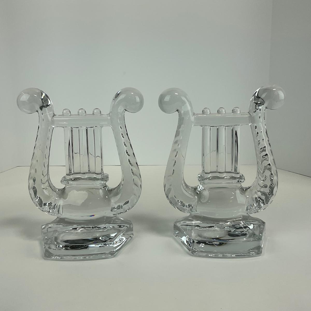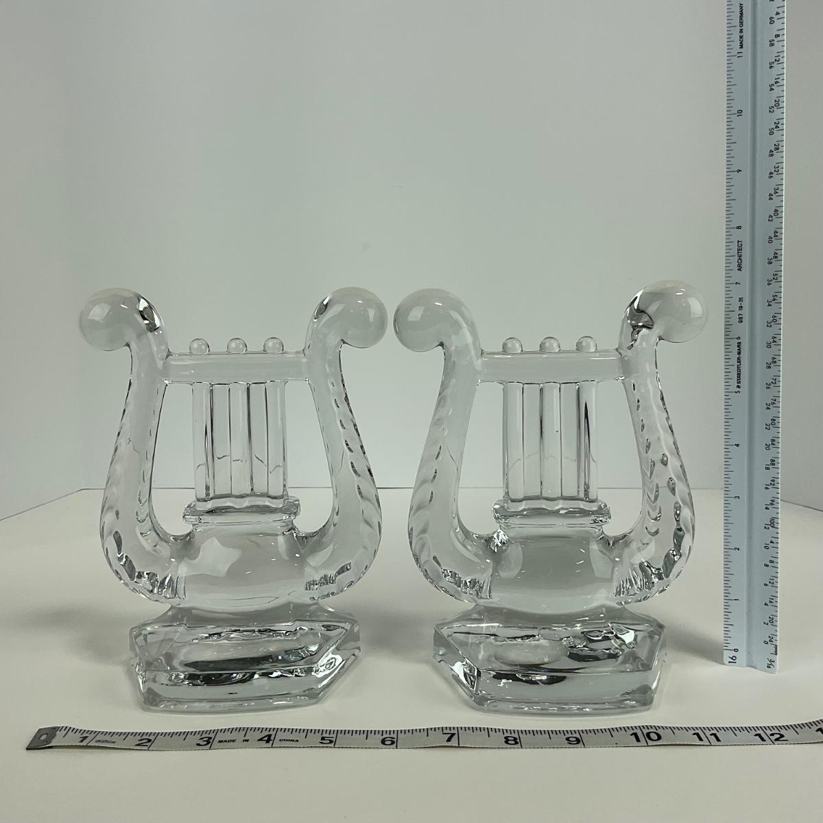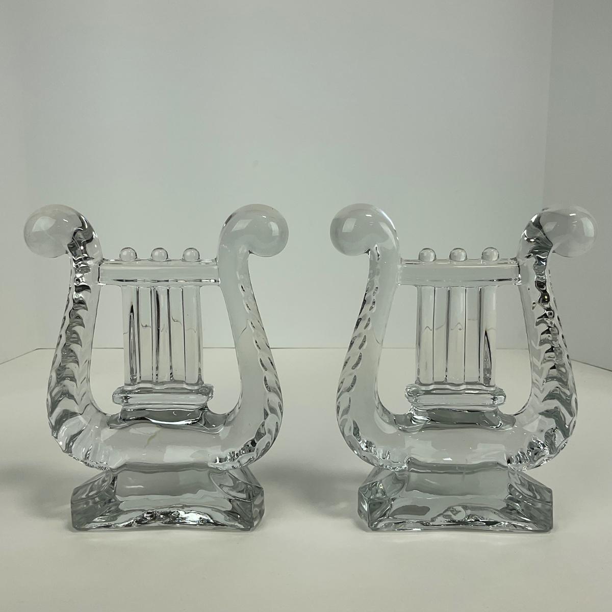 Two vintage clear glass Fostoria harp lyre bookends. This piece has no damage, and appears to be in great shape with no visable chips, cracks, or broken pieces. Please see photos for details and condition. Any condition statement is given as a courtesy to a client, is an opinion, and should not be treated as a statement of fact. Reference to condition written, oral or within a condition report shall not be regarded as a full account of condition and may not include all defects, alterations, or restorations. Absence of a condition report does not imply a lot is flawless or lacking imperfections or damage. Katherine’s Auction & Appraisal Service shall have no responsibility for any error or omission. Returns shall not be accepted on the basis of condition. ::: Shipping is available on this lot. If you require shipping you must let us know at the close of the auction. We will coordinate with you after the item has been won. Shipping fees will include insurance up to or exceeding the value of all items being mailed. If you have any questions regarding this lot please contact the auctioneer either via this website, by direct email or by phone. PICK UP TIMES and other important information can be found in the TERMS and DESCRIPTION of the auction. Please take a look for pertinent information. Thanks!