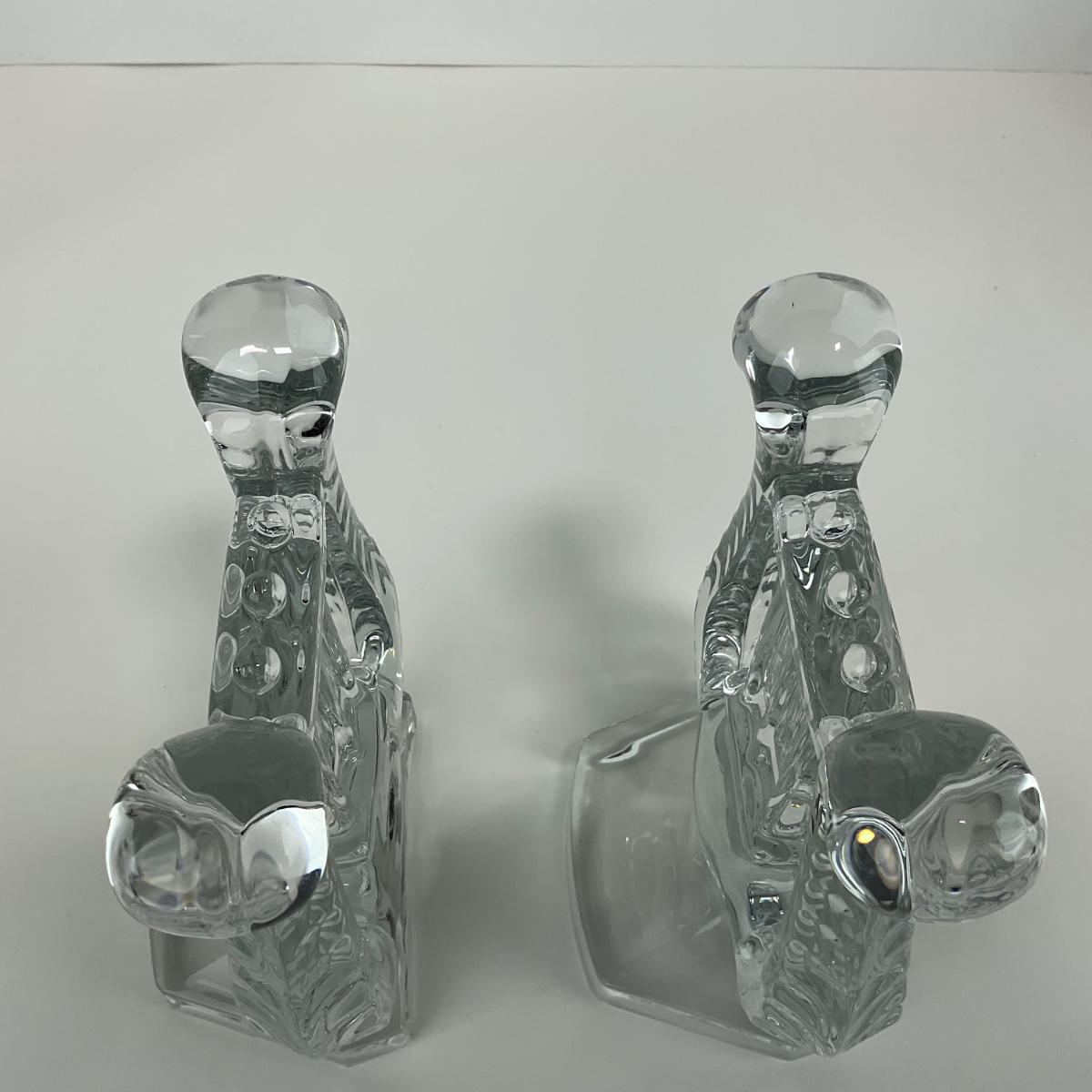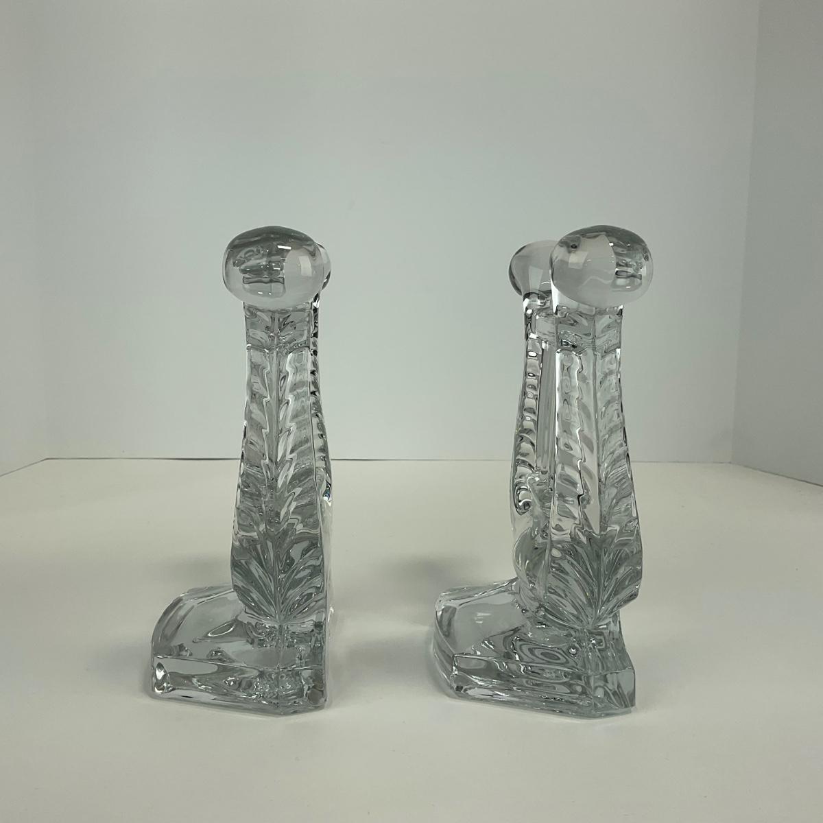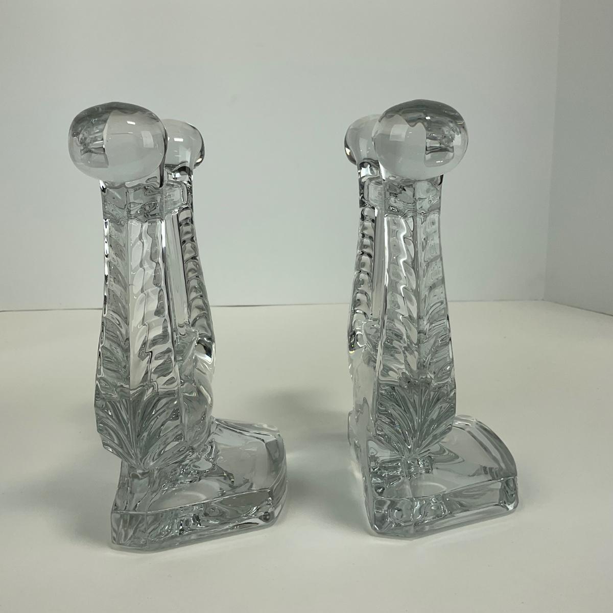 Two vintage clear glass Fostoria harp lyre bookends. This piece has no damage, and appears to be in great shape with no visable chips, cracks, or broken pieces. Please see photos for details and condition. Any condition statement is given as a courtesy to a client, is an opinion, and should not be treated as a statement of fact. Reference to condition written, oral or within a condition report shall not be regarded as a full account of condition and may not include all defects, alterations, or restorations. Absence of a condition report does not imply a lot is flawless or lacking imperfections or damage. Katherine’s Auction & Appraisal Service shall have no responsibility for any error or omission. Returns shall not be accepted on the basis of condition. ::: Shipping is available on this lot. If you require shipping you must let us know at the close of the auction. We will coordinate with you after the item has been won. Shipping fees will include insurance up to or exceeding the value of all items being mailed. If you have any questions regarding this lot please contact the auctioneer either via this website, by direct email or by phone. PICK UP TIMES and other important information can be found in the TERMS and DESCRIPTION of the auction. Please take a look for pertinent information. Thanks!
