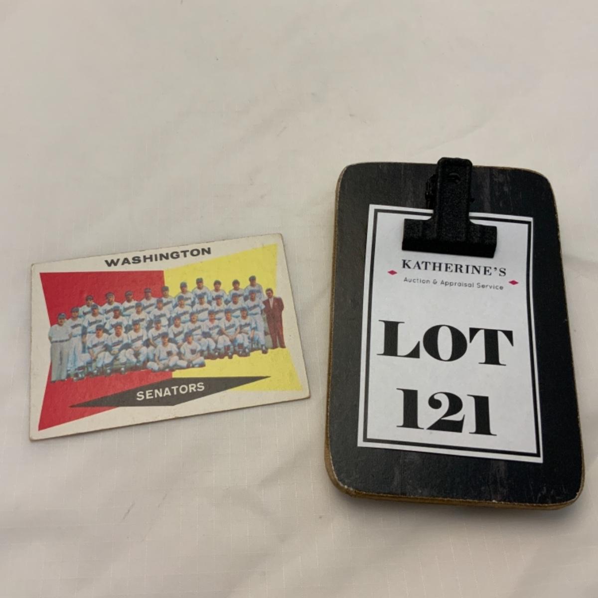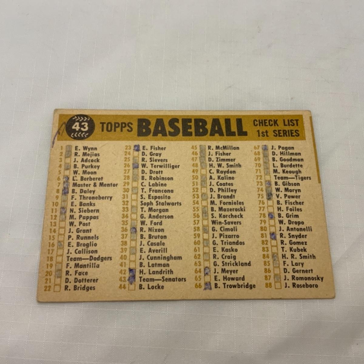 Excellent Baseball Card from TOPPS 1960 series. Card #43 in the series features the Washington Senators on the front (with Harmon Killebrew in the picture) and a check list on the reverse. Part of the check list has been filled in by the original owner and his brother. Please see photos for details and condition. ::: Shipping is available on this lot. If you require shipping you must let us know at the close of the auction. We will coordinate with you after the item has been won. Shipping fees will include insurance up to or exceeding the value of all items being mailed. If you have any questions regarding this lot please contact the auctioneer either via this website, by direct email or by phone. PICK UP TIMES and other important information can be found in the TERMS and DESCRIPTION of the auction. Please take a look for pertinent information. Thanks!