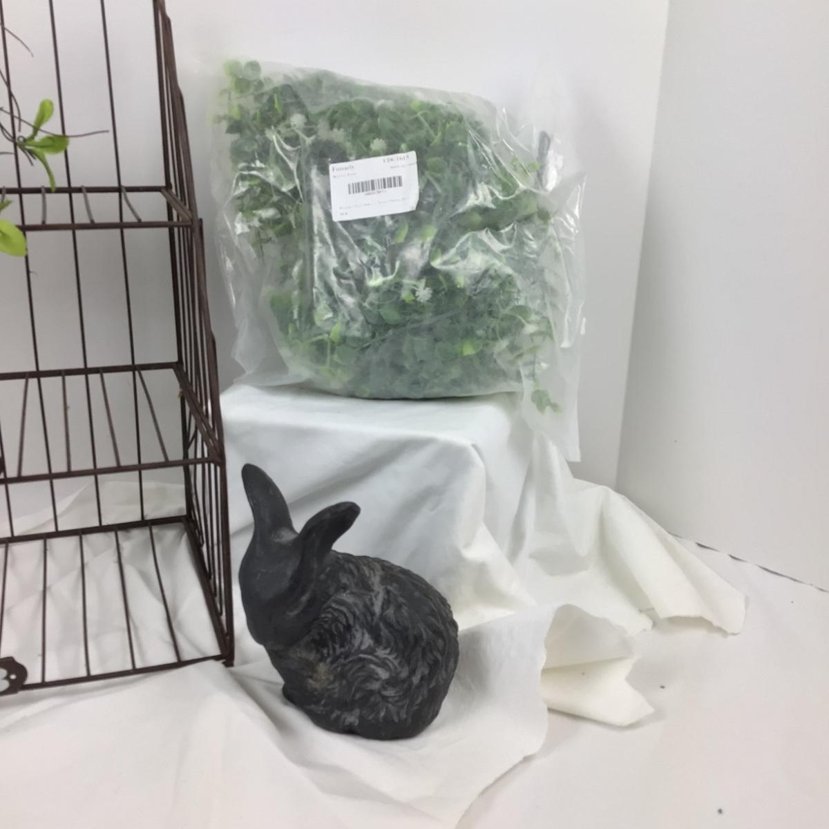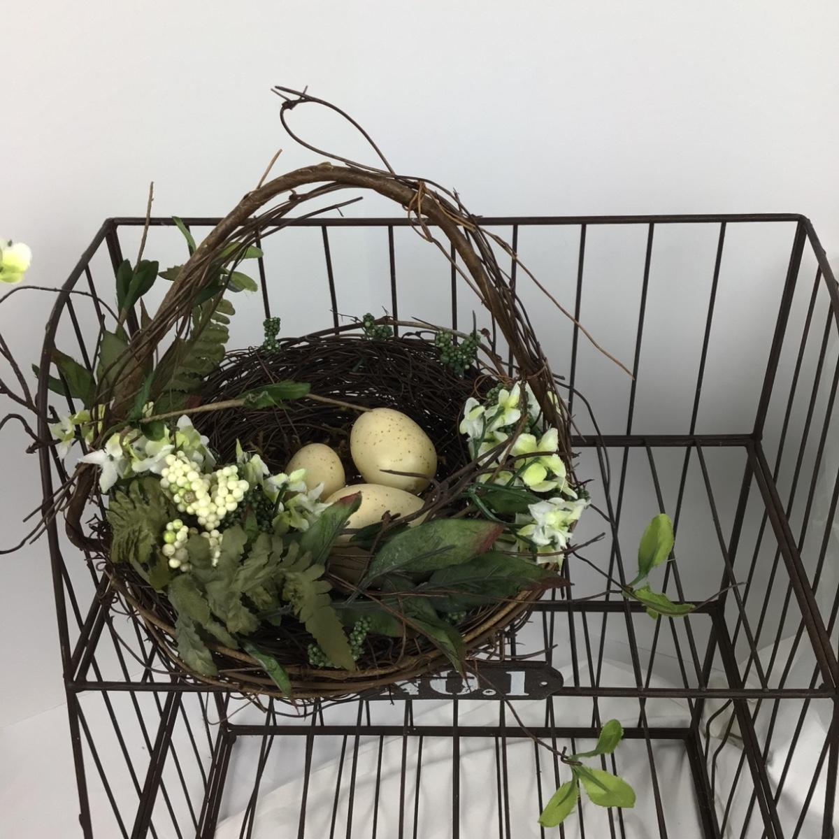 Artificial Eggs Nest Basket with Garland, Composite Bunny Statue , Three tier Wire Shelf measuring 15.5” high x 13” wide x 8.5” deep