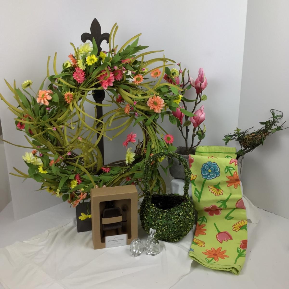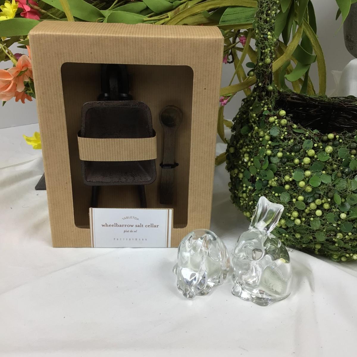 Wreath Measuring 15” round , with moss basket, small cement style composite planter 10” w x 4” deep x 4” high , glass salt and pepper bunnies, pottery bard wheelbarrow salt cellar