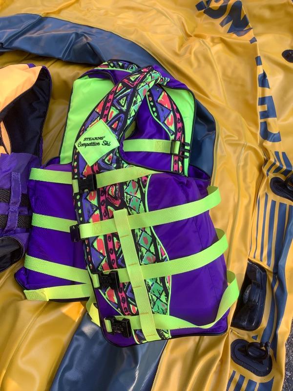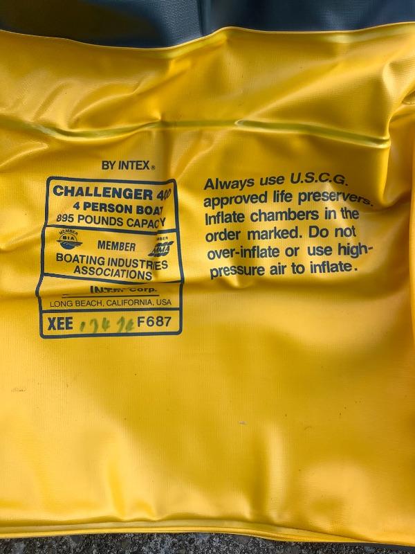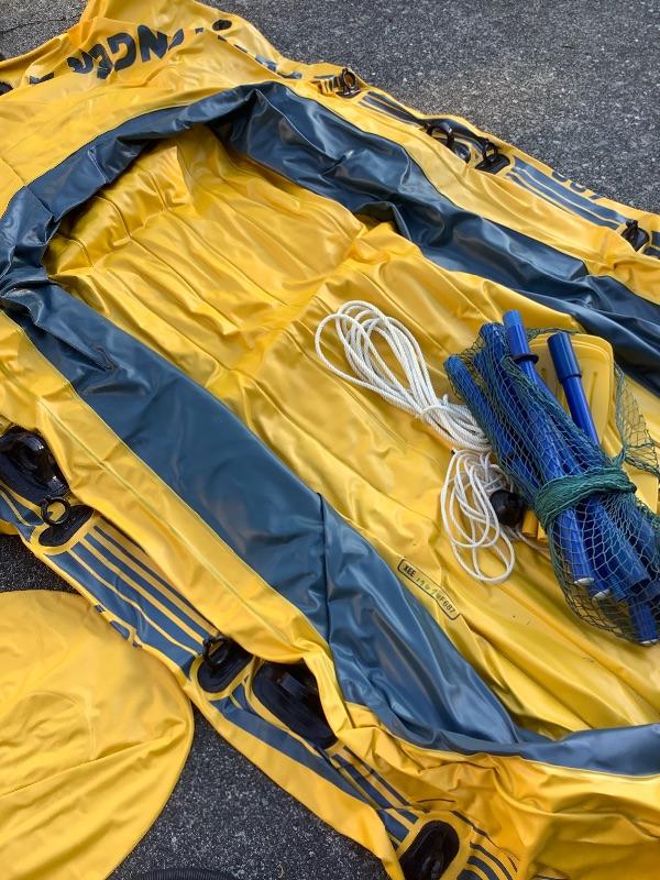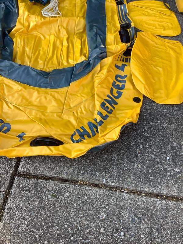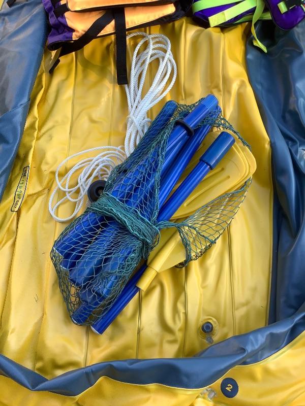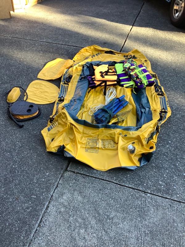 4 person raft with 2 life vests, oars, and inflation pump. Has not been tested but appears to be in good condition