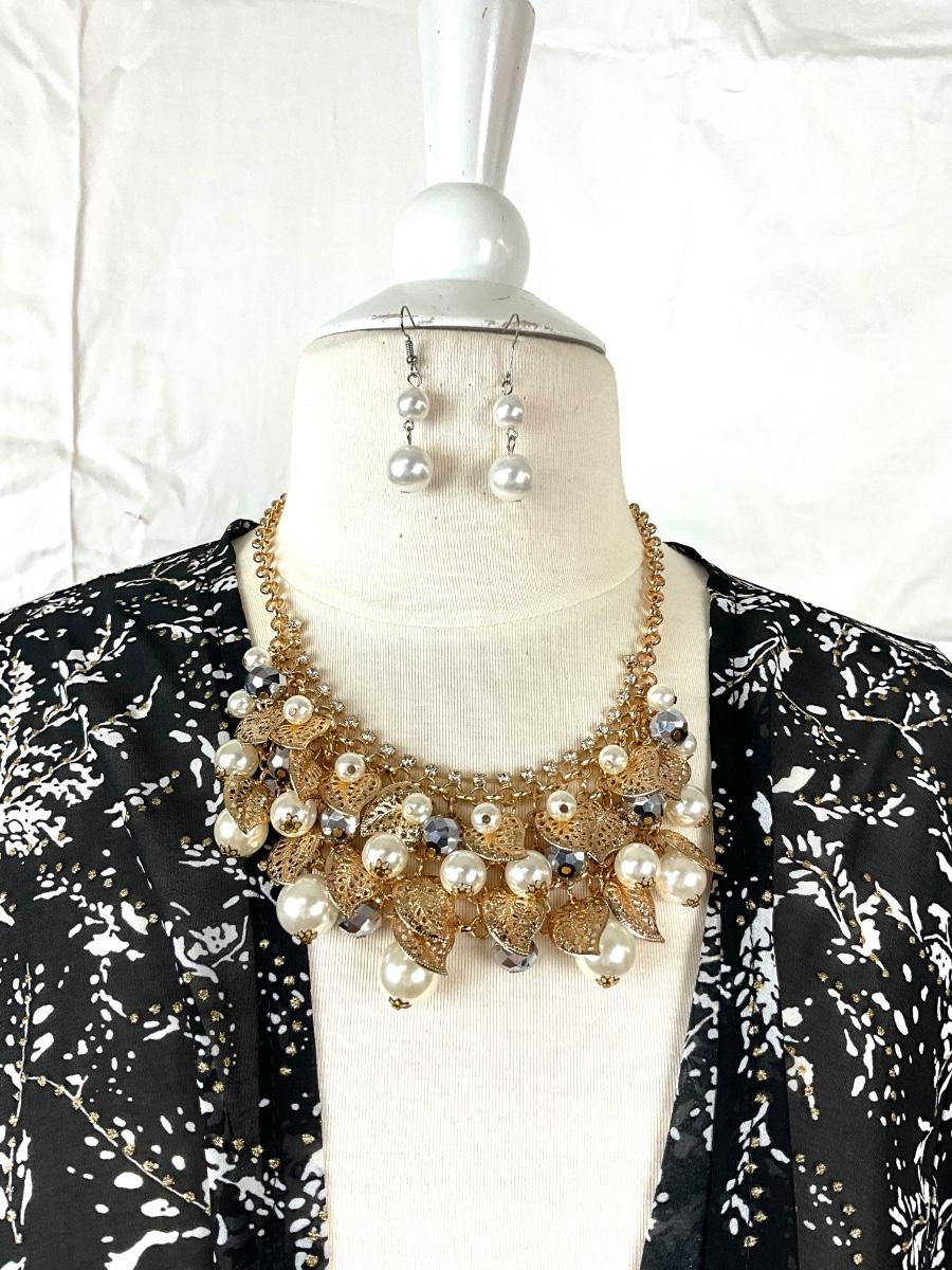 Black and white wrap/ cover up with gold accents, Large statement necklace with gold and pearls with pearl earrings