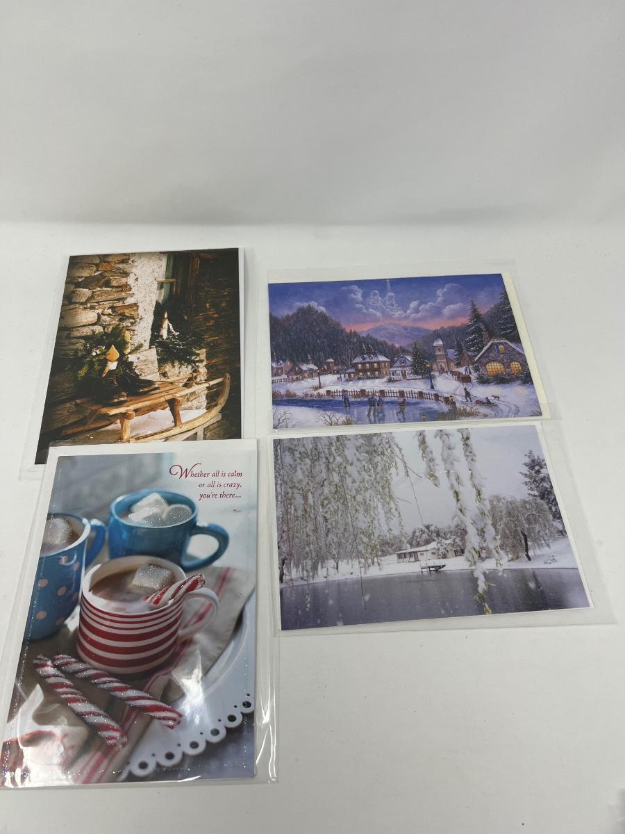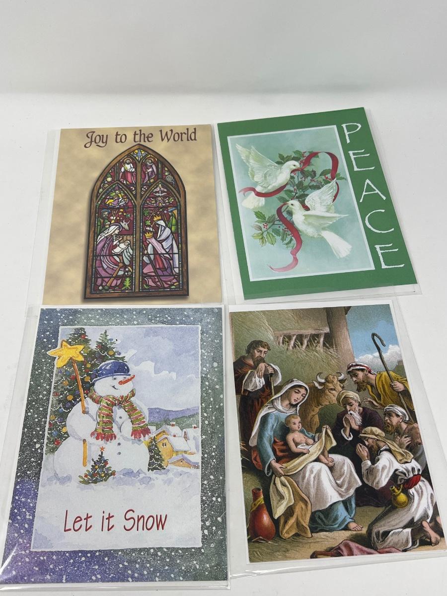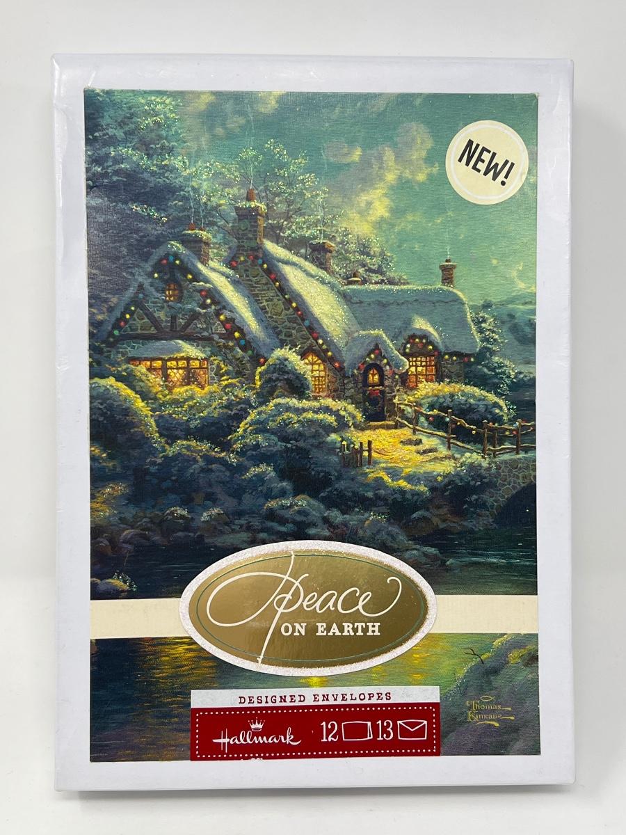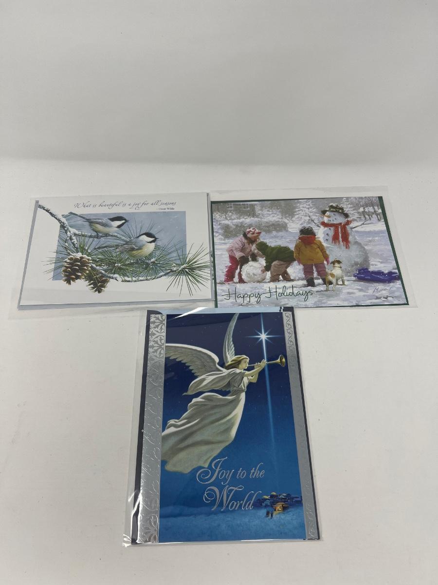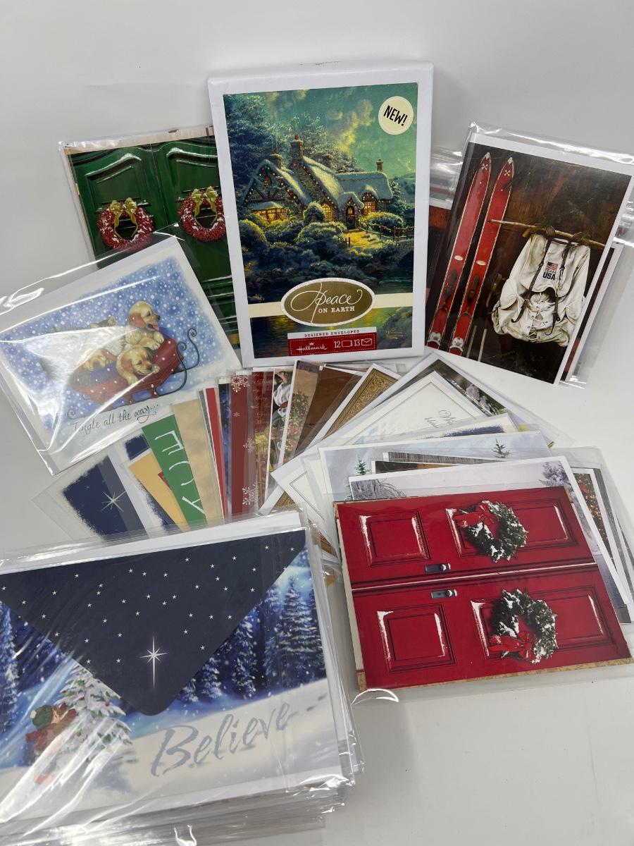 A variety of Brand new greeting cards fir the Christmas season. Each card has an envelope and are inserted in a clear plastic cover. Box of Thomas Kinkade cards has not been opened.