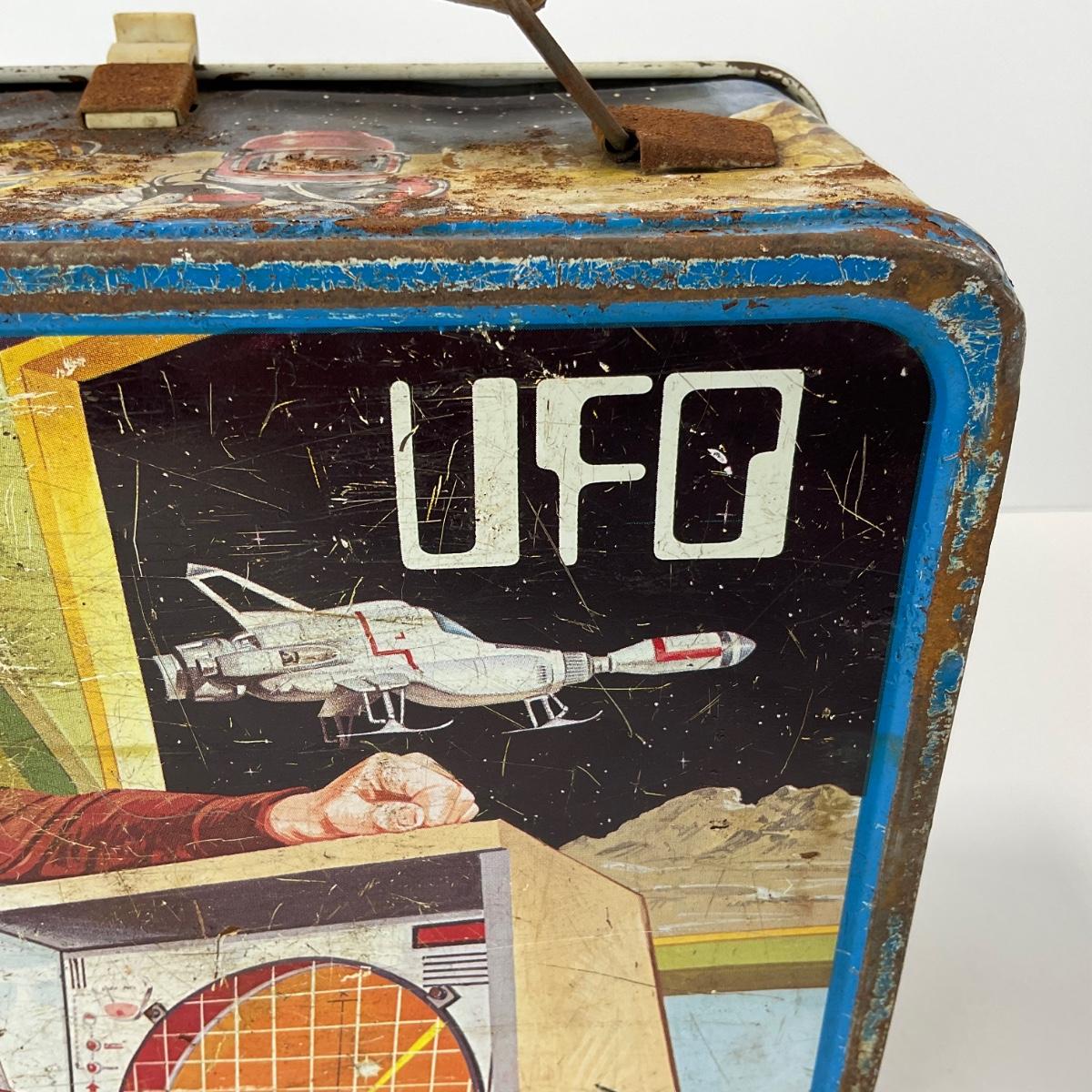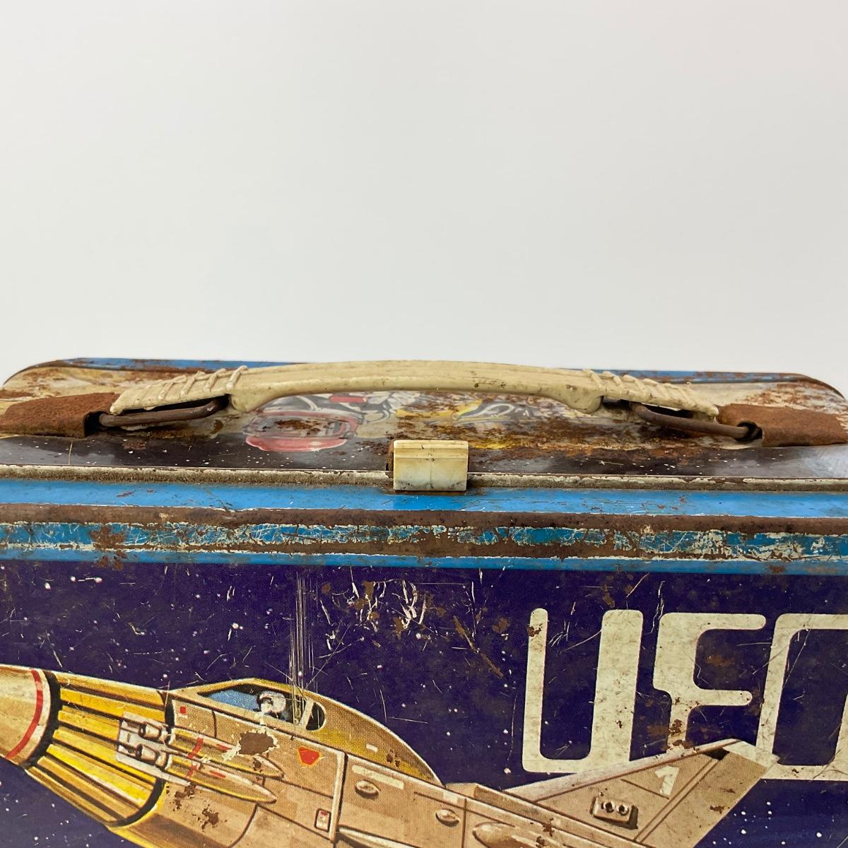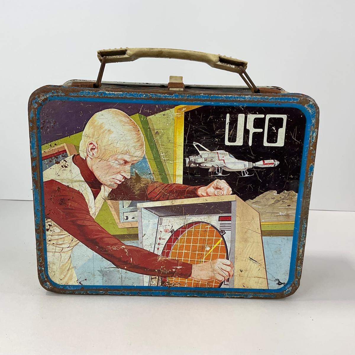 One vintage UFO space metal lunch box NO THERMOS, in rough condition with rust and some damage, but awesome subject matter. Please see photos for details and condition. ::: Shipping is available on this lot. If you require shipping you must let us know at the close of the auction. We will coordinate with you after the item has been won. Shipping fees will include insurance up to or exceeding the value of all items being mailed. If you have any questions regarding this lot please contact the auctioneer either via this website, by direct email or by phone. PICK UP TIMES and other important information can be found in the TERMS and DESCRIPTION of the auction. Please take a look for pertinent information. Thanks!