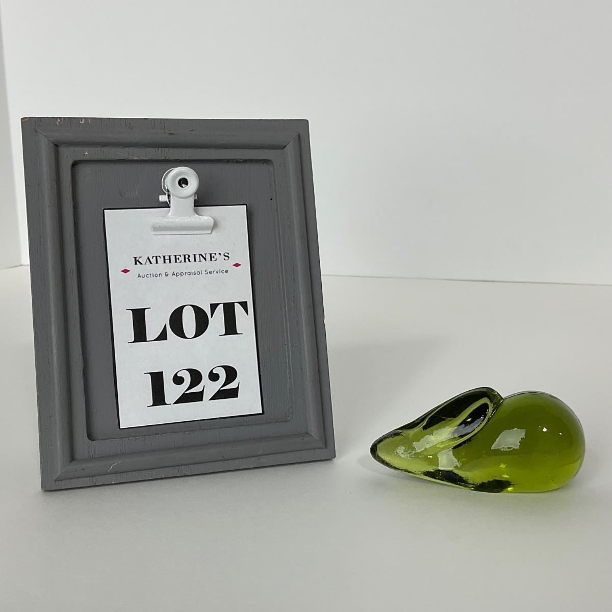 One marked green Fostoria glass rabbit figure. 1 1/4 inches tall by 3 inches long. This piece has no damage, and appears to be in great shape with no visable chips, cracks, or broken pieces. Please see photos for details and condition. Any condition statement is given as a courtesy to a client, is an opinion, and should not be treated as a statement of fact. Reference to condition written, oral or within a condition report shall not be regarded as a full account of condition and may not include all defects, alterations, or restorations. Absence of a condition report does not imply a lot is flawless or lacking imperfections or damage. Katherine’s Auction & Appraisal Service shall have no responsibility for any error or omission. Returns shall not be accepted on the basis of condition. ::: Shipping is available on this lot. If you require shipping you must let us know at the close of the auction. We will coordinate with you after the item has been won. Shipping fees will include insurance up to or exceeding the value of all items being mailed. If you have any questions regarding this lot please contact the auctioneer either via this website, by direct email or by phone. PICK UP TIMES and other important information can be found in the TERMS and DESCRIPTION of the auction. Please take a look for pertinent information. Thanks!
