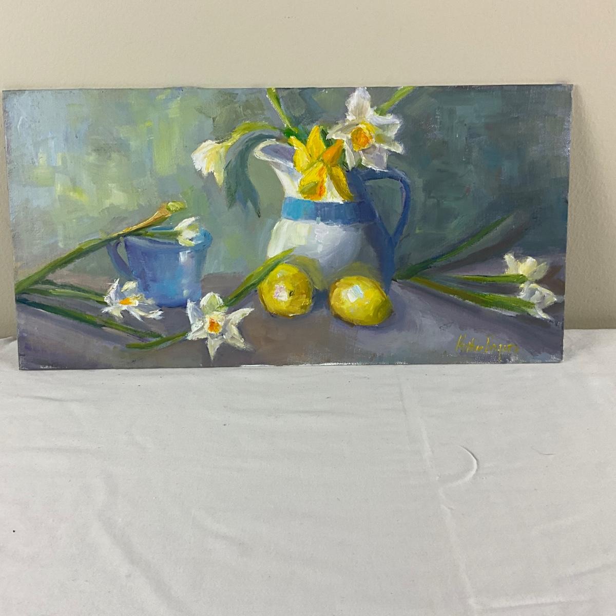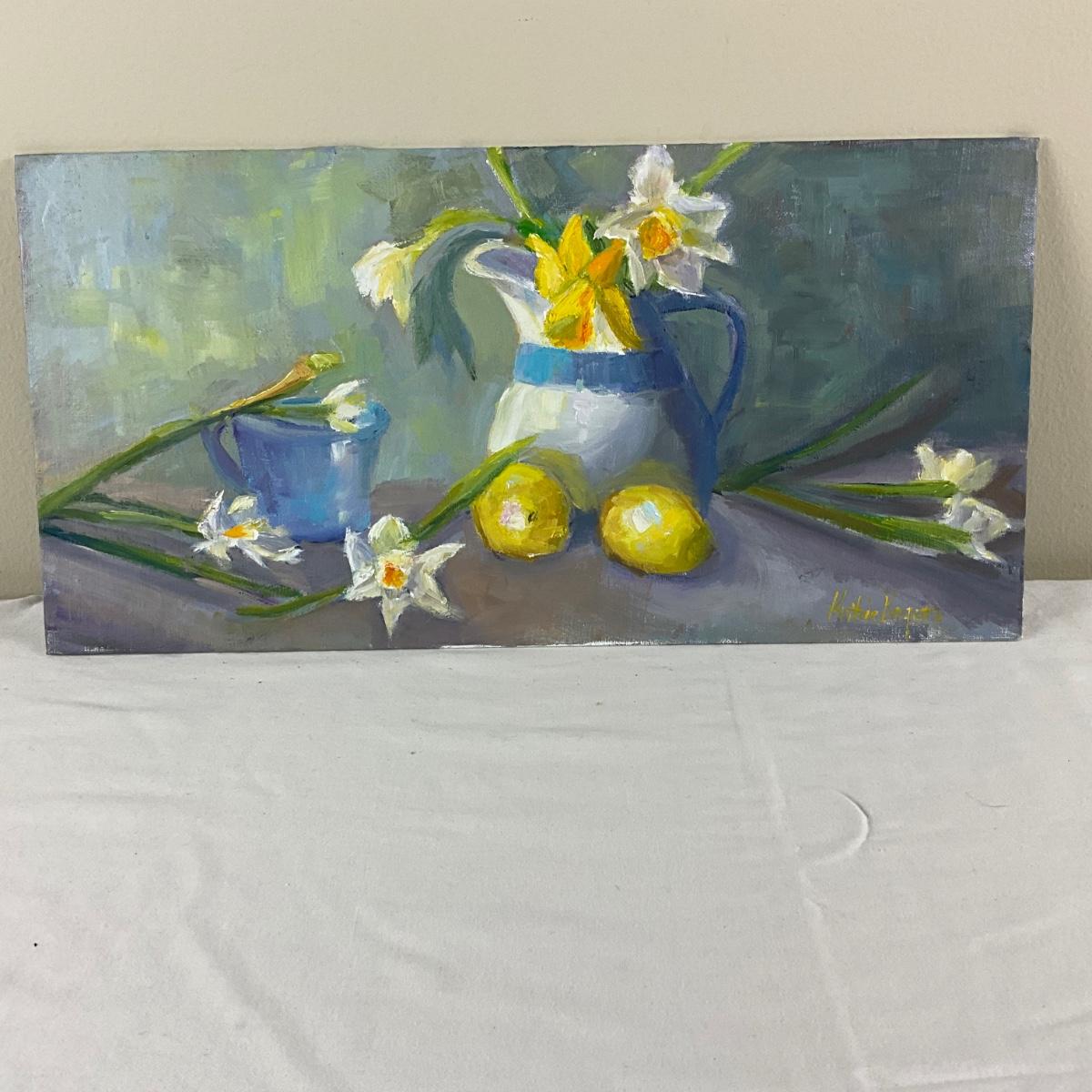 122 Original Oil Painting Still Life Daffodils with Blue White Pitcher by Kathie Rogers