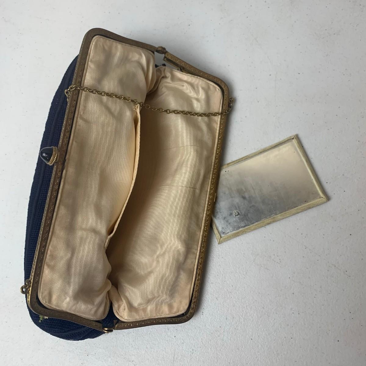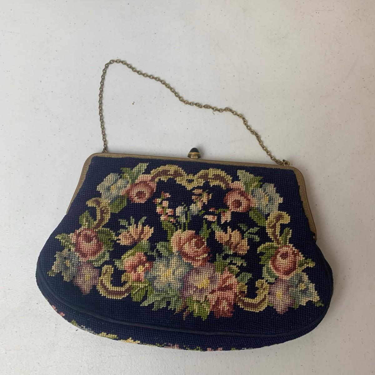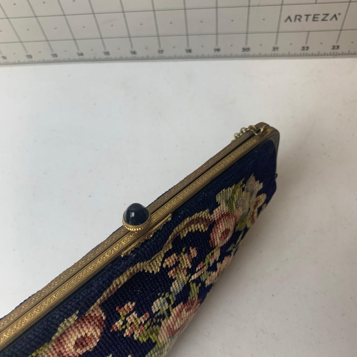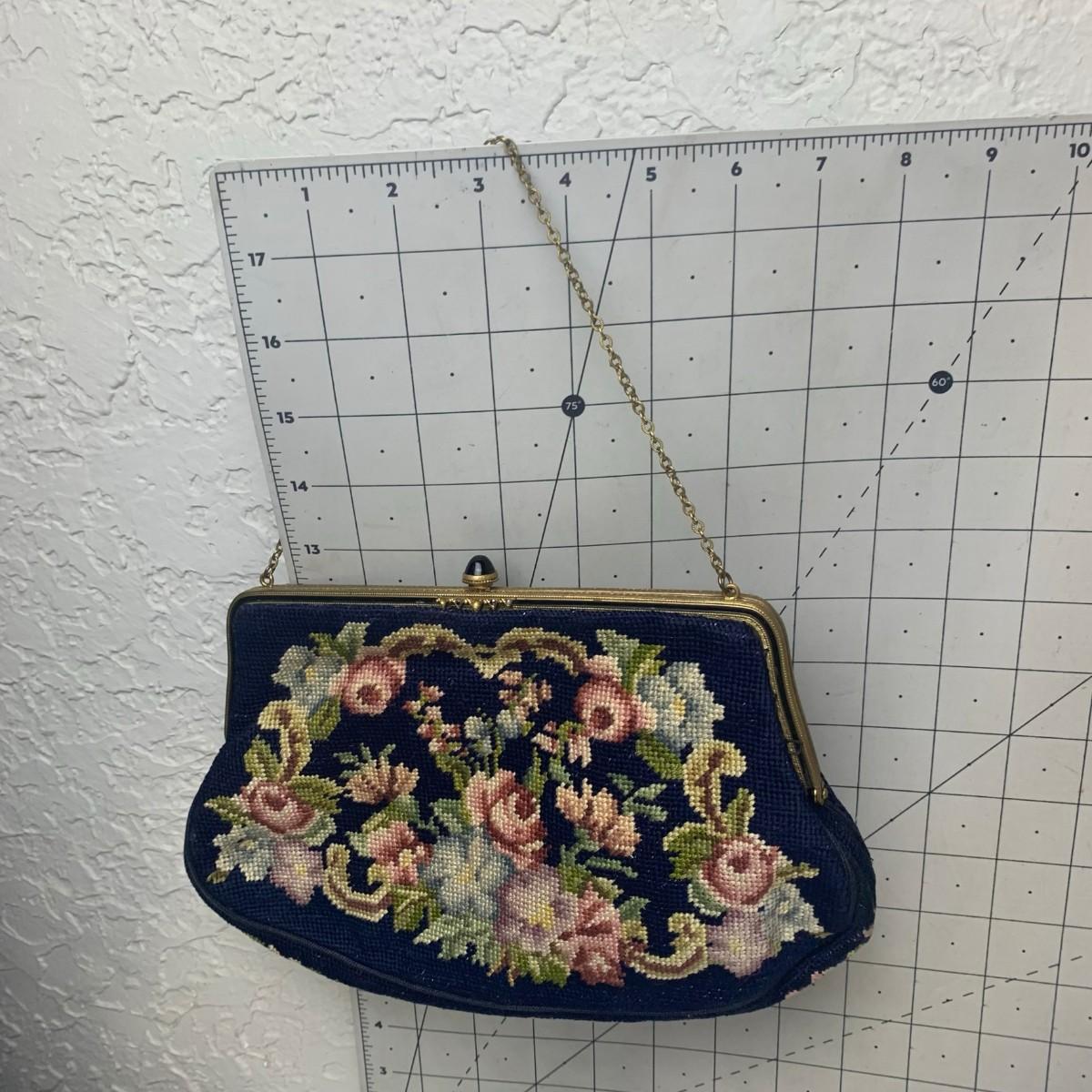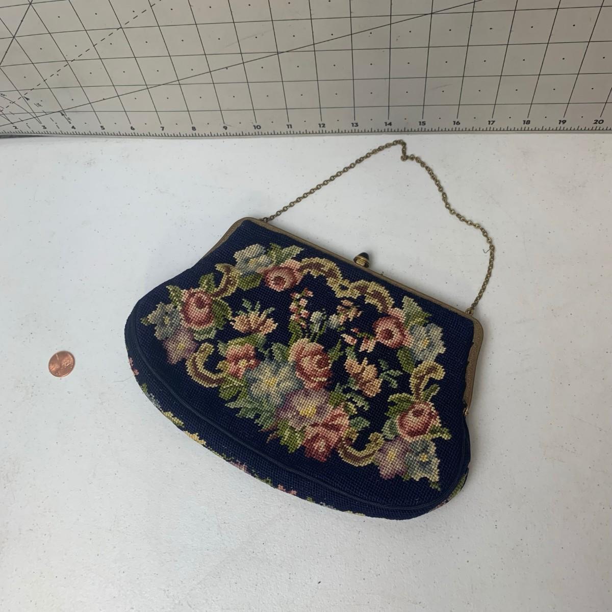 #122 Petite Floral Needlepoint Purse - Vintage Blue Floral With Brass Frame