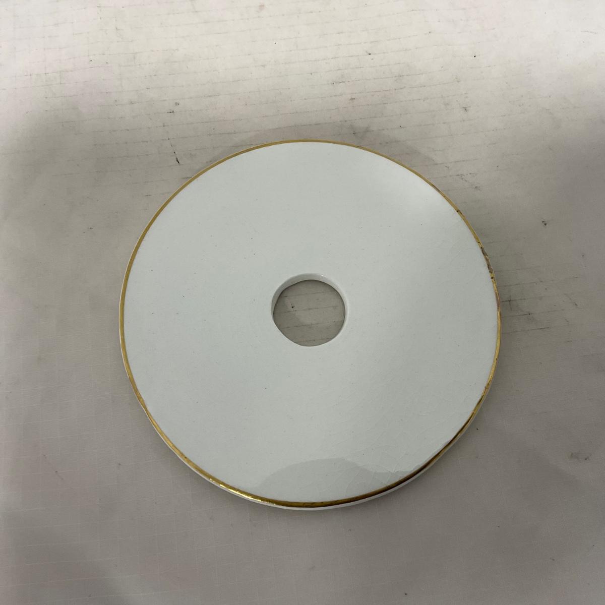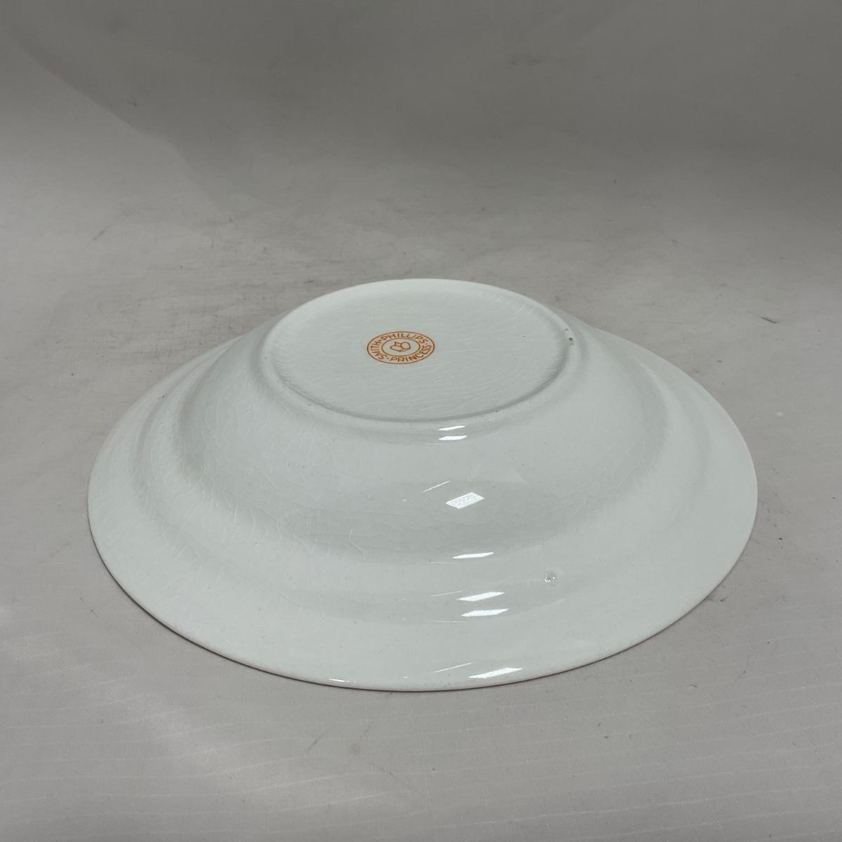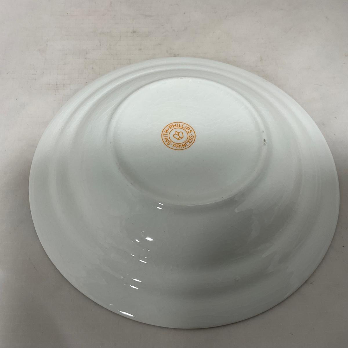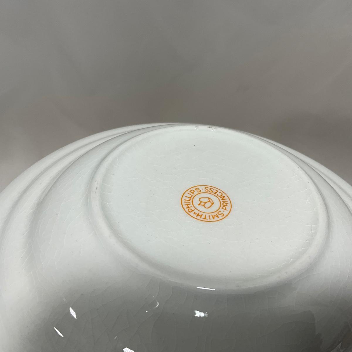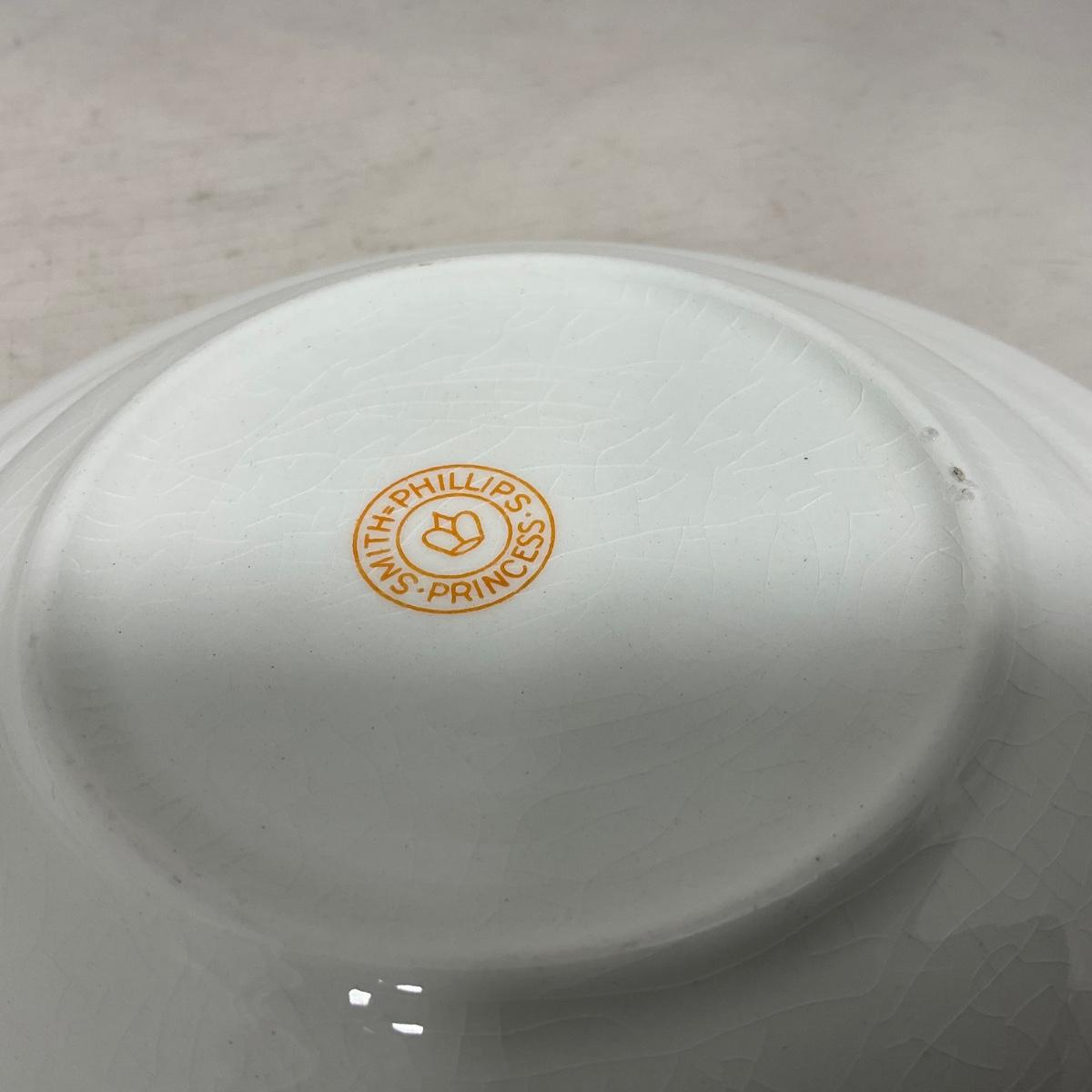 One White with gold accent covered butter dish with insert. Butter dish is well loved and may have colored fading. Piece is marked Smith Phillips Princess. Please see photos for details and condition. ::: Shipping is available on this lot. If you require shipping you must let us know at the close of the auction. We will coordinate with you after the item has been won. Shipping fees will include insurance up to or exceeding the value of all items being mailed. If you have any questions regarding this lot please contact the auctioneer either via this website, by direct email or by phone. PICK UP TIMES and other important information can be found in the TERMS and DESCRIPTION of the auction. Please take a look for pertinent information. Thanks!