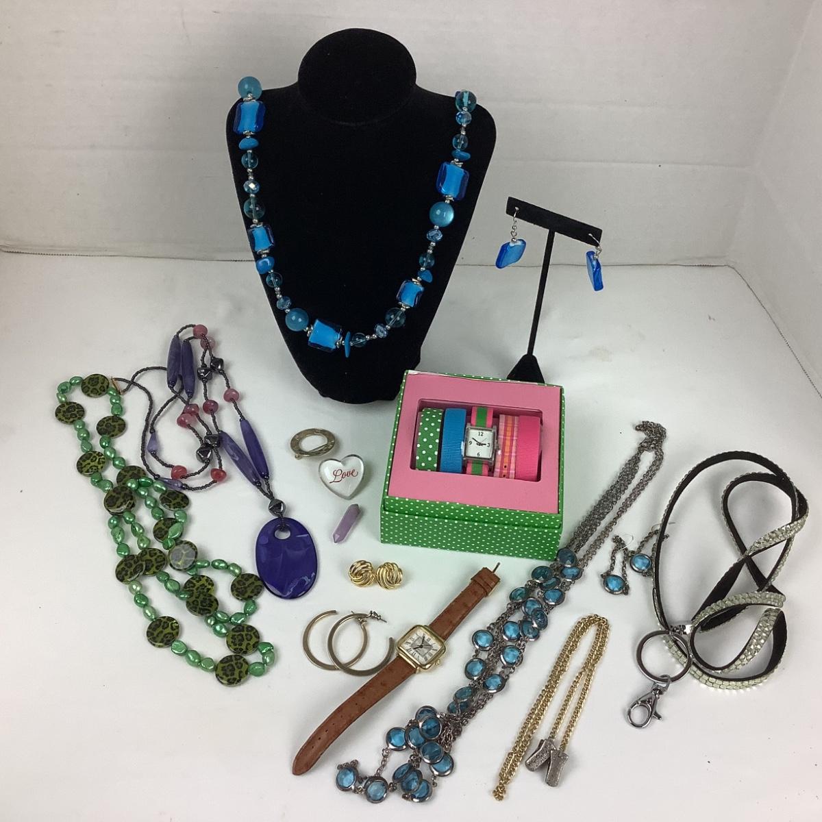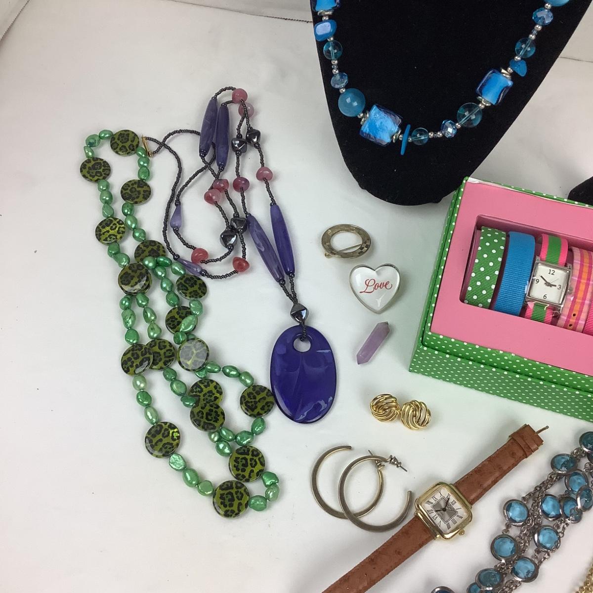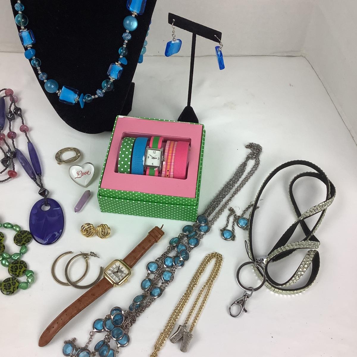 Assorted necklaces, earrings, 2 watches.