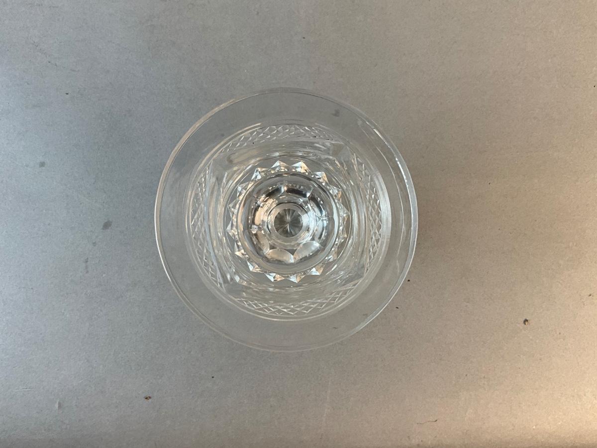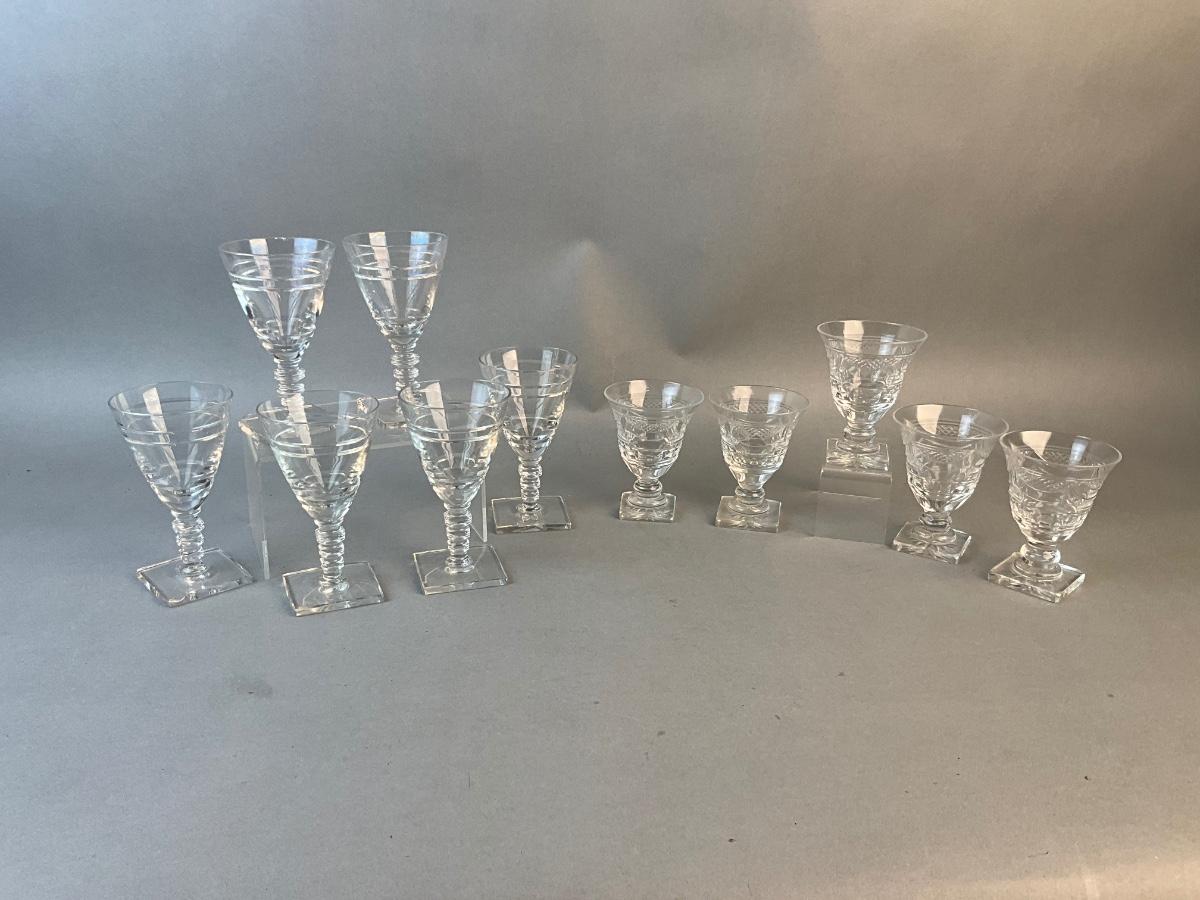 Set of 5 square base goblets with etched and cut design measuring 4" high x 3" diameter